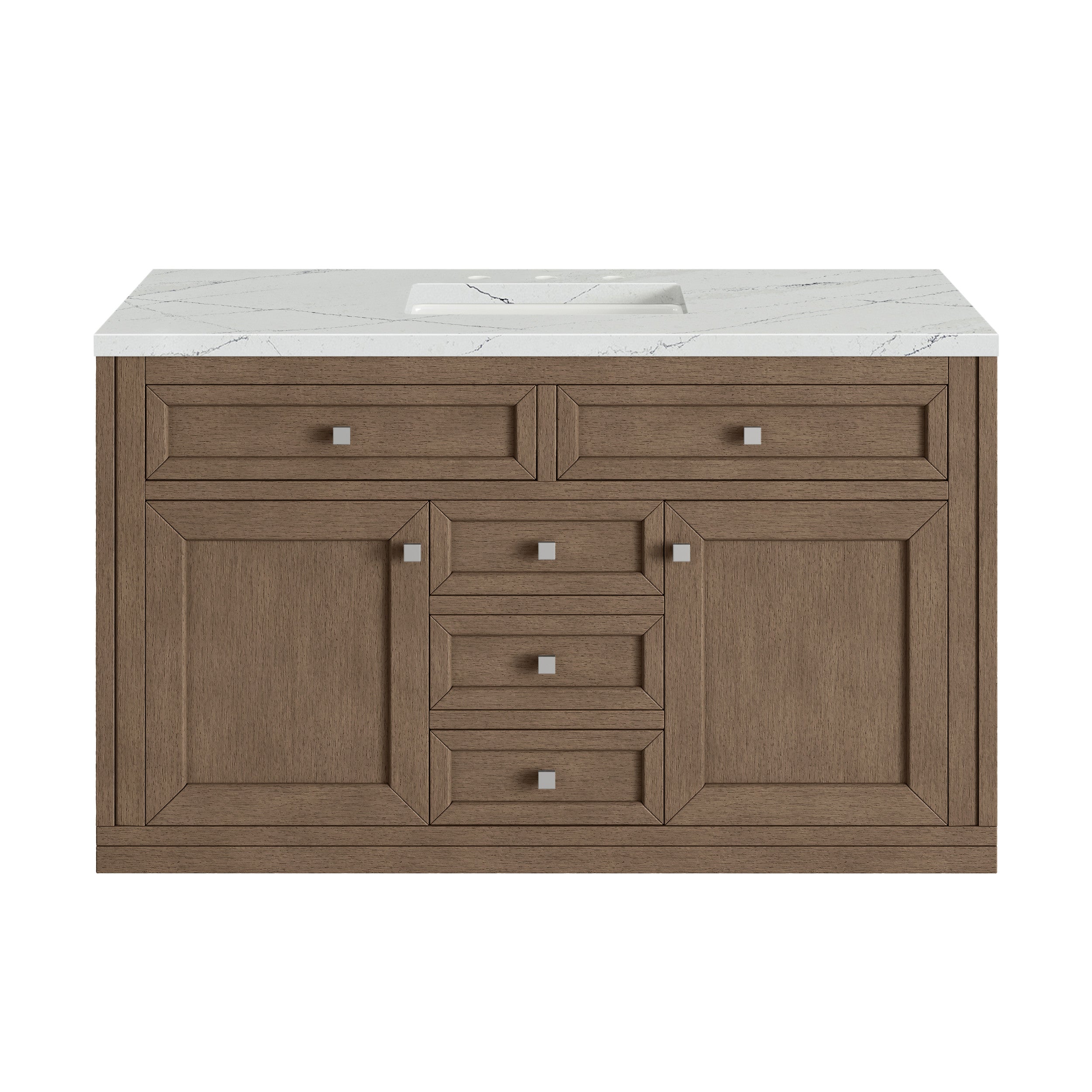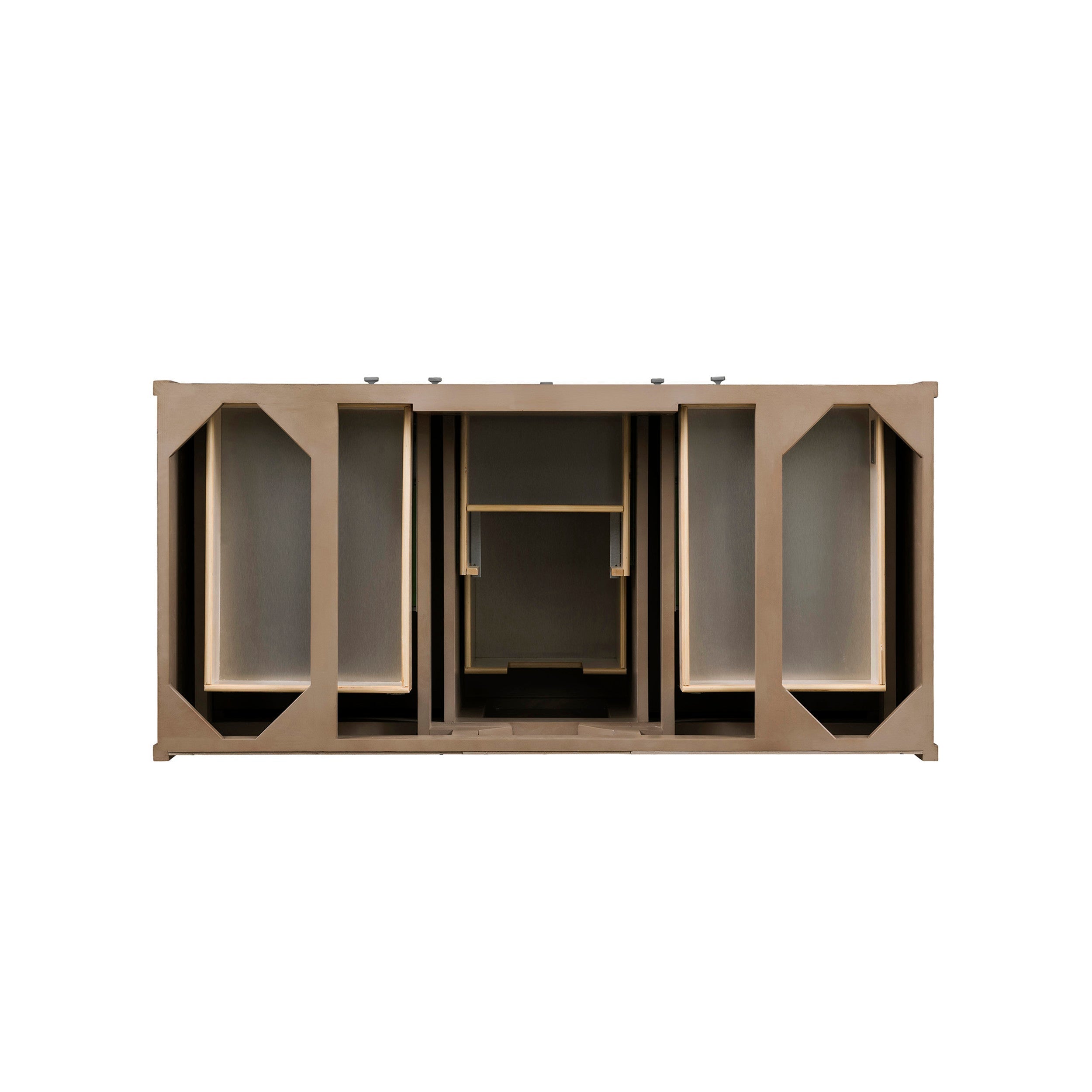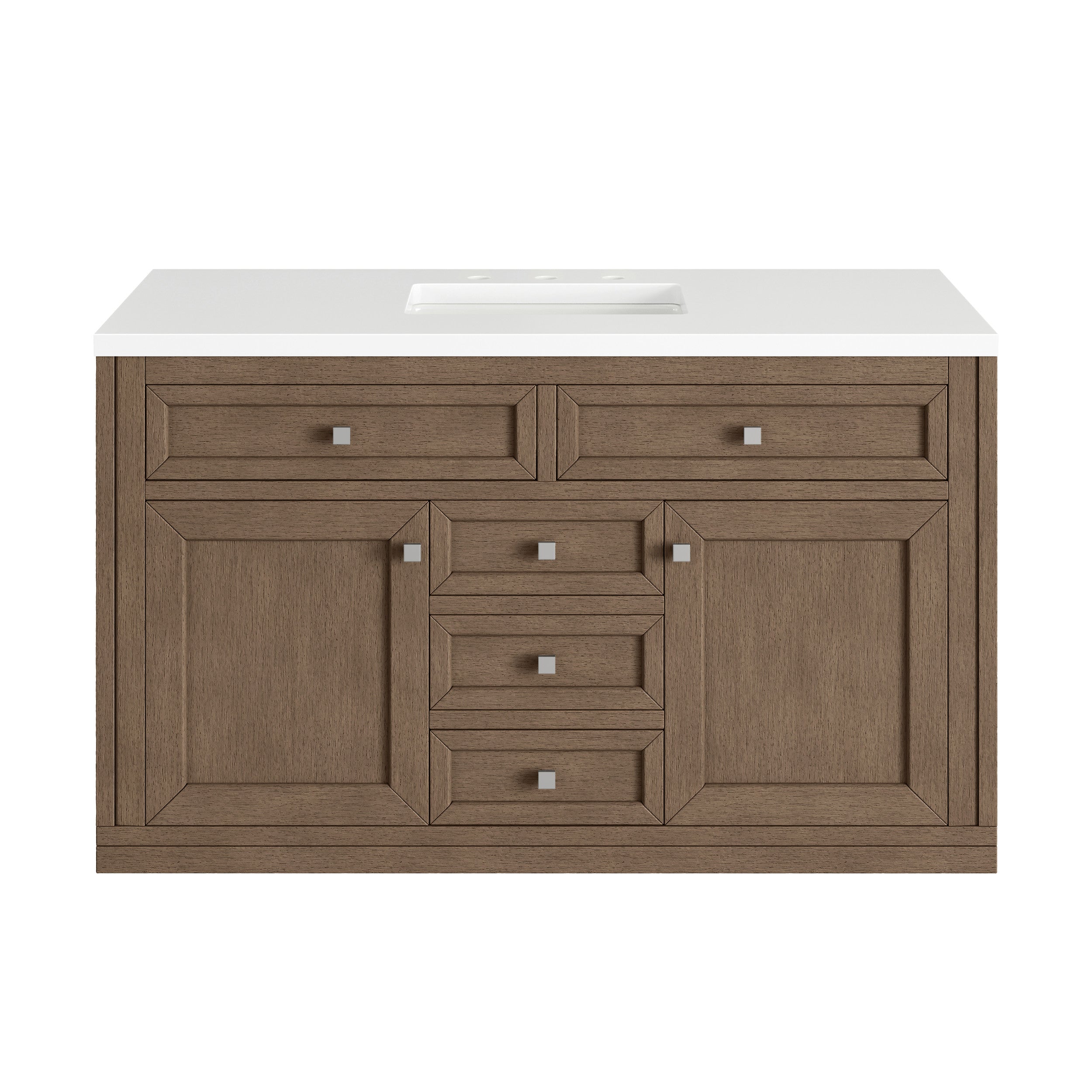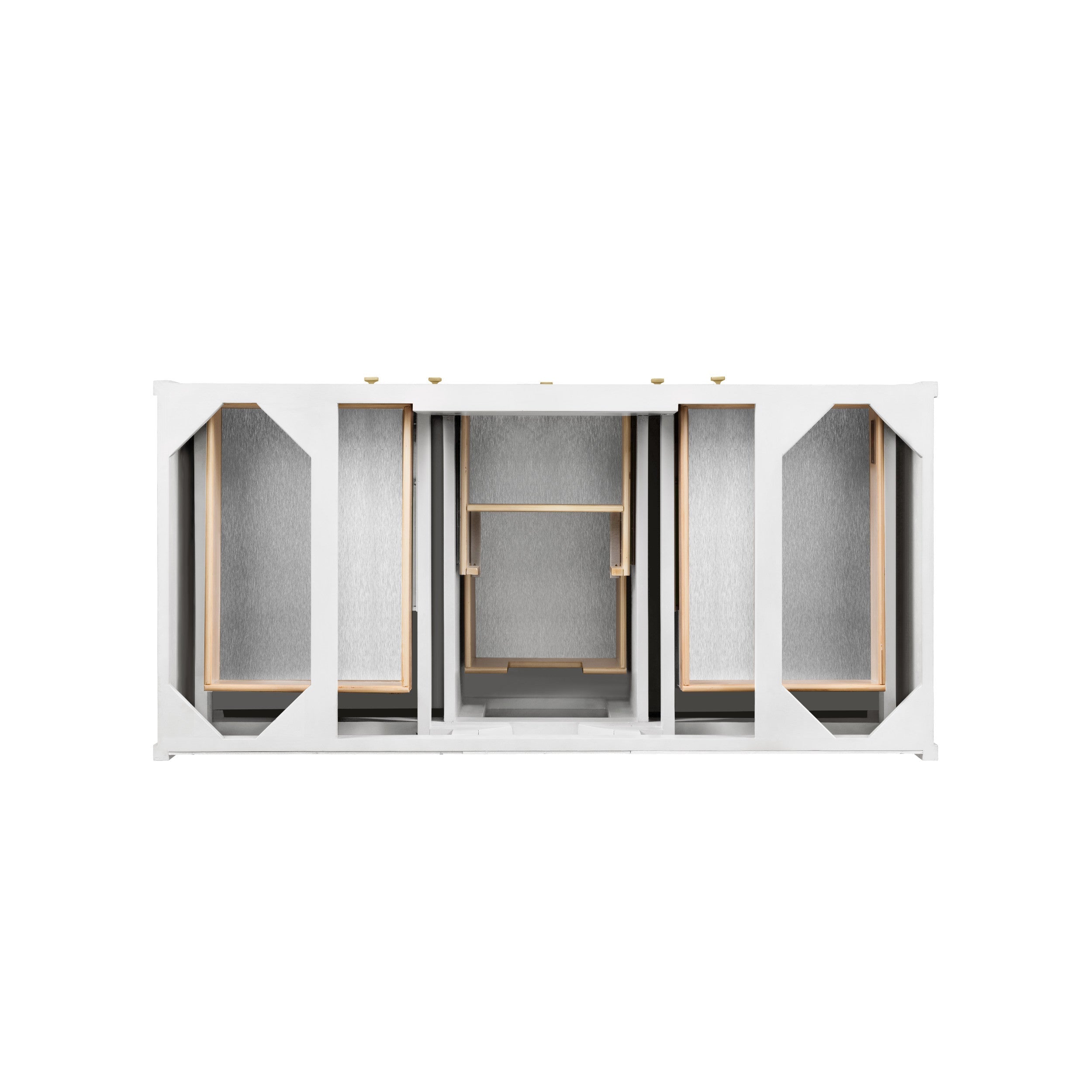 The cathedral grain White Oak veneers and modern panel detailing on the doors and return panels give the Hudson collection the look of fine furnishings that is unexpected yet welcome for the bathroom space. The 60" Hudson Double Vanity features three generous drawers and one removable bamboo storage organizer tray, allowing for optimum organization. The right side door opens to reveal a convenient dual-power USB outlet while the left door conceals an additional drawer. The 3 CM Arctic Fall Solid Surface top provides the perfect final touch.