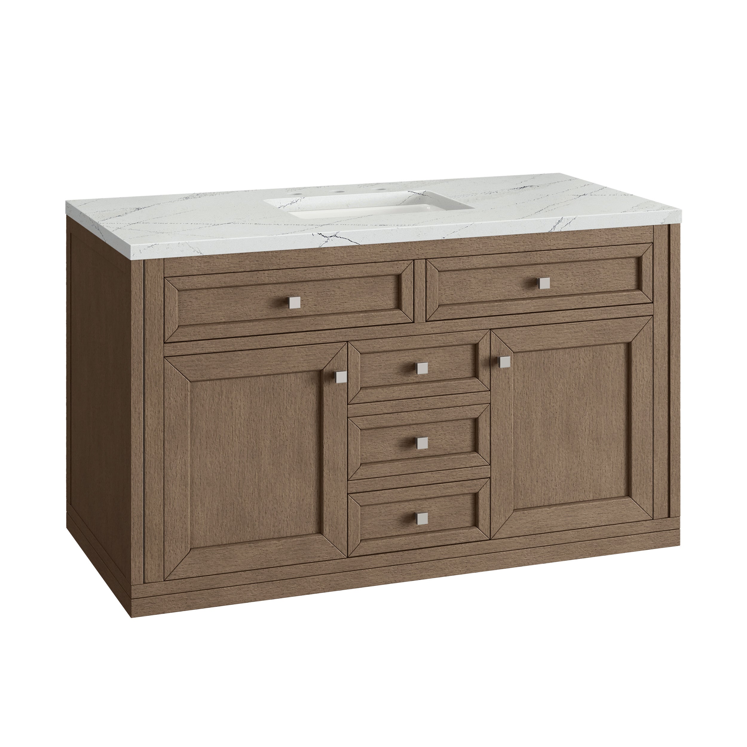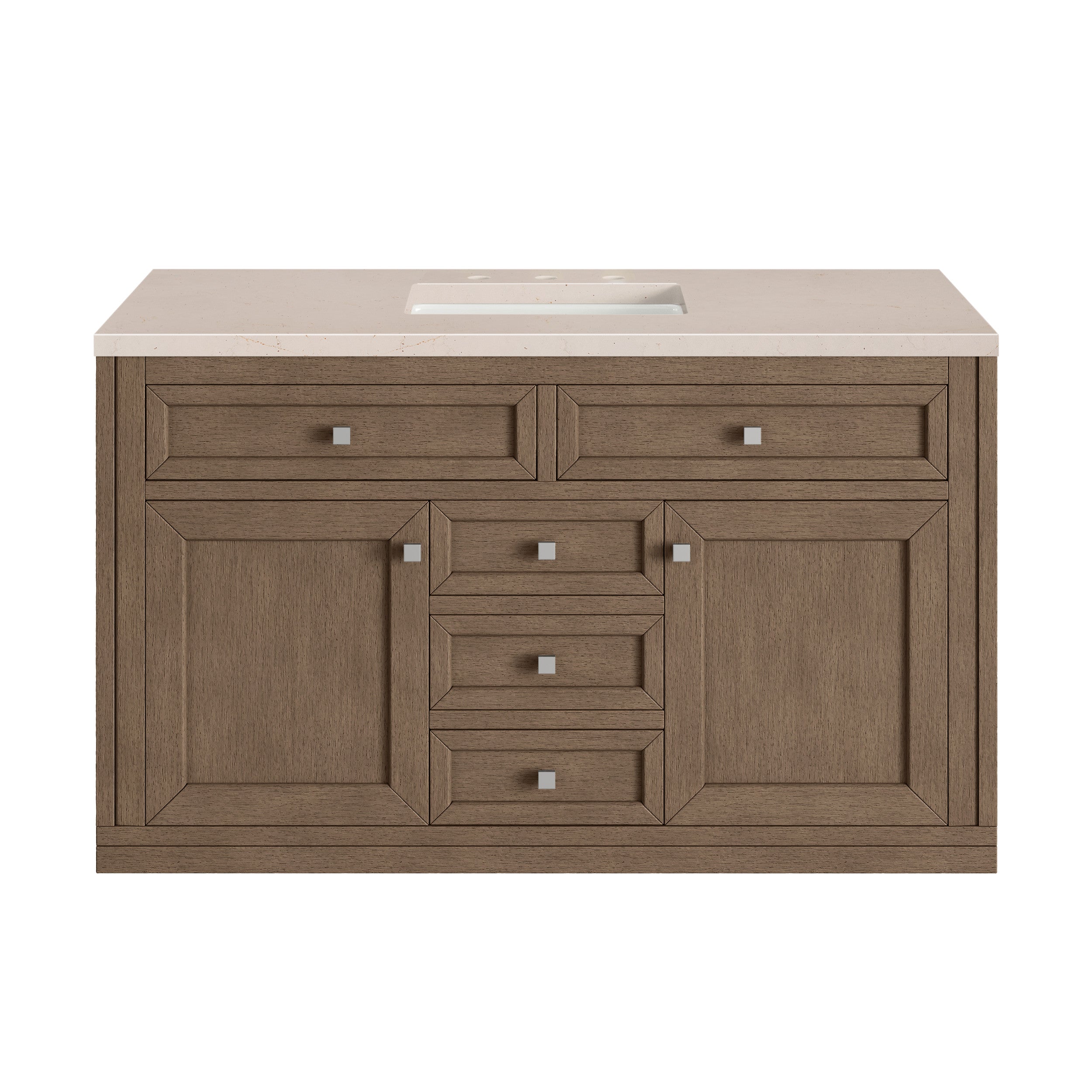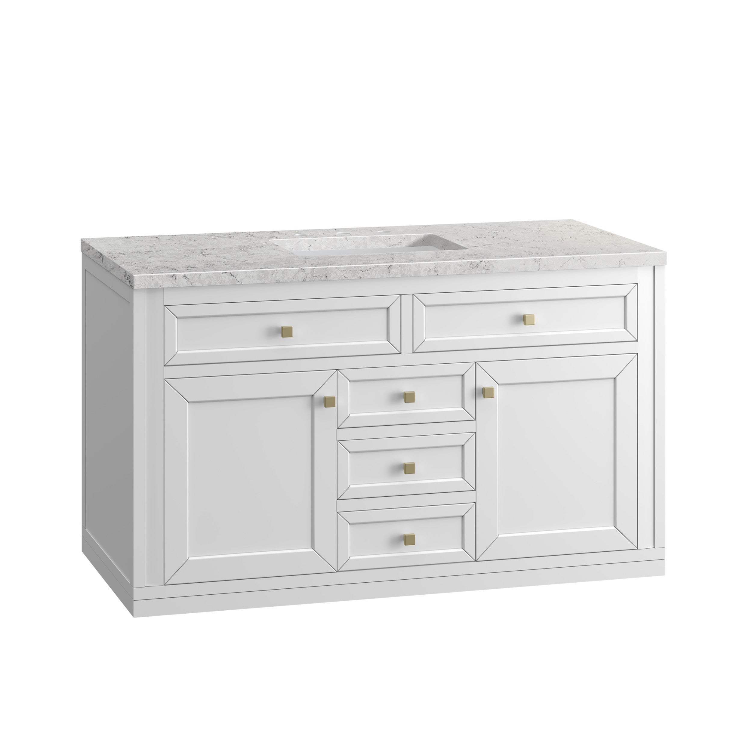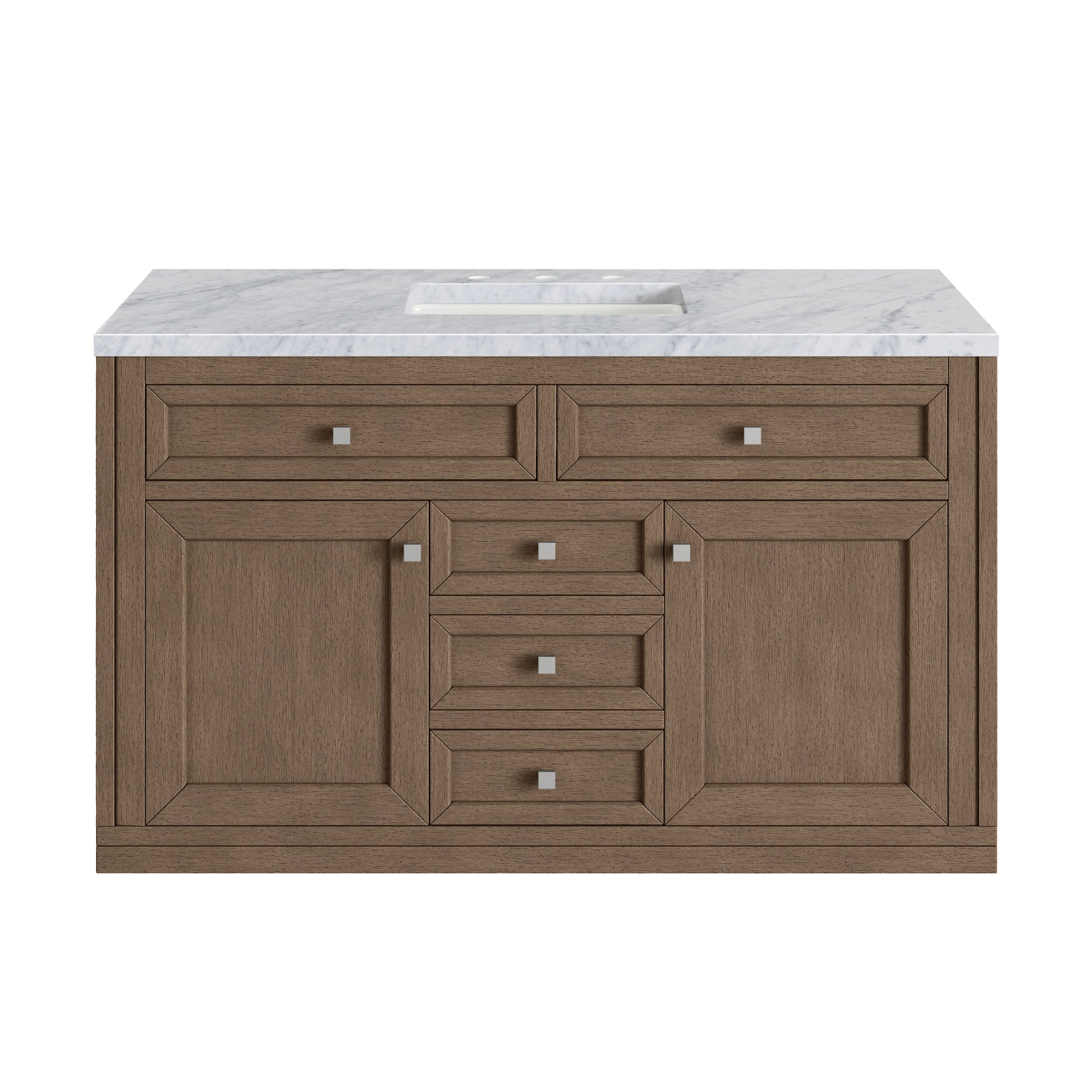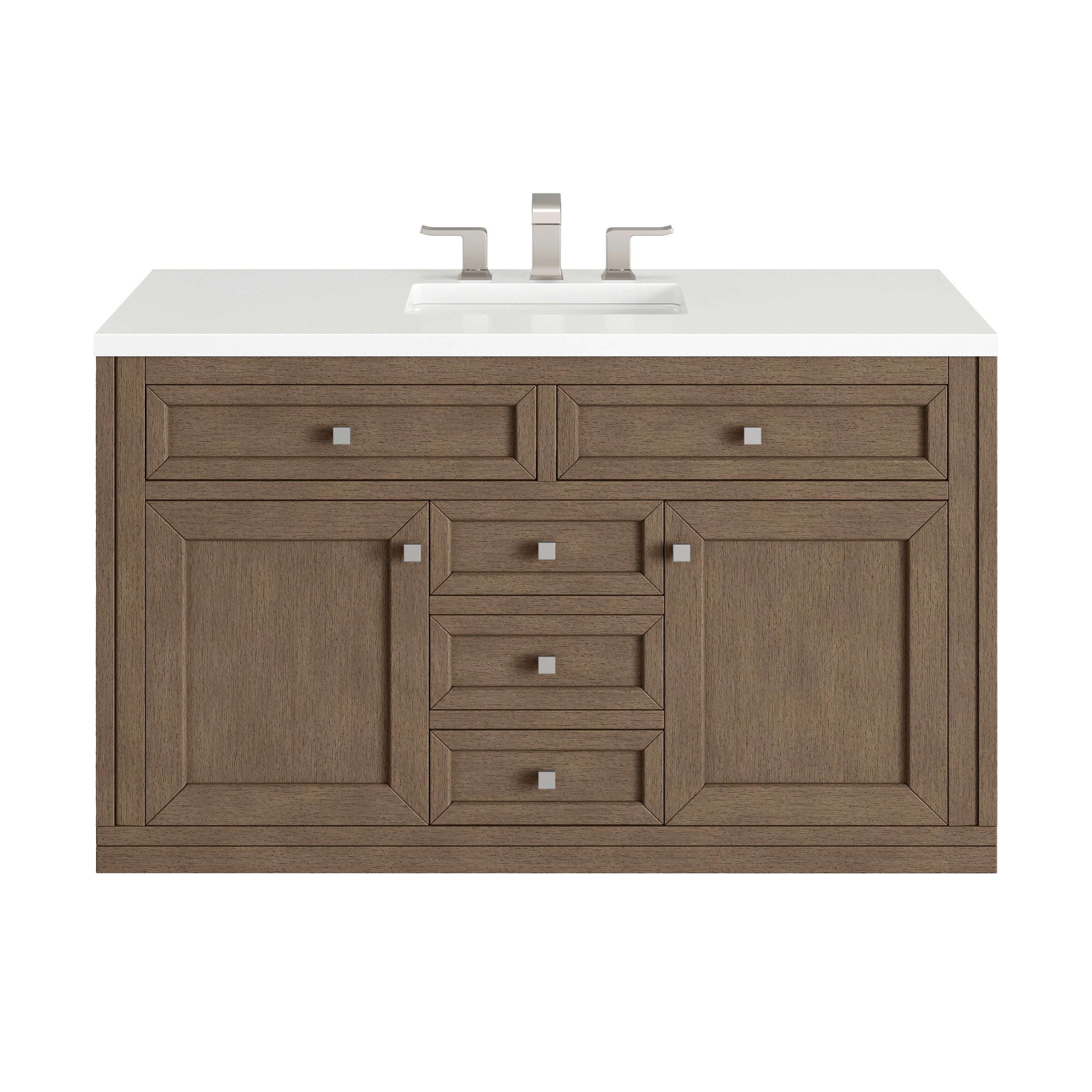 The cathedral grain White Oak veneers and modern panel detailing on the doors and return panels give the Hudson collection the look of fine furnishings that is unexpected yet welcome for the bathroom space. The 60" Hudson Double Vanity features three generous drawers and one removable bamboo storage organizer tray, allowing for optimum organization. The right side door opens to reveal a convenient dual-power USB outlet while the left door conceals an additional drawer. The 3 CM Arctic Fall Solid Surface top provides the perfect final touch.