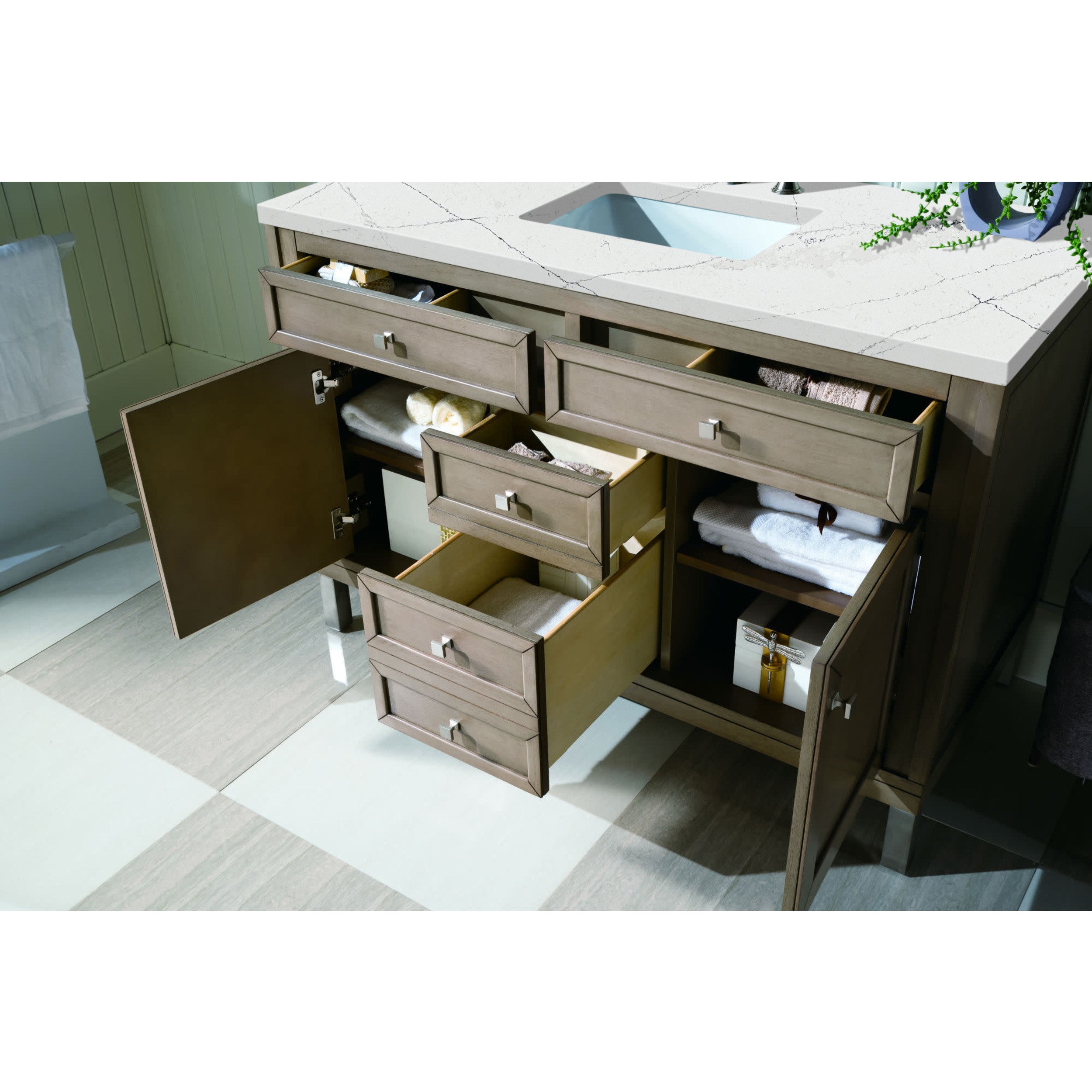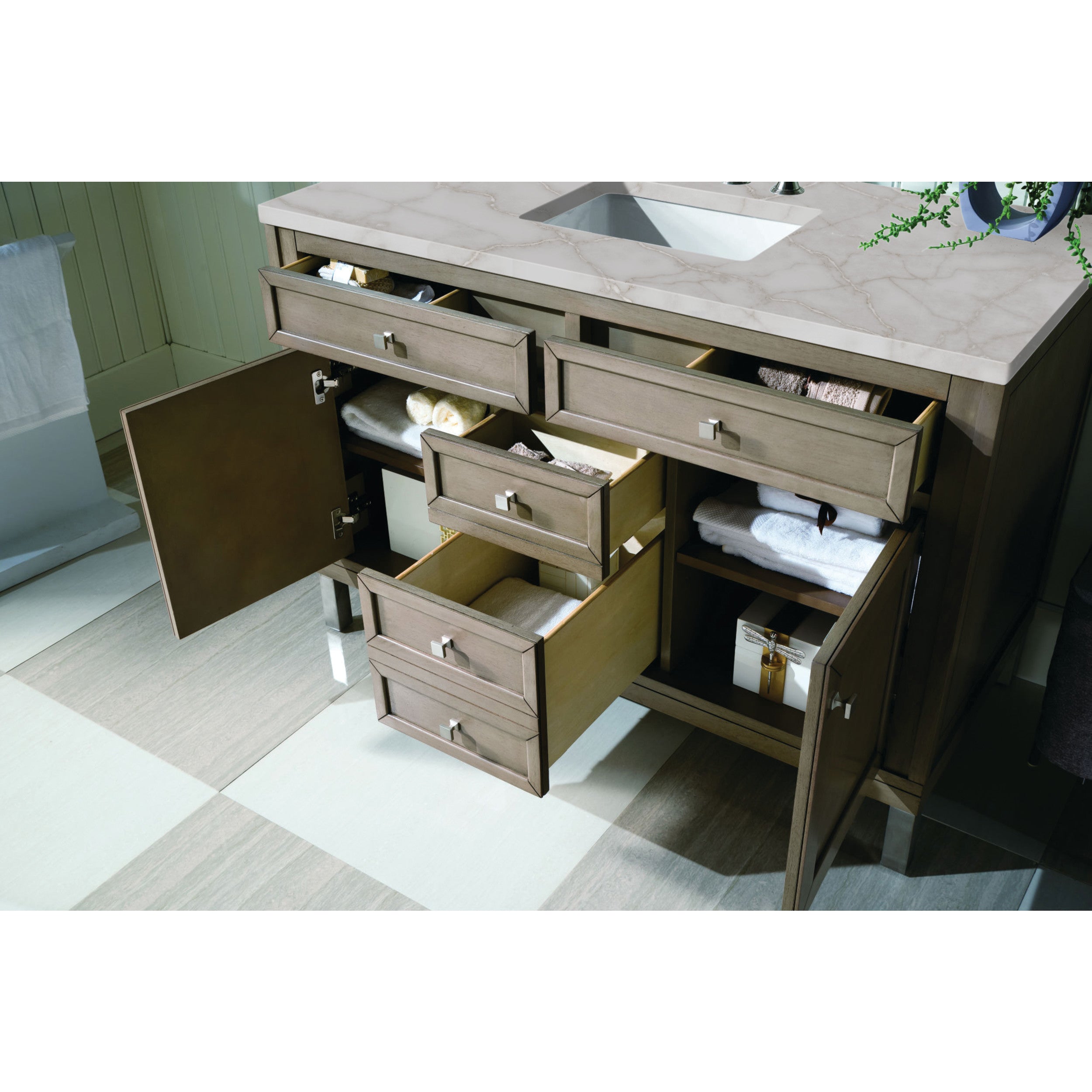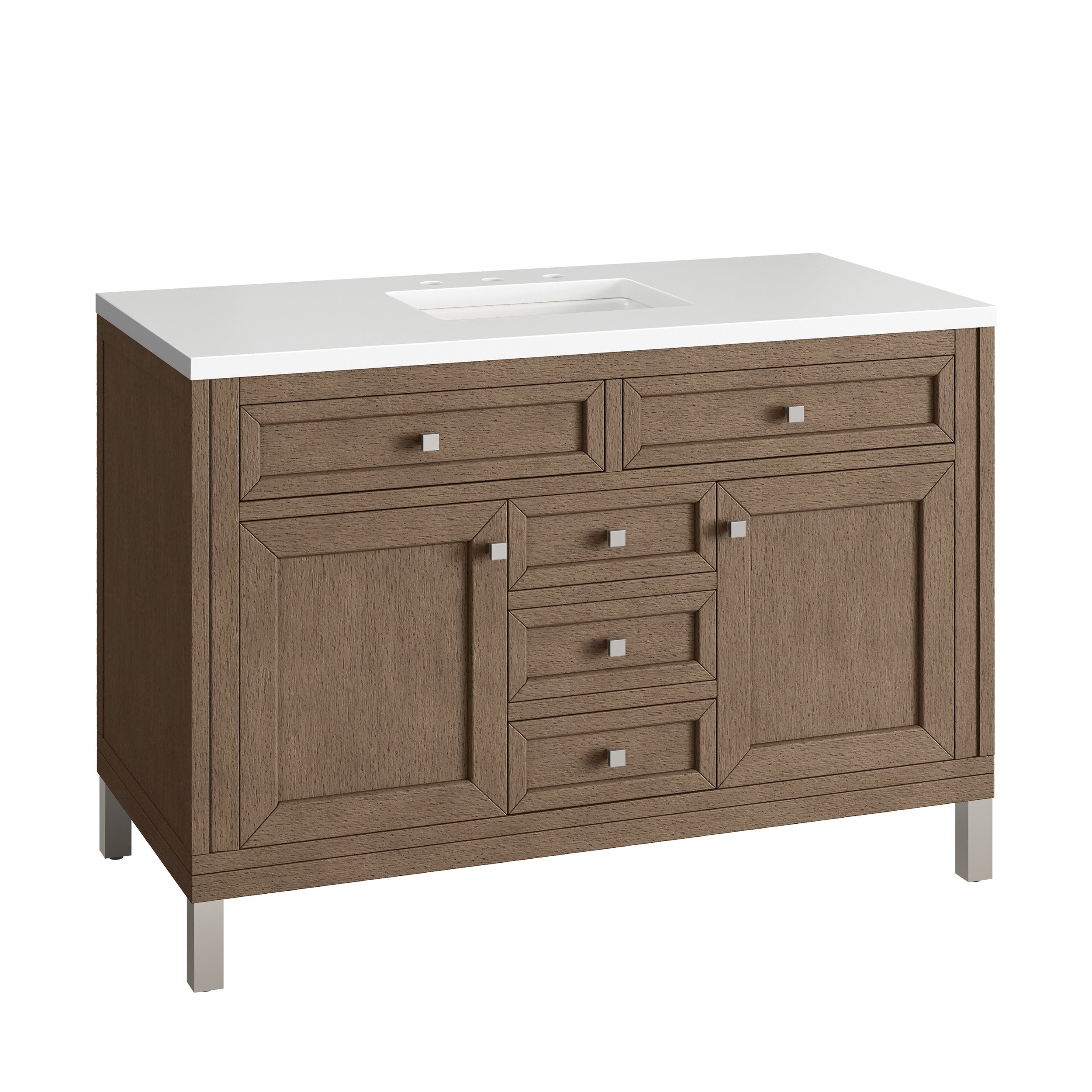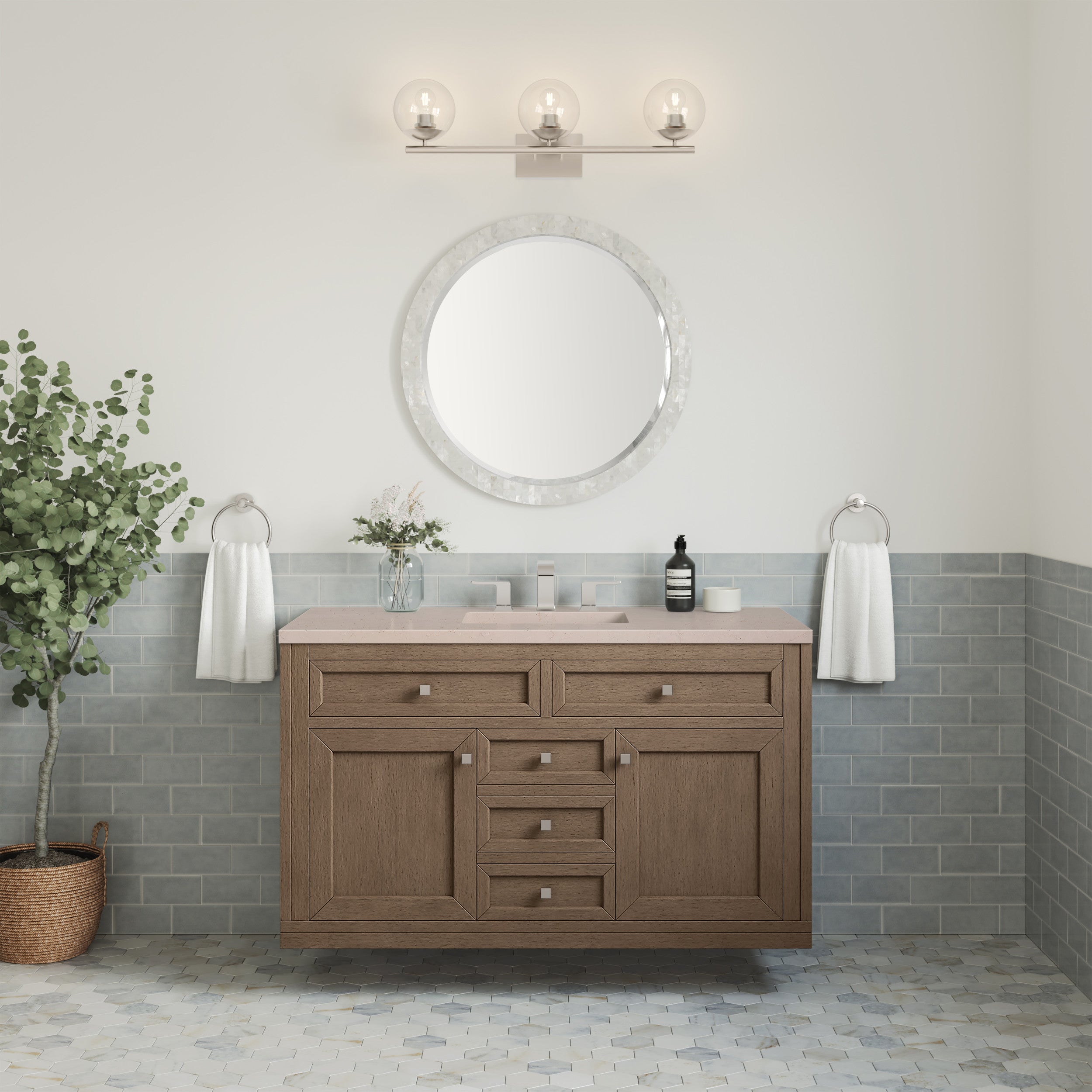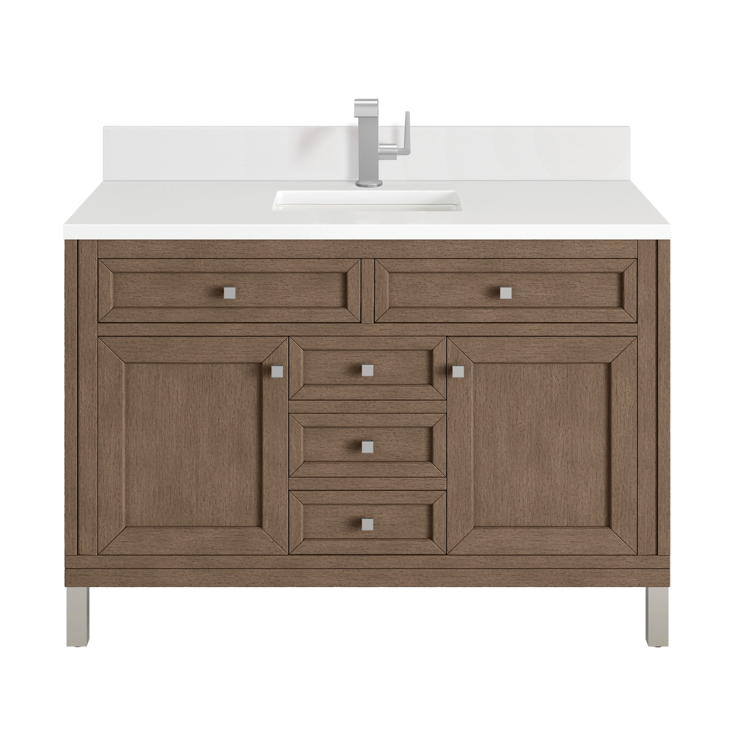 The cathedral grain White Oak veneers and modern panel detailing on the doors and return panels give the Hudson collection the look of fine furnishings that is unexpected yet welcome for the bathroom space. The 60" Hudson Double Vanity features three generous drawers and one removable bamboo storage organizer tray, allowing for optimum organization. The right side door opens to reveal a convenient dual-power USB outlet while the left door conceals an additional drawer. The 3 CM Arctic Fall Solid Surface top provides the perfect final touch.