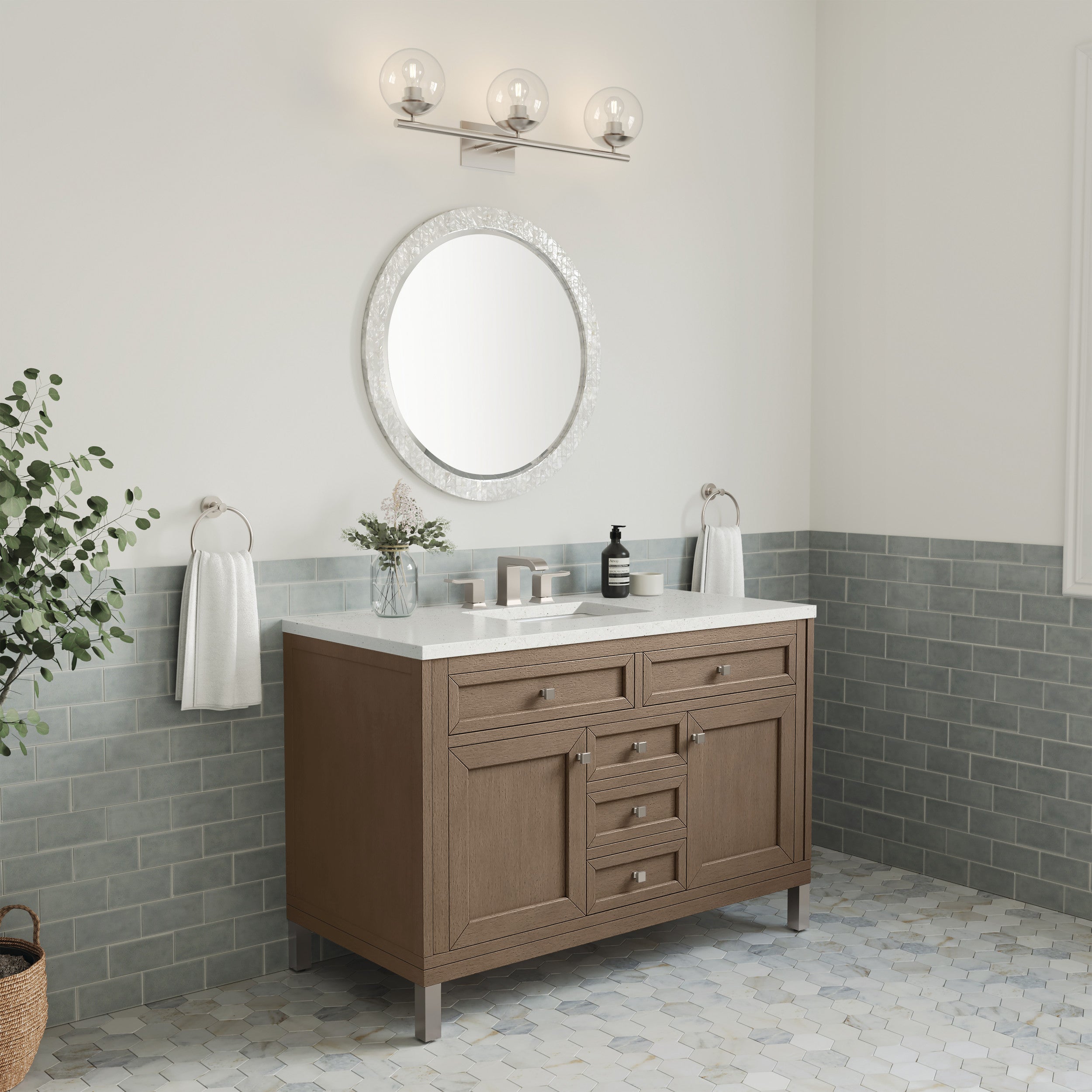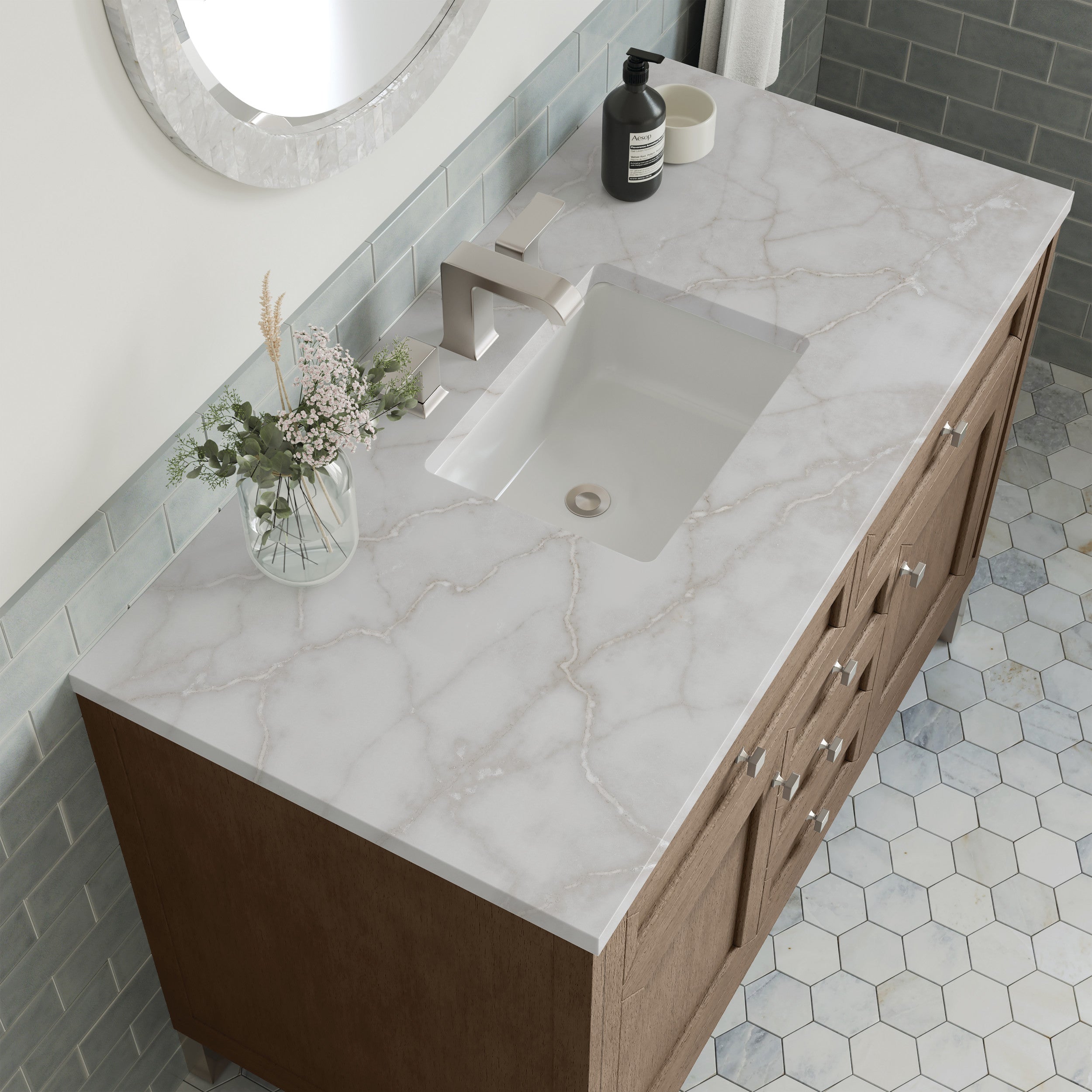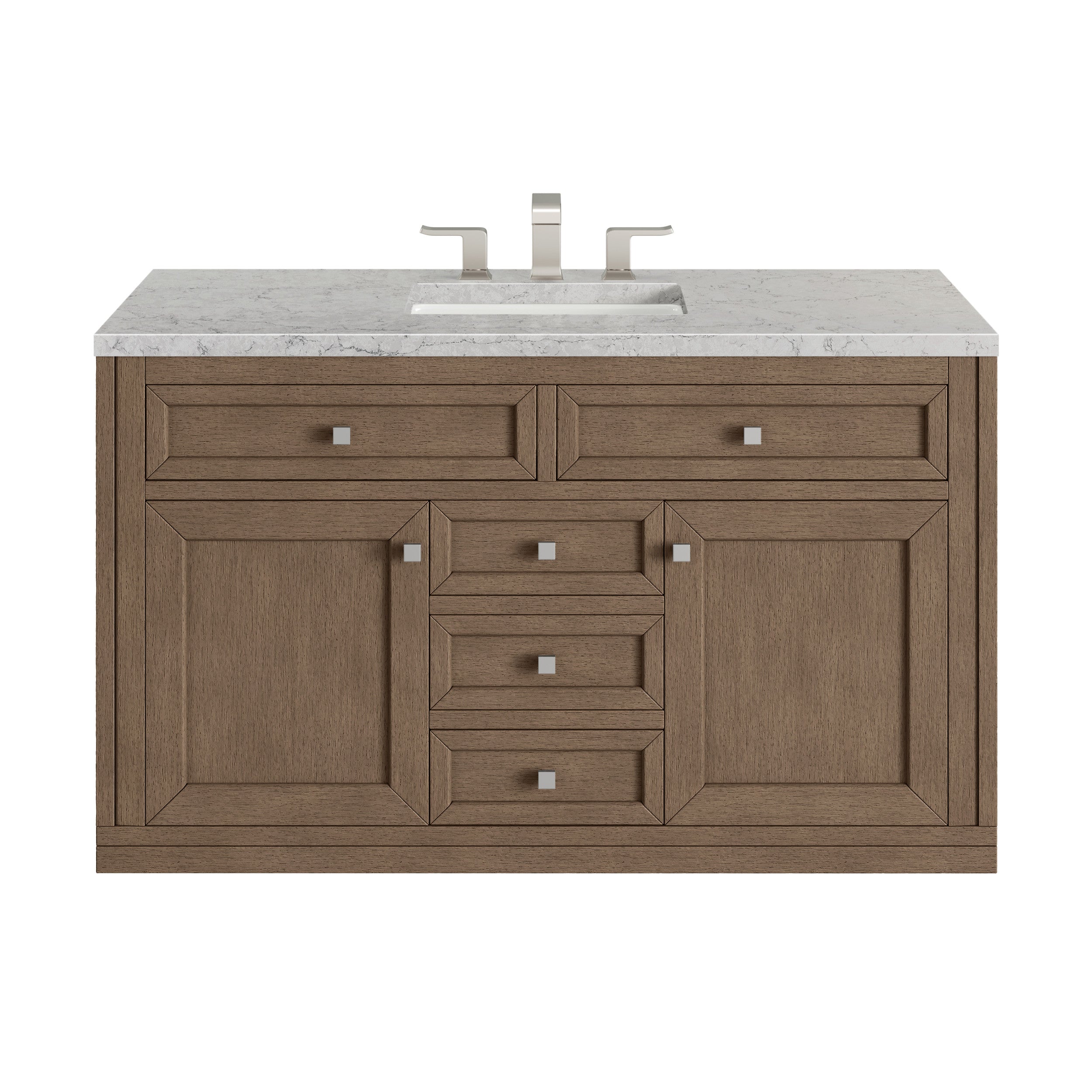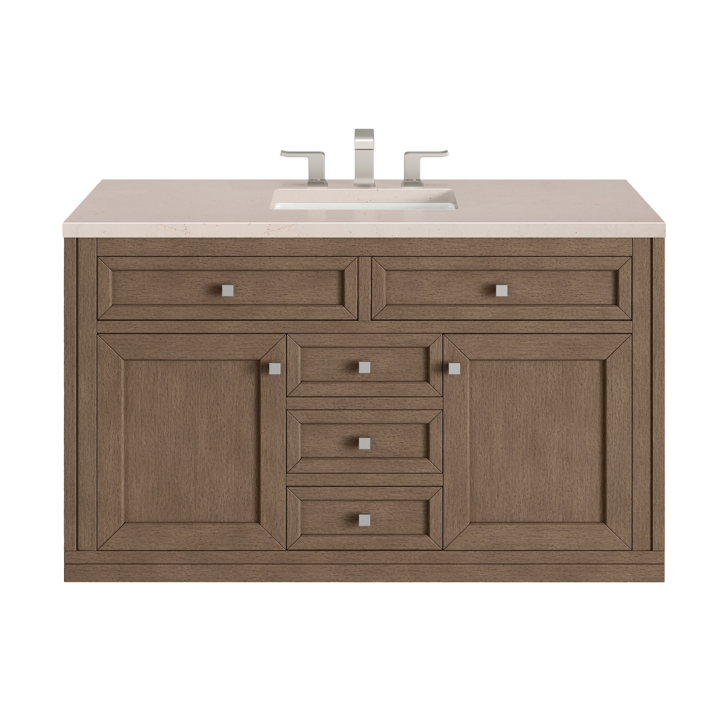 The cathedral grain White Oak veneers and modern panel detailing on the doors and return panels give the Hudson collection the look of fine furnishings that is unexpected yet welcome for the bathroom space. The 60" Hudson Double Vanity features three generous drawers and one removable bamboo storage organizer tray, allowing for optimum organization. The right side door opens to reveal a convenient dual-power USB outlet while the left door conceals an additional drawer. The 3 CM Arctic Fall Solid Surface top provides the perfect final touch.