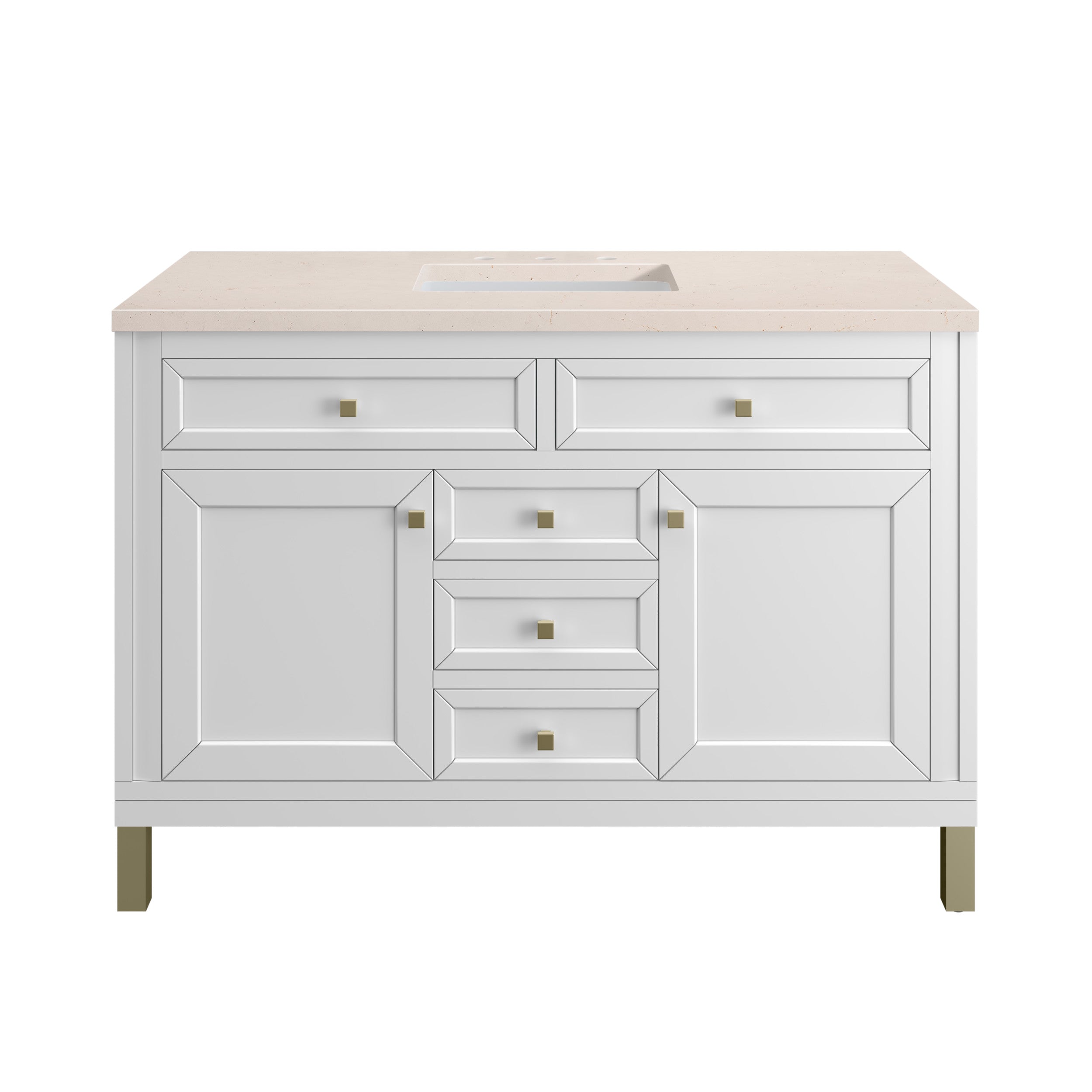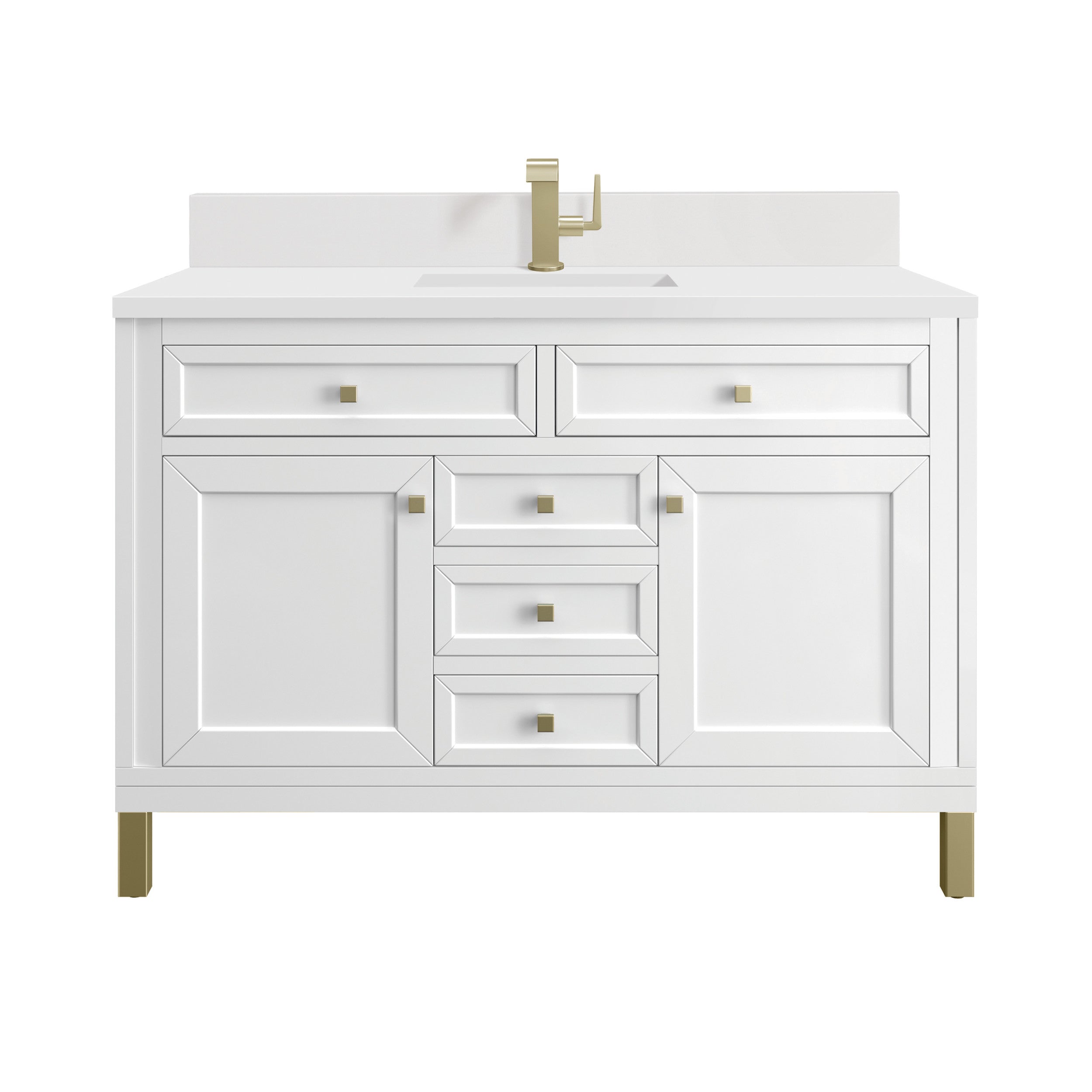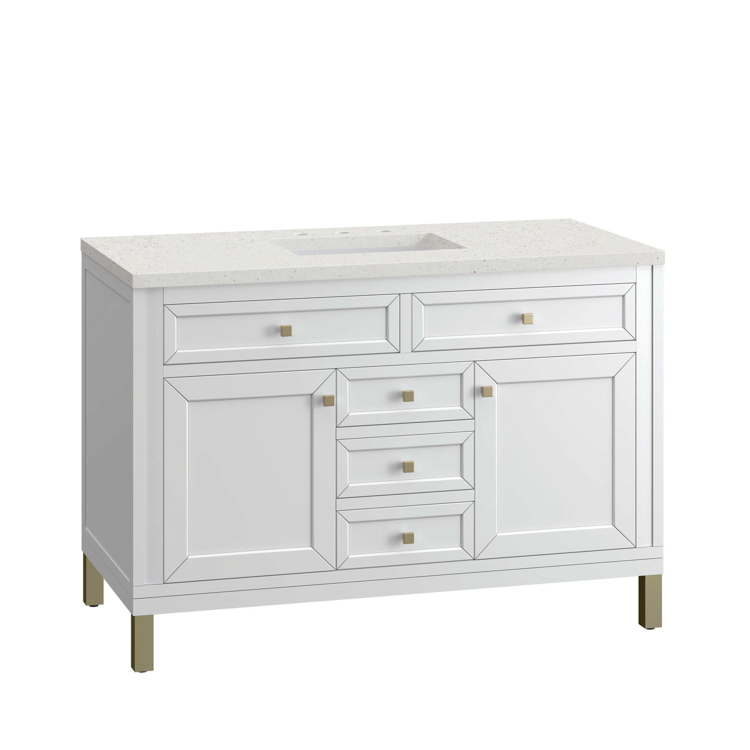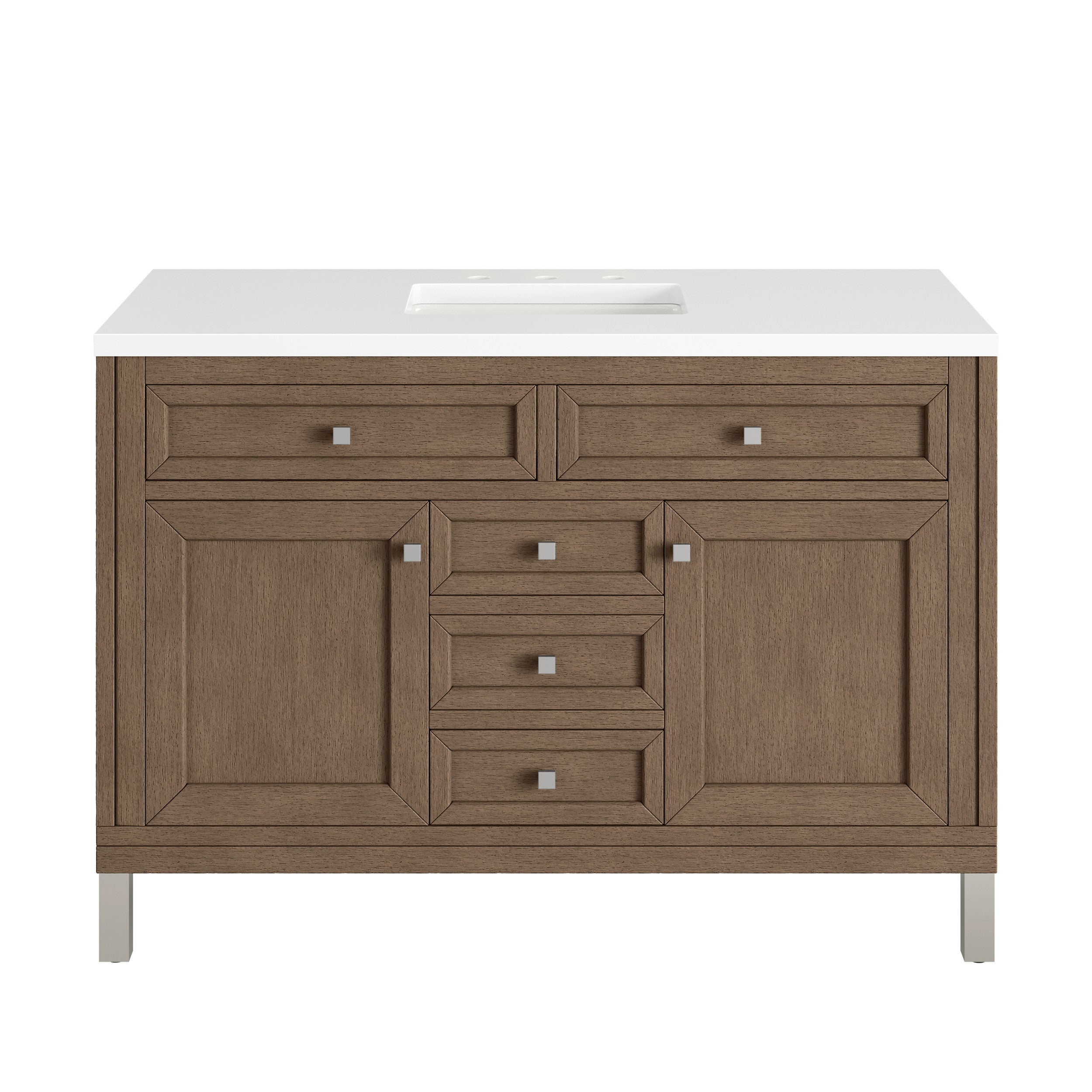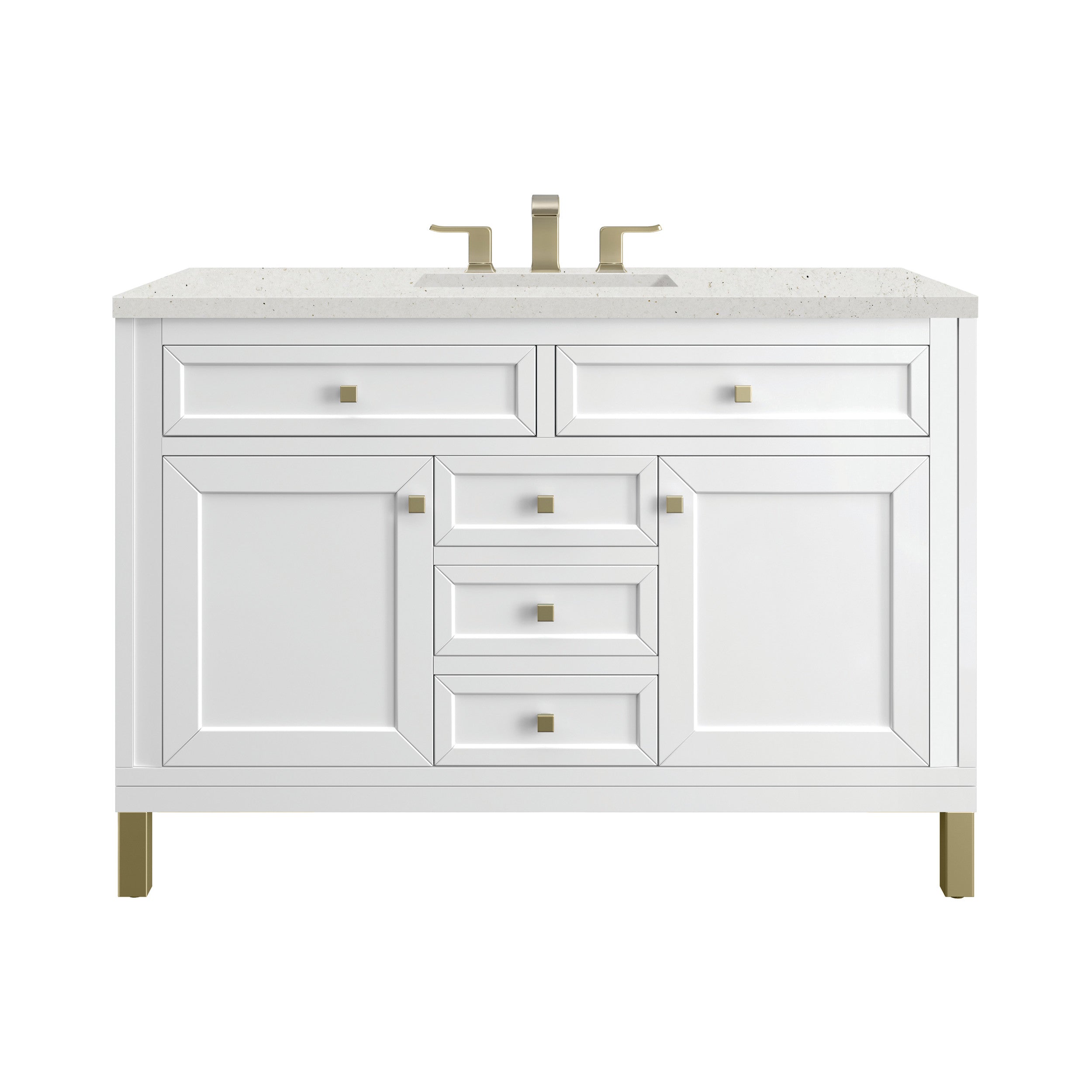A sophisticated pairing of Mid-Century modern and Farmhouse styles, the Hudson collection stands out with a sleek paneled design. The cathedral woodgrain is accented with Champagne Brass knobs. Housing ample storage, this collection perfectly balances practicality and chic detailing.