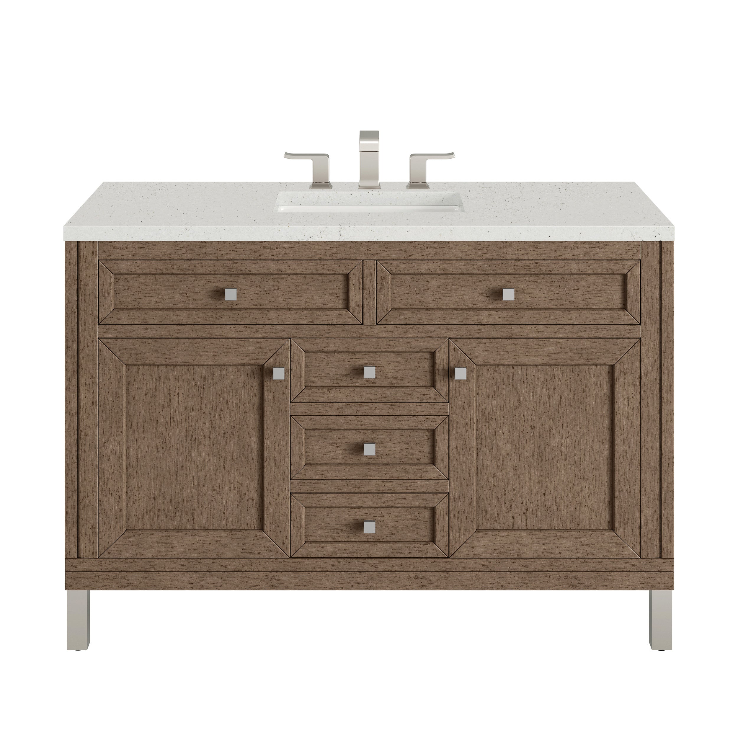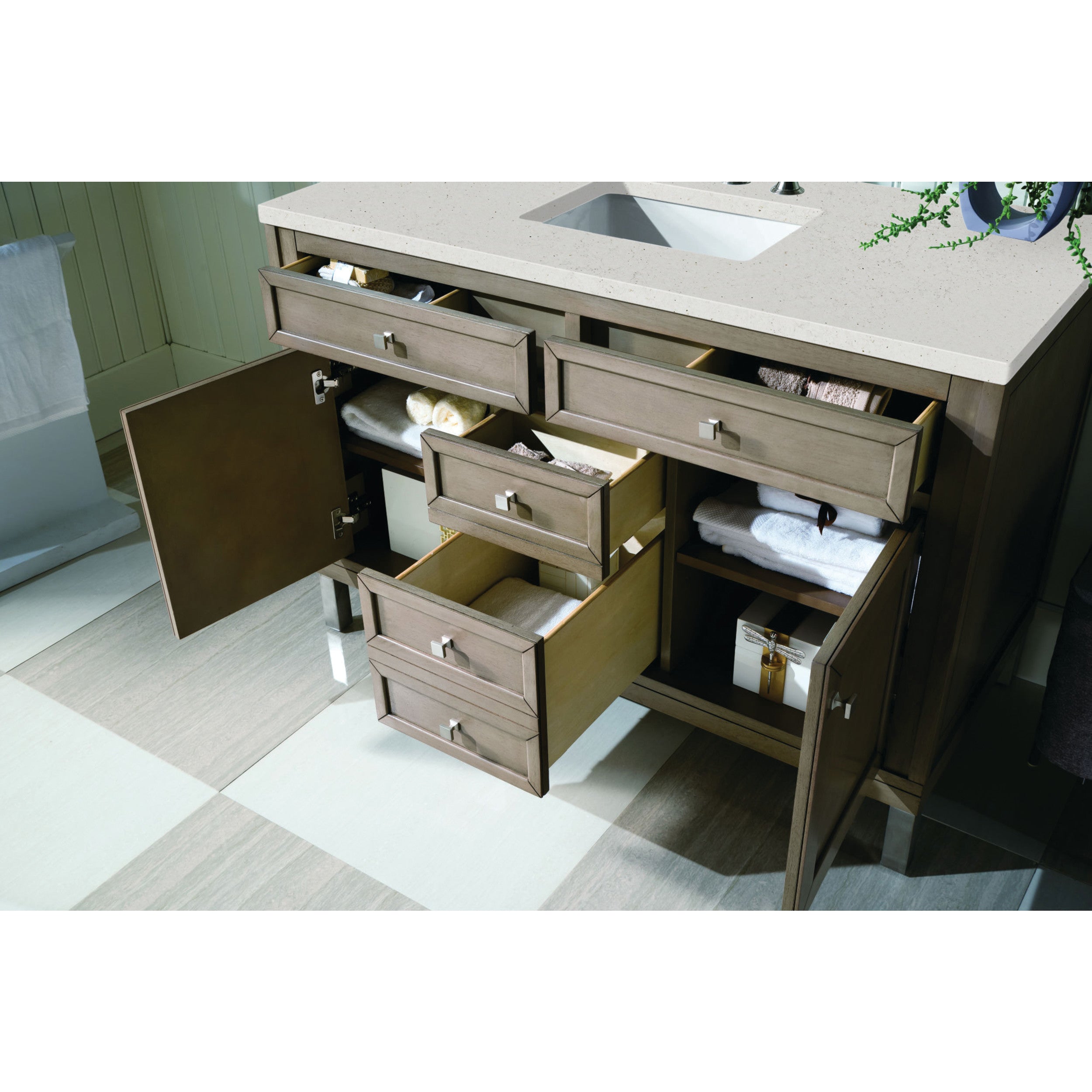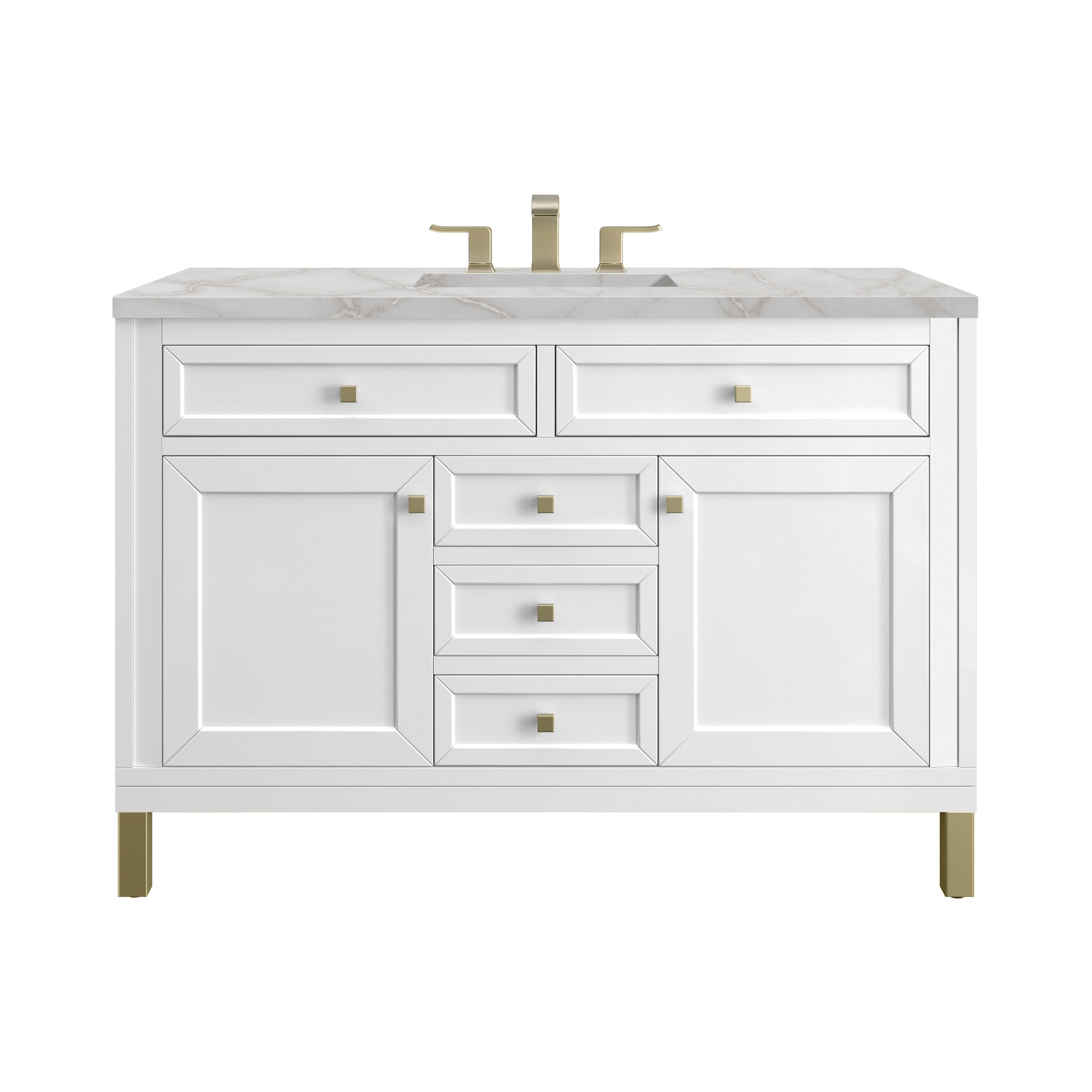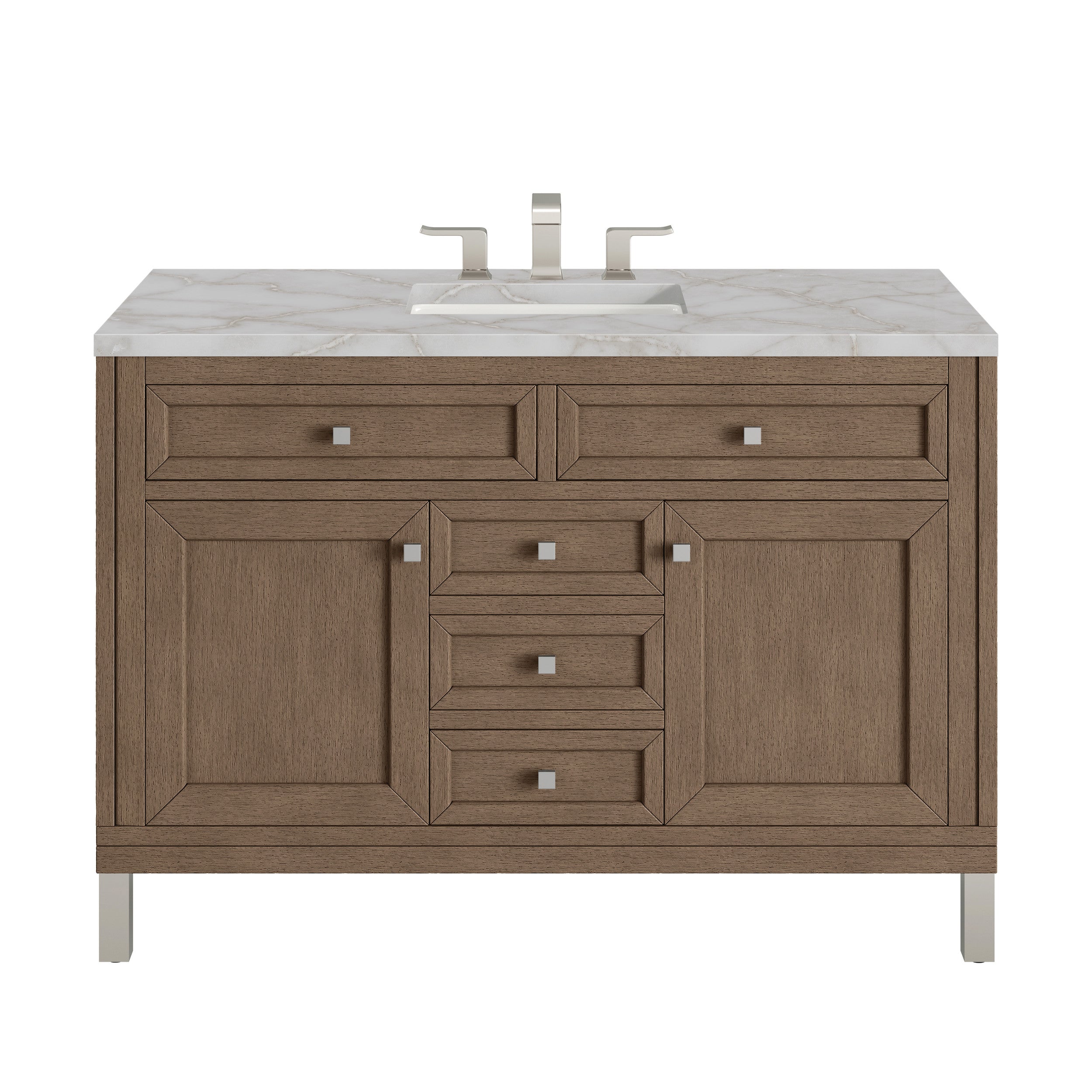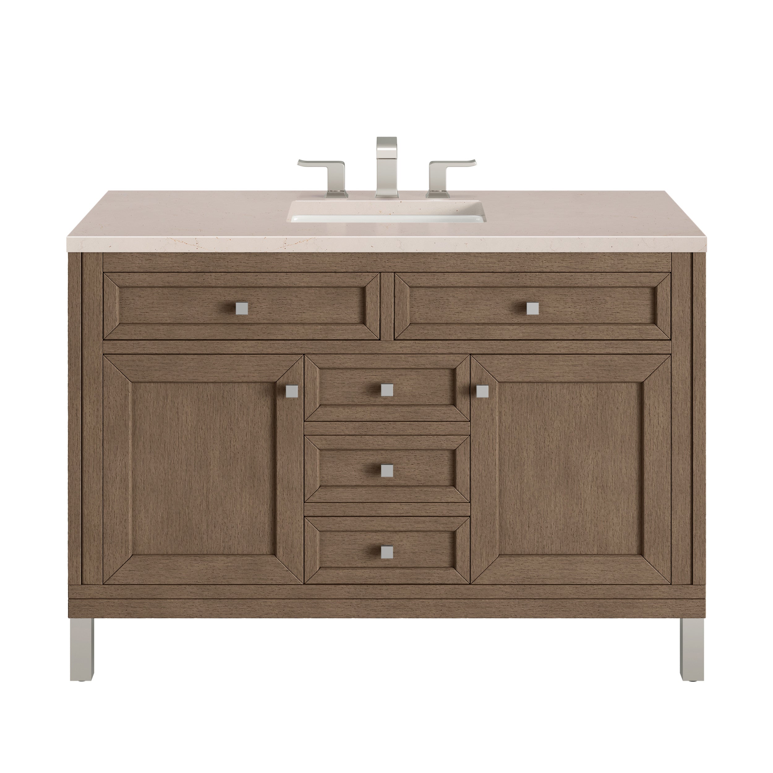 A sophisticated pairing of Mid-Century modern and Farmhouse styles, the Hudson collection stands out with a sleek paneled design. The cathedral woodgrain is accented with Champagne Brass knobs. Housing ample storage, this collection perfectly balances practicality and chic detailing.