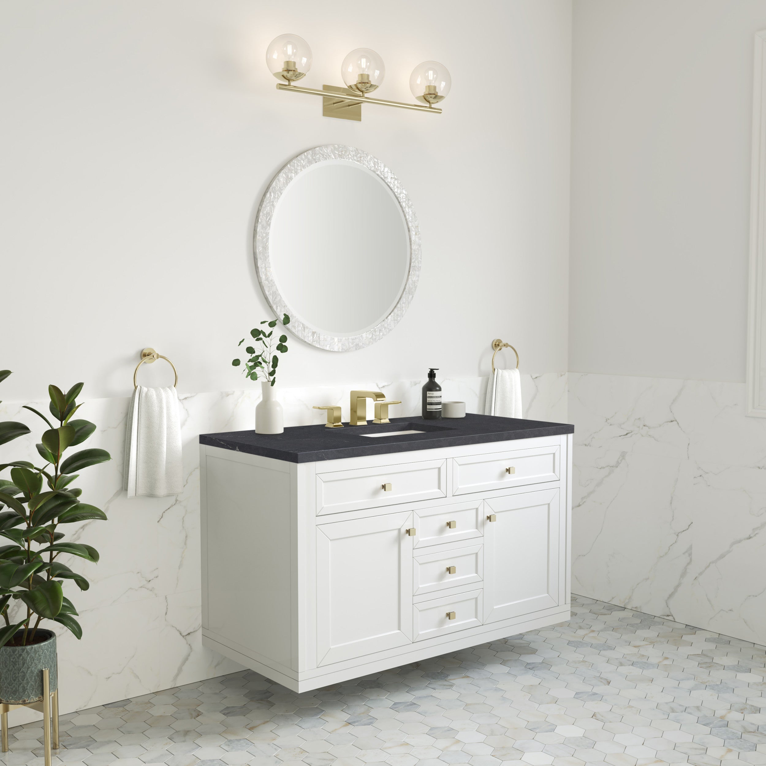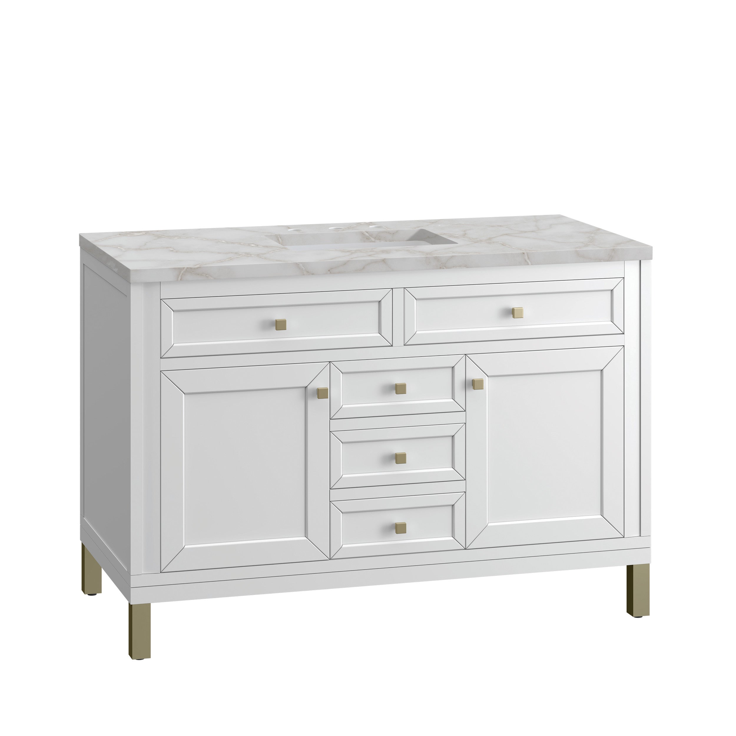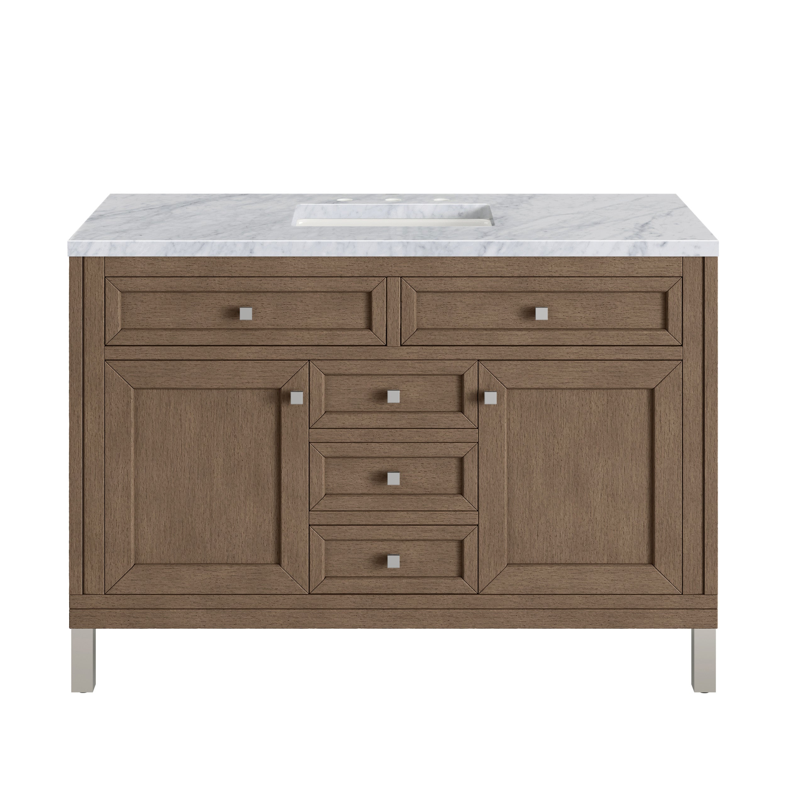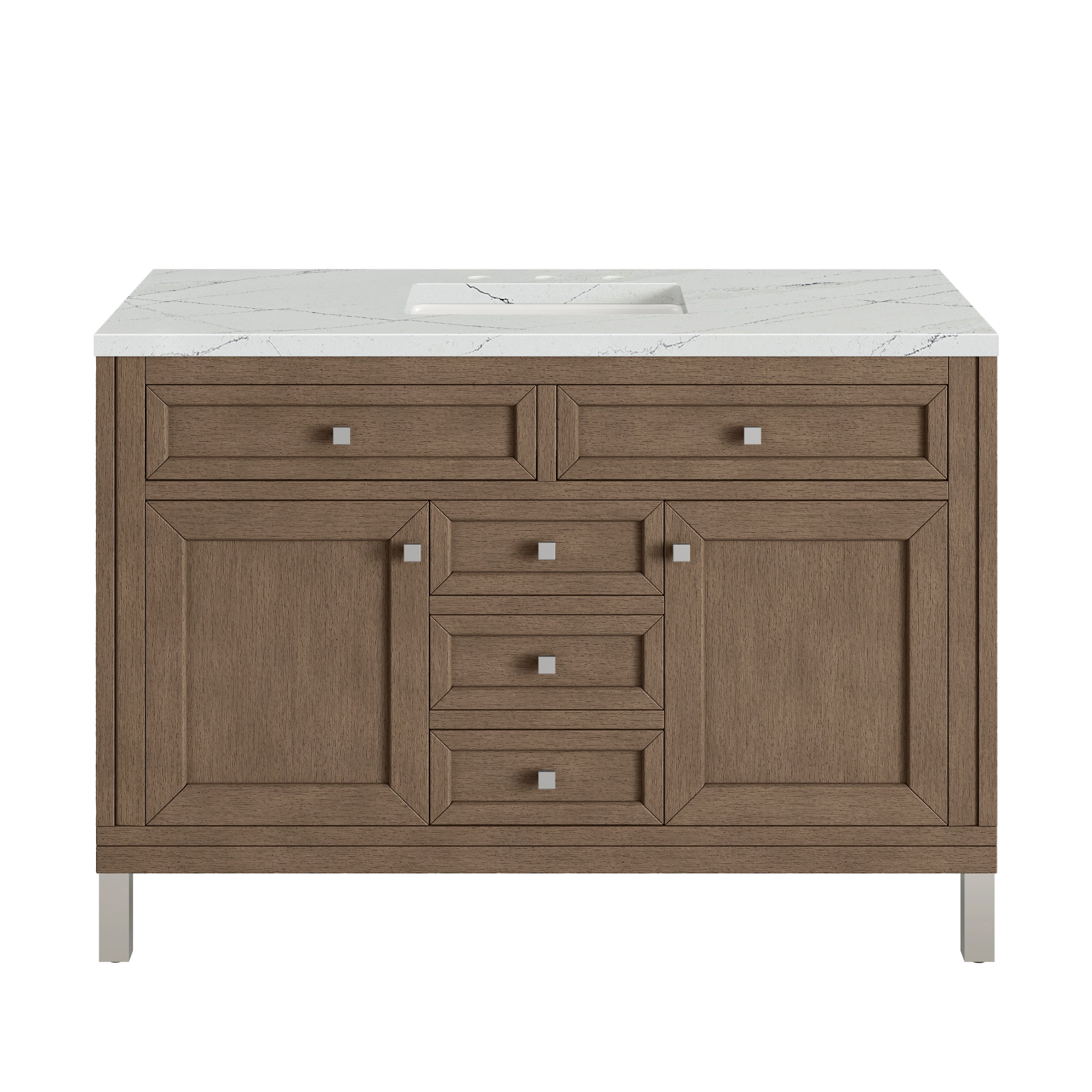 A sophisticated pairing of Mid-Century modern and Farmhouse styles, the Hudson collection stands out with a sleek paneled design. The cathedral woodgrain is accented with Champagne Brass knobs. Housing ample storage, this collection perfectly balances practicality and chic detailing.