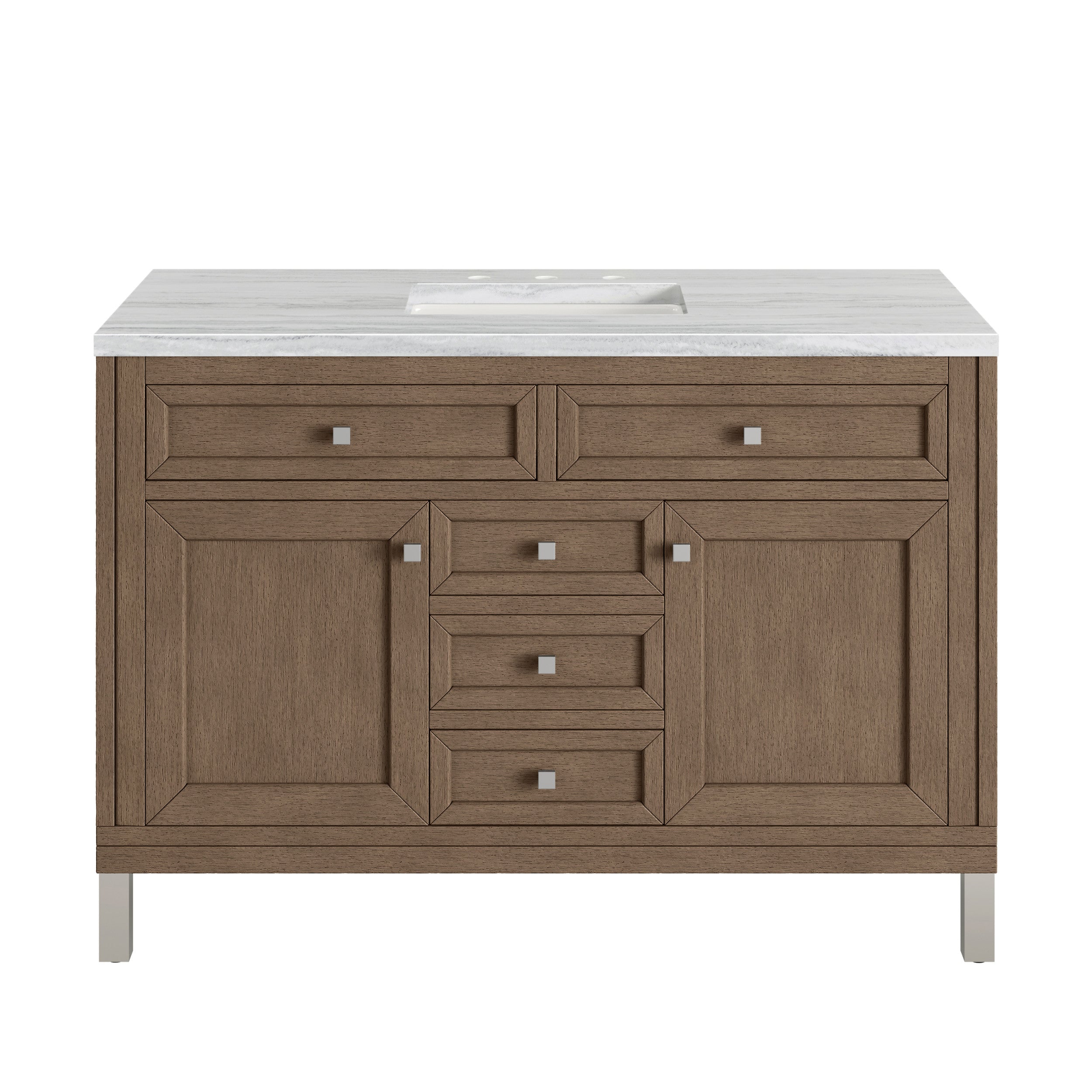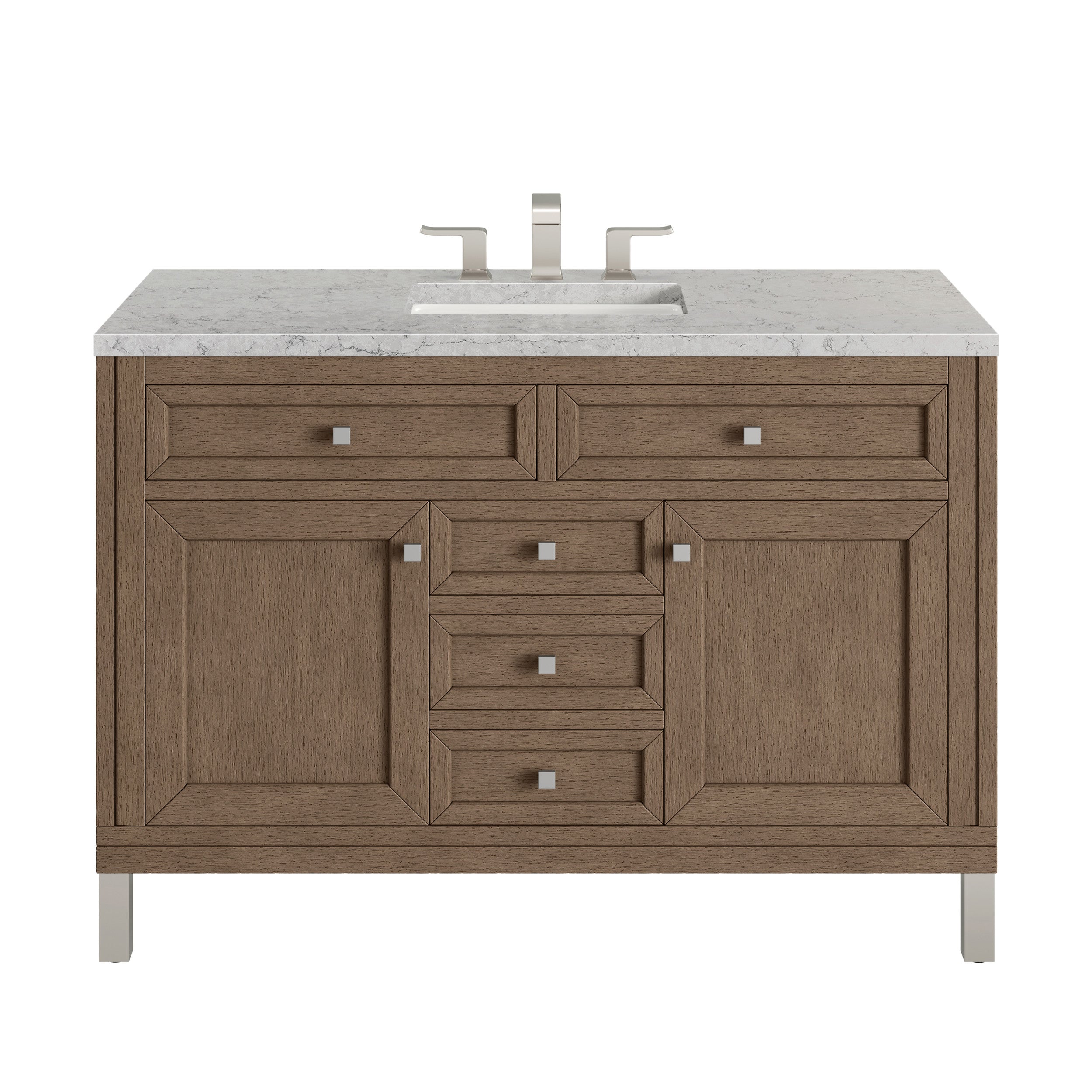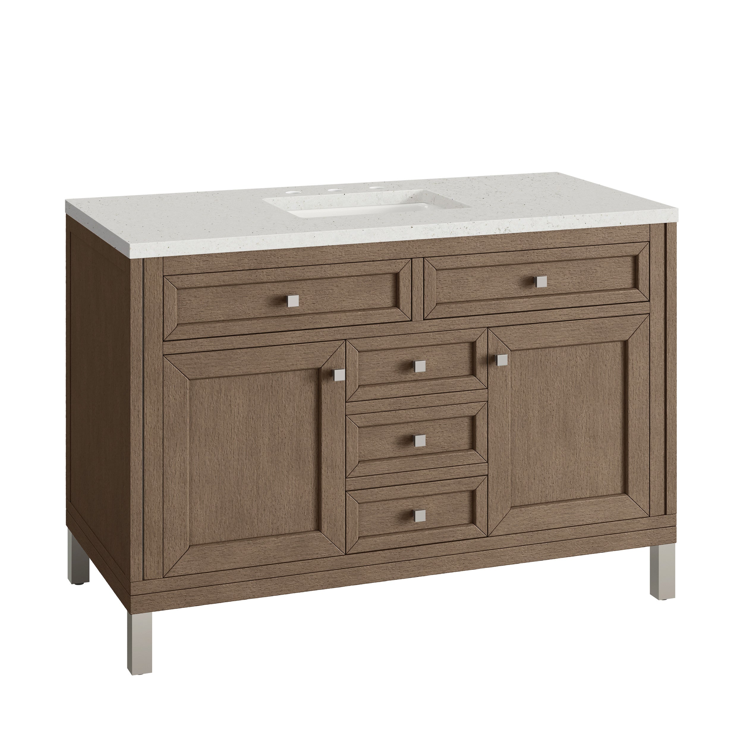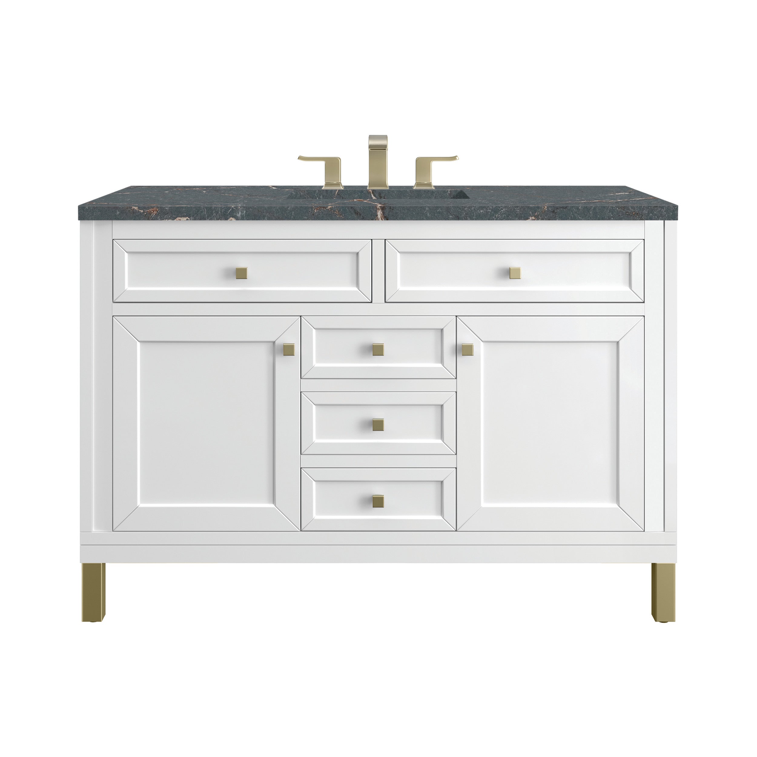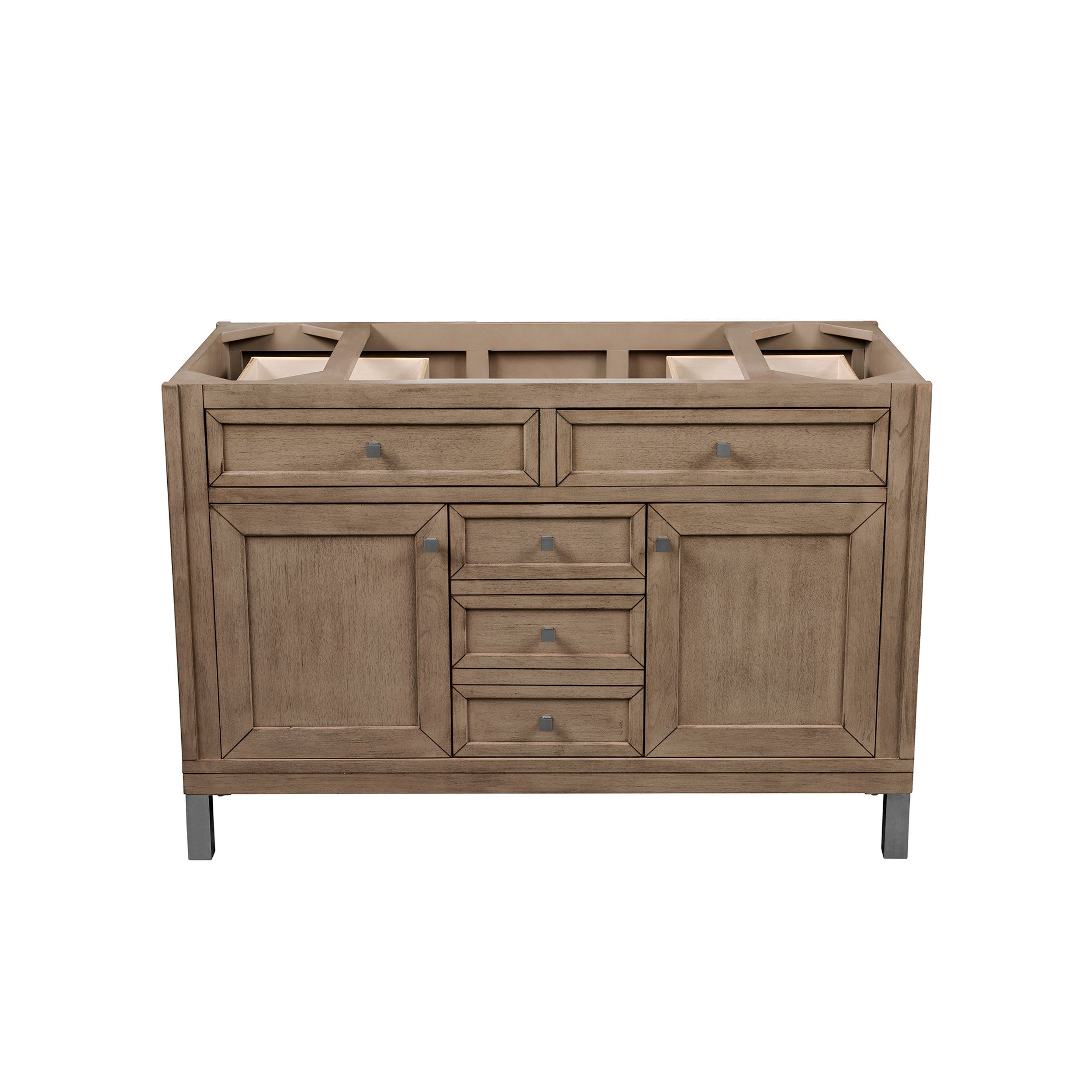 A sophisticated pairing of Mid-Century modern and Farmhouse styles, the Hudson collection stands out with a sleek paneled design. The cathedral woodgrain is accented with Champagne Brass knobs. Housing ample storage, this collection perfectly balances practicality and chic detailing.