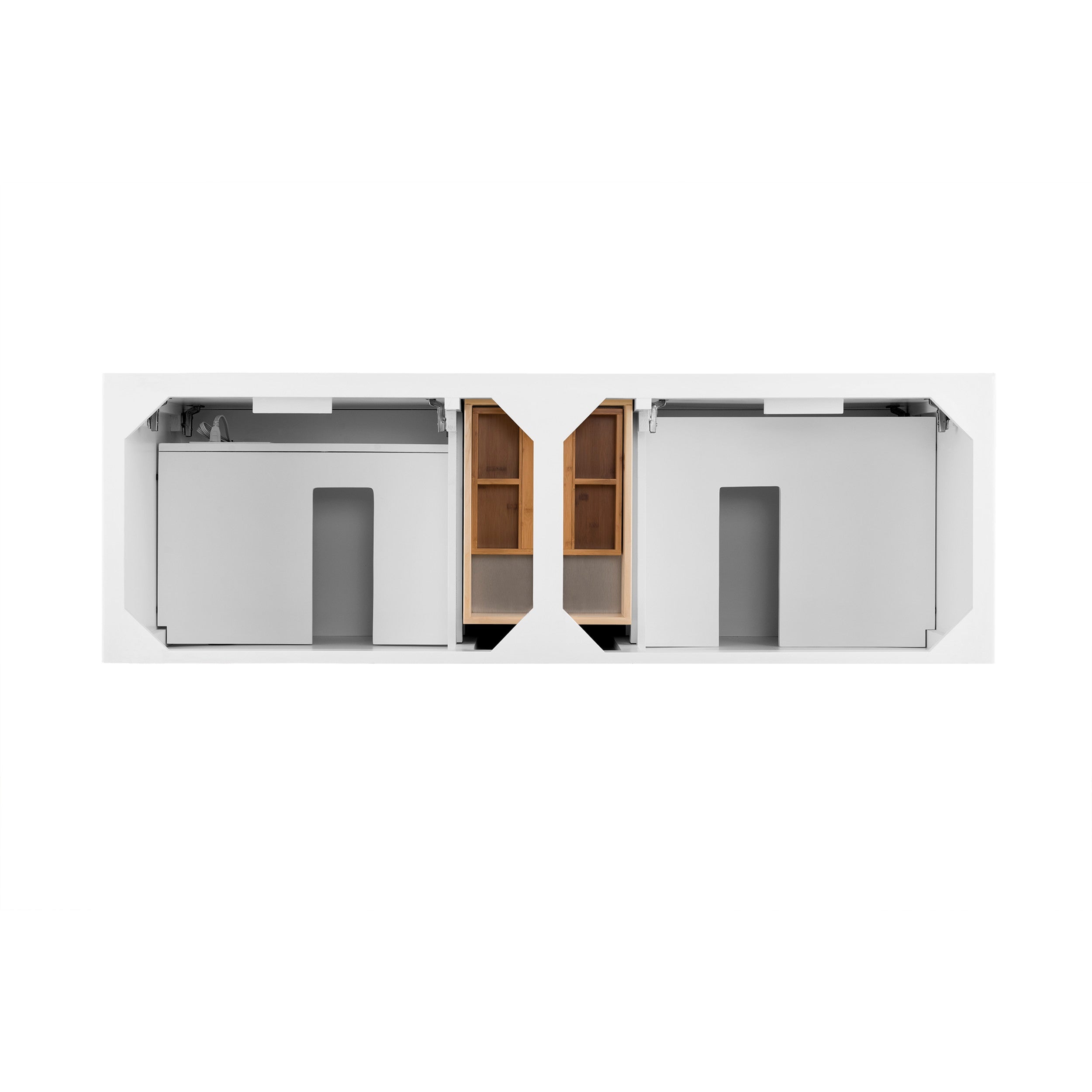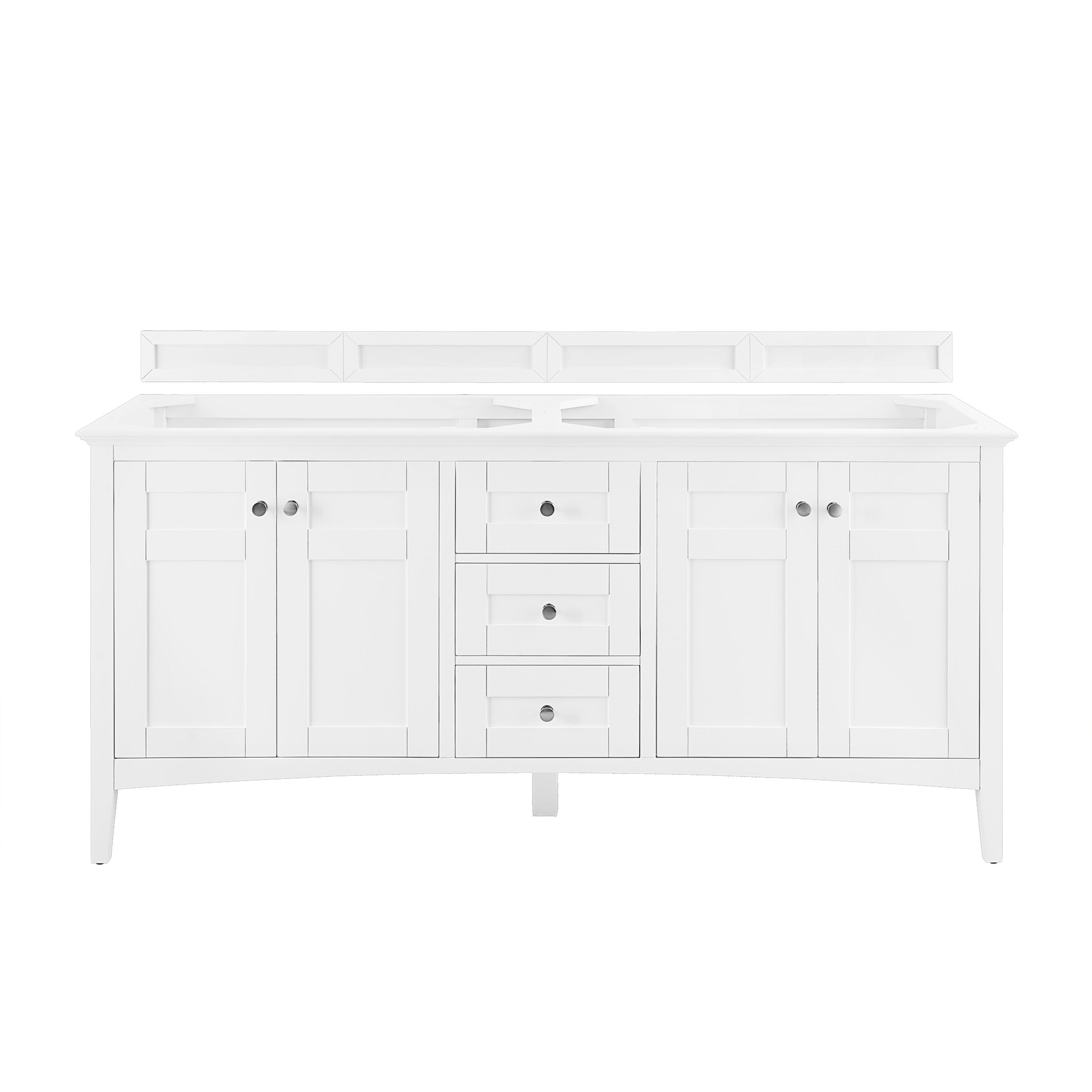 The Palisades 72" Bright White Double Vanity features four doors with two interior shelves, three drawers, and tapered legs. Premium features include an electrical and USB outlet located on a custom designed shelf behind the door and a bamboo drawer organizer. Shaker made modern, Palisades was designed to lend a modern flair to traditional Shaker-style cabinets.
