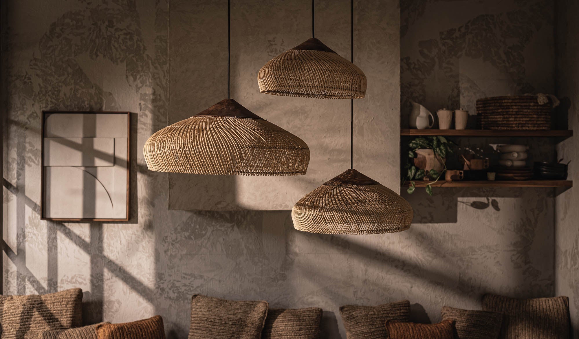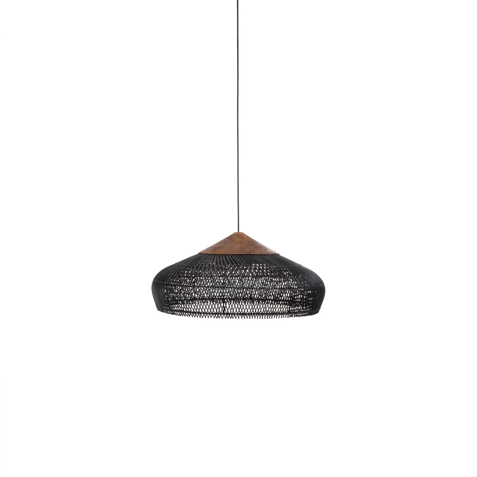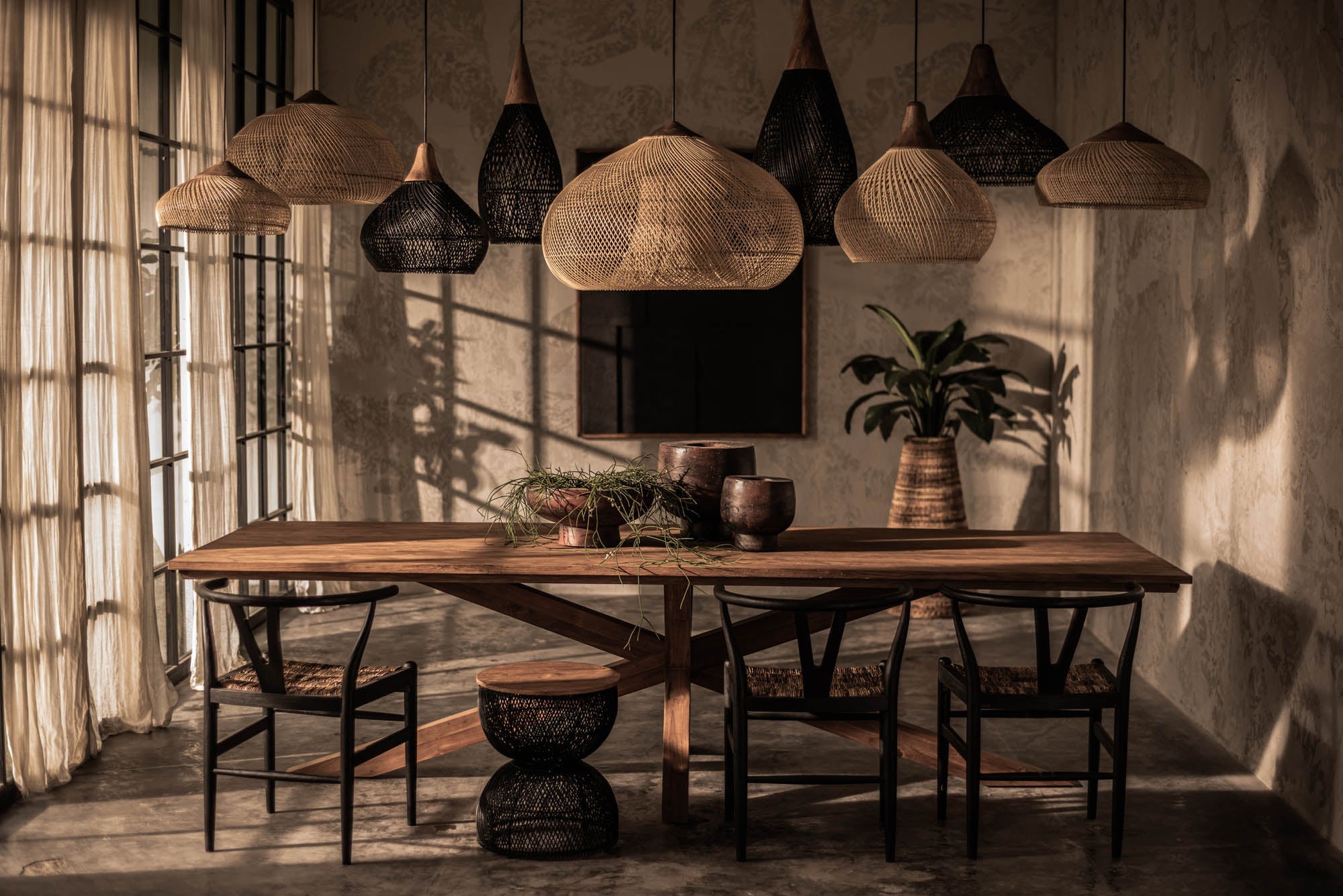 A creative interpretation of classic pendant lighting, this lamp evokes elements of nature and craftmanship. It features a teak top and organically shaped handwoven rattan details along the sides, all crafted with traditional Javanese technique. Hang alone, or create a cluster of pendants, mixing various sizes and shapes.