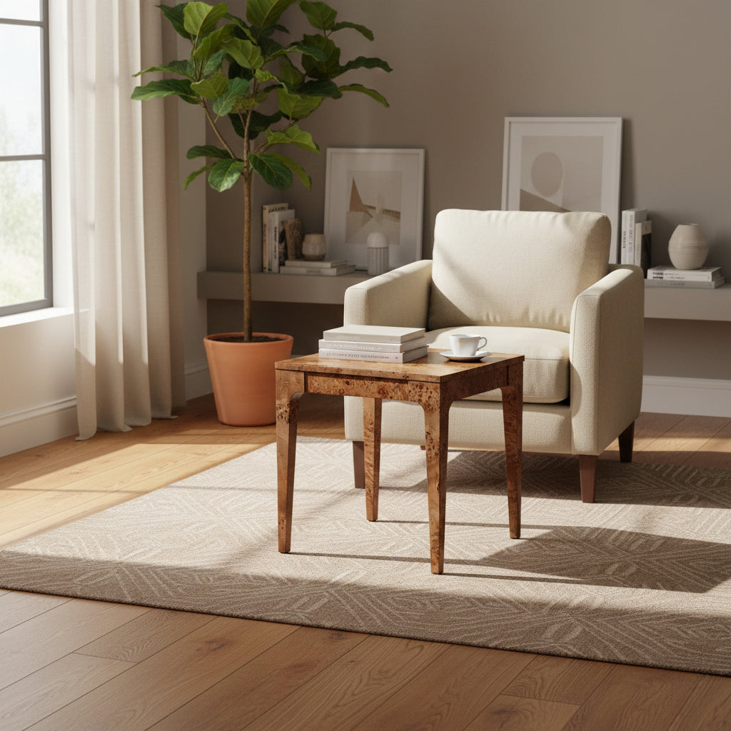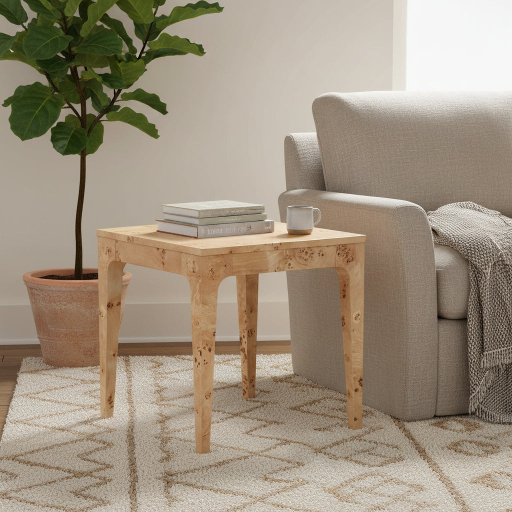 • The side table derived from the burl wood of the Mappa tree, this veneer displays a unique grain pattern with intricate swirls and details, making each side table a one-of-a-kind piece of art.