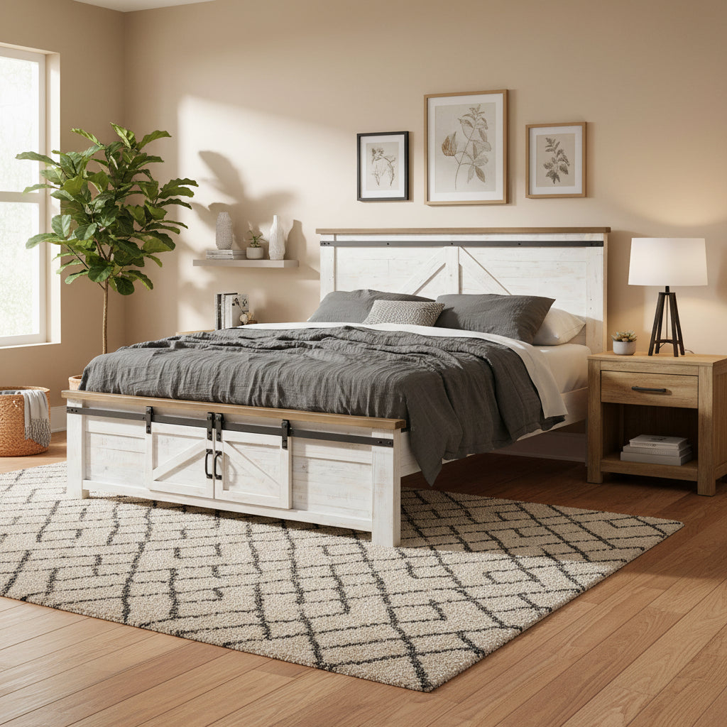 This item embodies natural rustic charm. This collection features an antique white finish, farmhouse gliding doors and lots of room for storage!