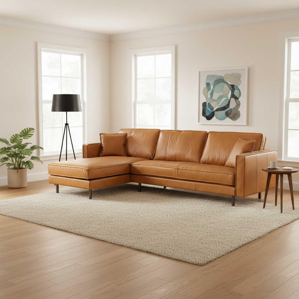 The D'Arcy leather left chaise sectional sofa measures 111ÓL x 70ÓD x 33ÓH overall. D'Acry's Measurements are as follows: Overall: 111ÓL x 70ÓD x 33ÓH Sofa portion- overall: 72ÓL x 36ÓD x 33ÓH Chaise portion- overall: 39ÓL x 70ÓD x 33ÓH Detailed: Sofa portion- seat: 67ÓL x 23ÓD x 18ÓH Chaise portion- seat: 34ÓL x 56ÓD x 18ÓH Back height: 20ÓH Arm height- from floor: 26ÓH Arm height- from seat: 8.5ÓH Leg height: 6ÓH The D'Arcy sofa is constructed from kiln dried solid wood, high density foam, duck feathers, and full-aniline 100% top-grain leather. *Natural color variations, and creases are part of the unique characteristics of this leather. It will develop a relaxed vintage look with regular use.This sofa is finished in a beautiful tan color, and features a sturdy corner blocked wooden frame and high density foam with polyester filling. Inverted seams make on the couch and accent pillows make this sofa unique and eye-catching. The D'Arcy sofa is best suited for mid-century and modern spaces, however will easily adapt to a variety of design styles and decor items.