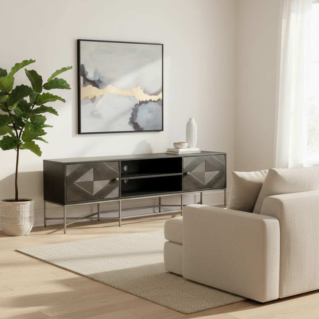 Hogarth I is a media console made from Indian mango wood with embossed diamond pattern doors.