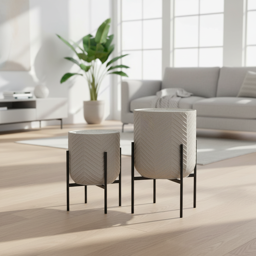 The Mabel is a set of two stunning metal plant holders finished in a light gray tone.