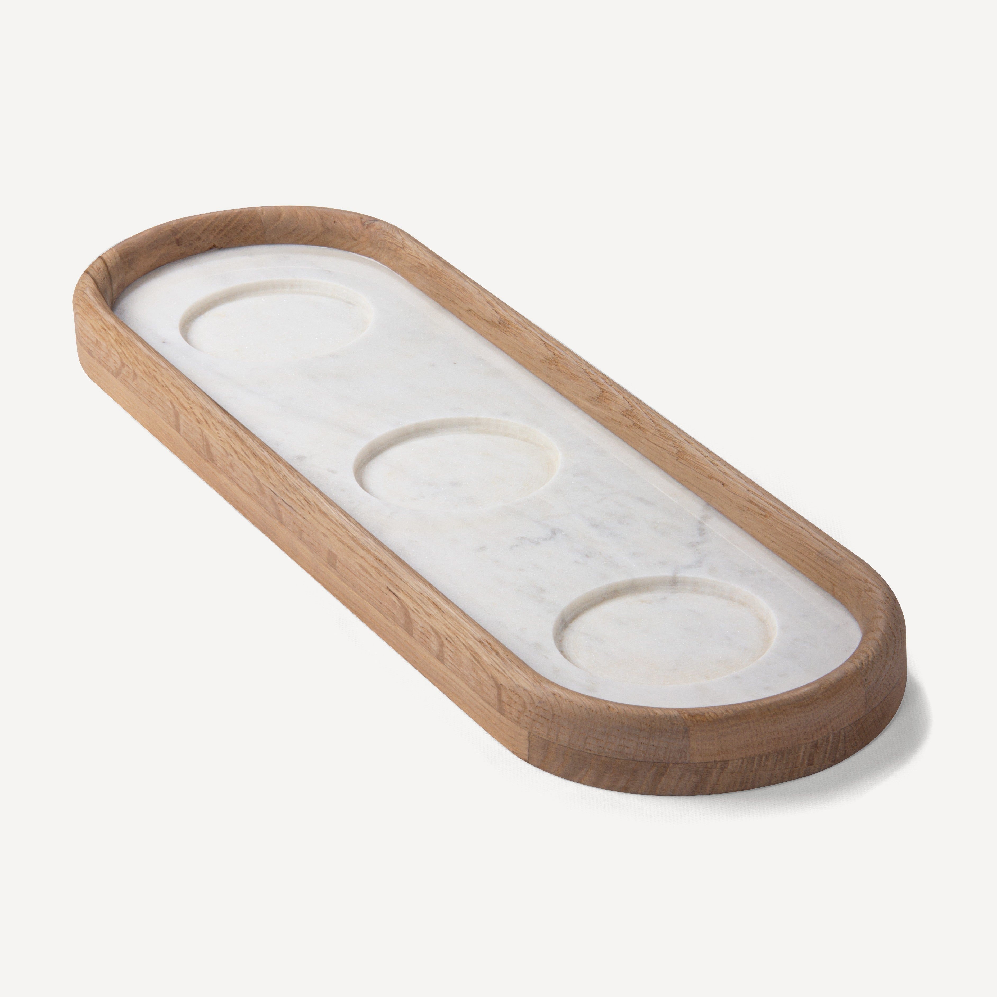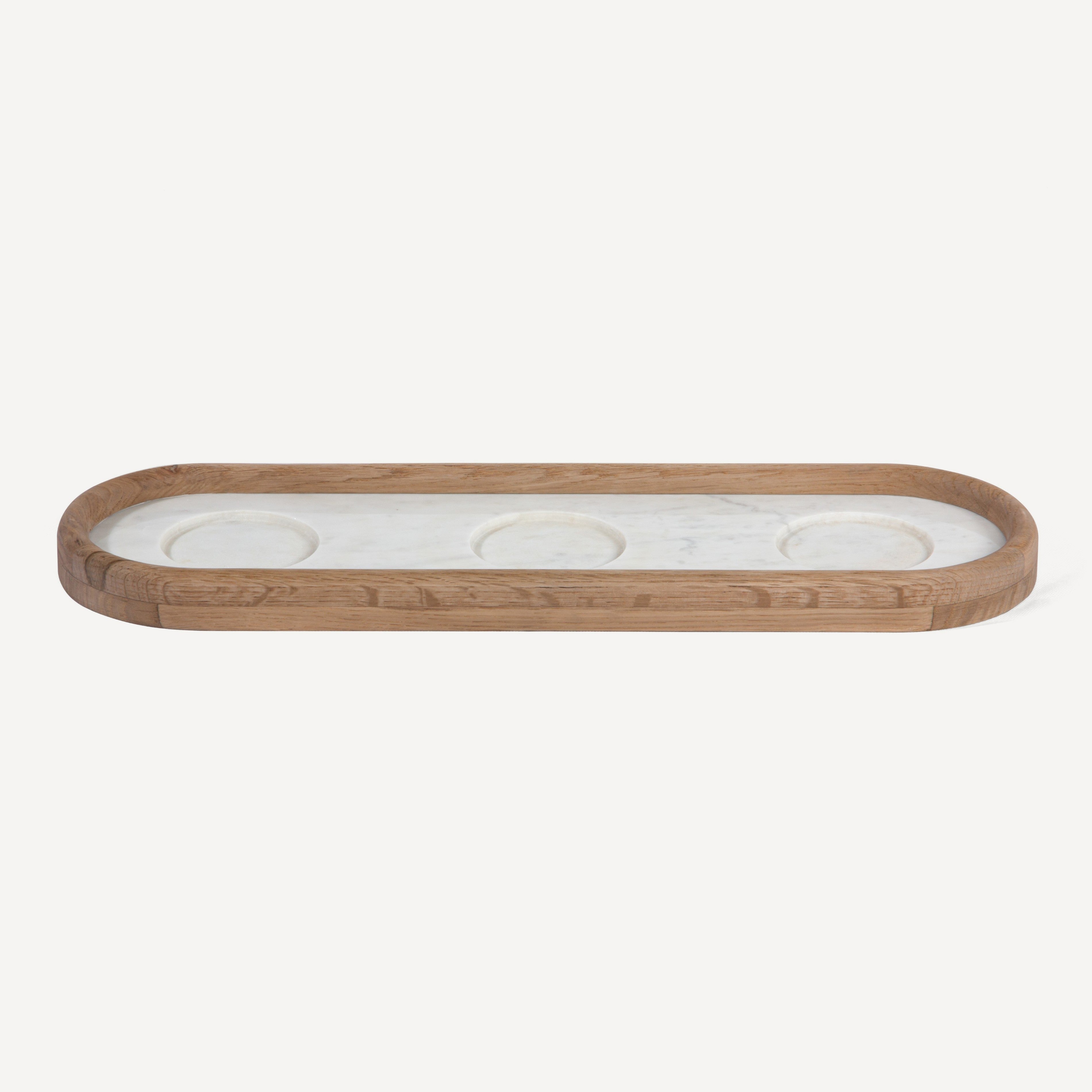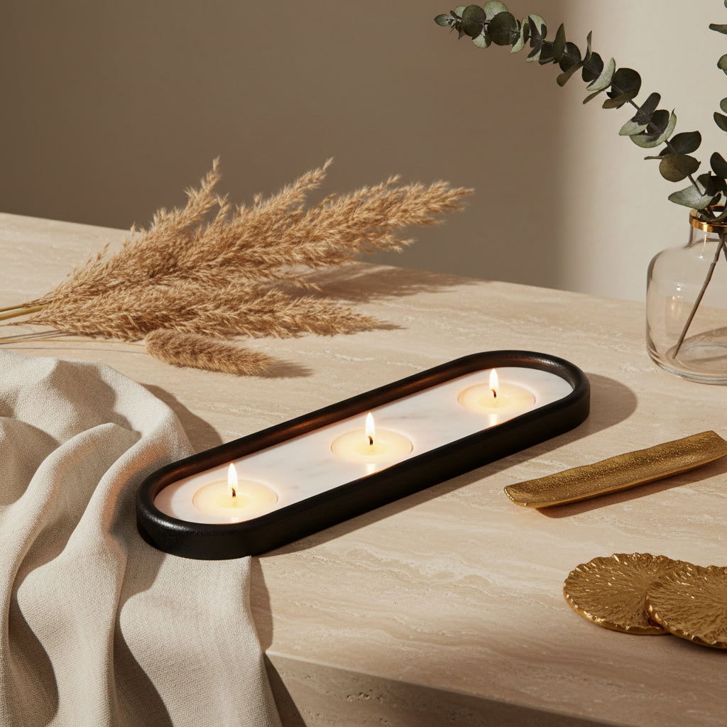 The Ceylon candle holder combines soft modern detailing with warm, contrasting materials. Solid FSC-certified Oak with a profiled edge frames a solid marble tray with carved recesses, perfect for displaying your favorite candles.