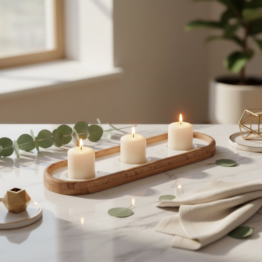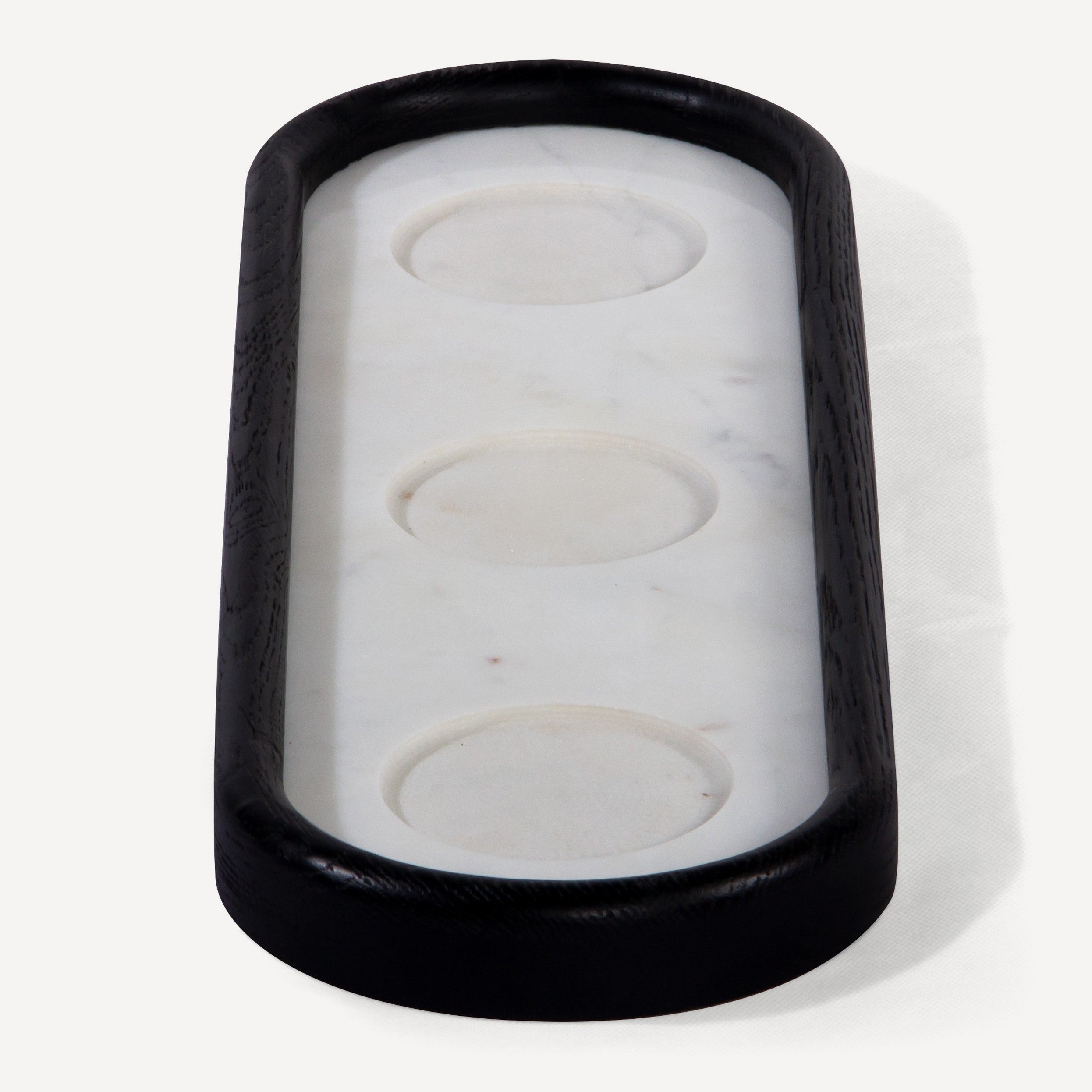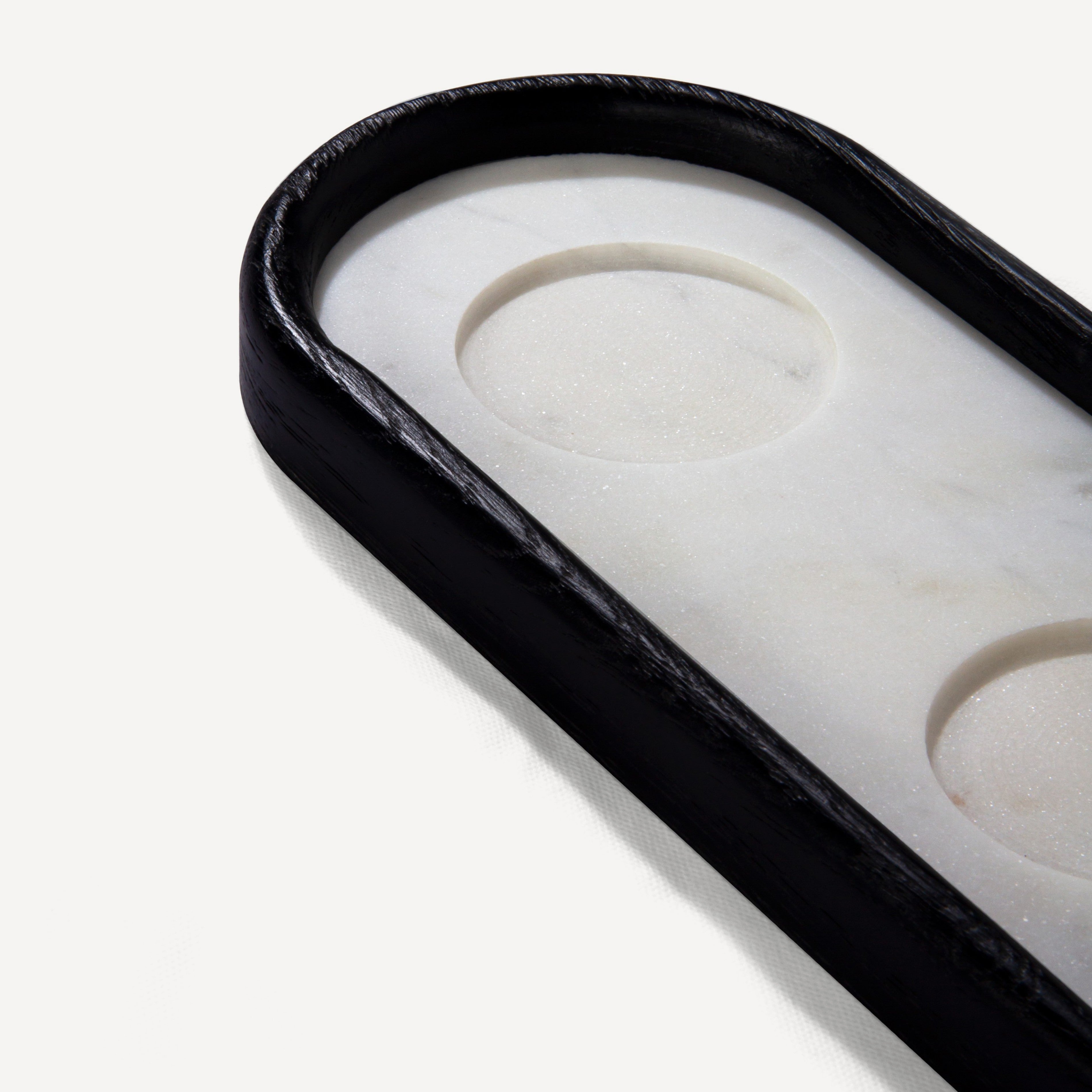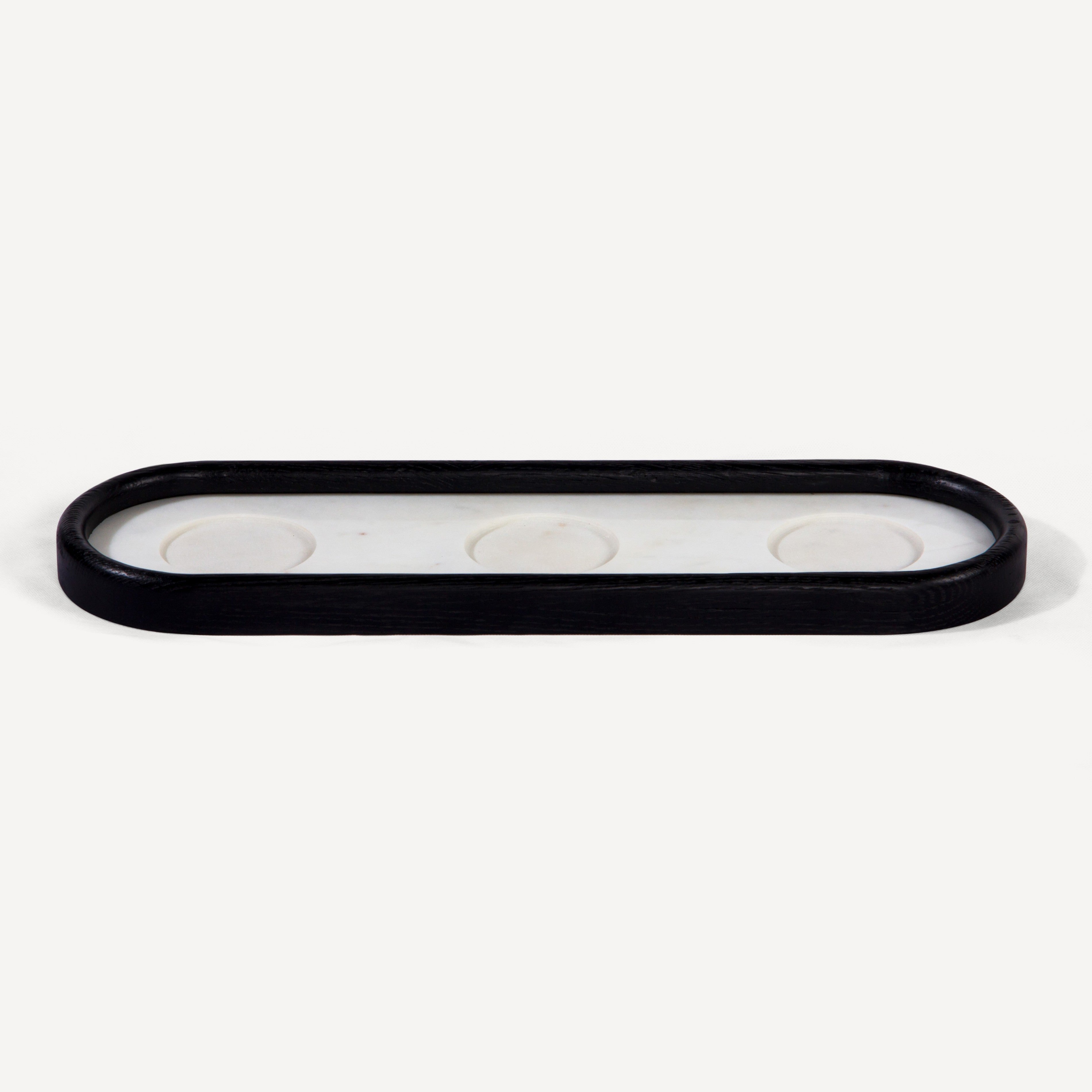 The Ceylon candle holder combines soft modern detailing with warm, contrasting materials. Solid FSC-certified Oak with a profiled edge frames a solid marble tray with carved recesses, perfect for displaying your favorite candles.