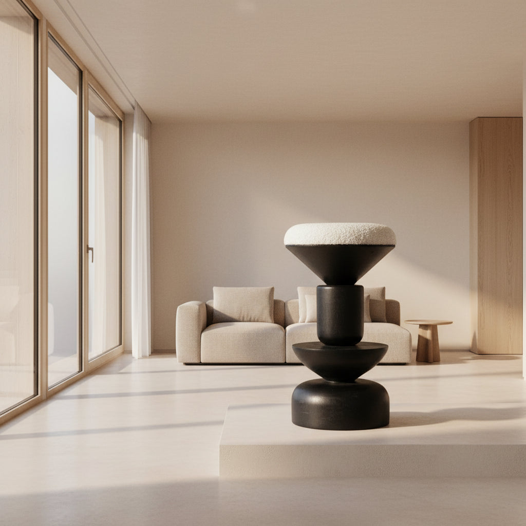Playful in form, the Kebab Counter Stool makes a bold, geometric statement. A turned, solid wood pedestal with a subtle wire brushed finish supports a plush, boucle upholstered seat.
