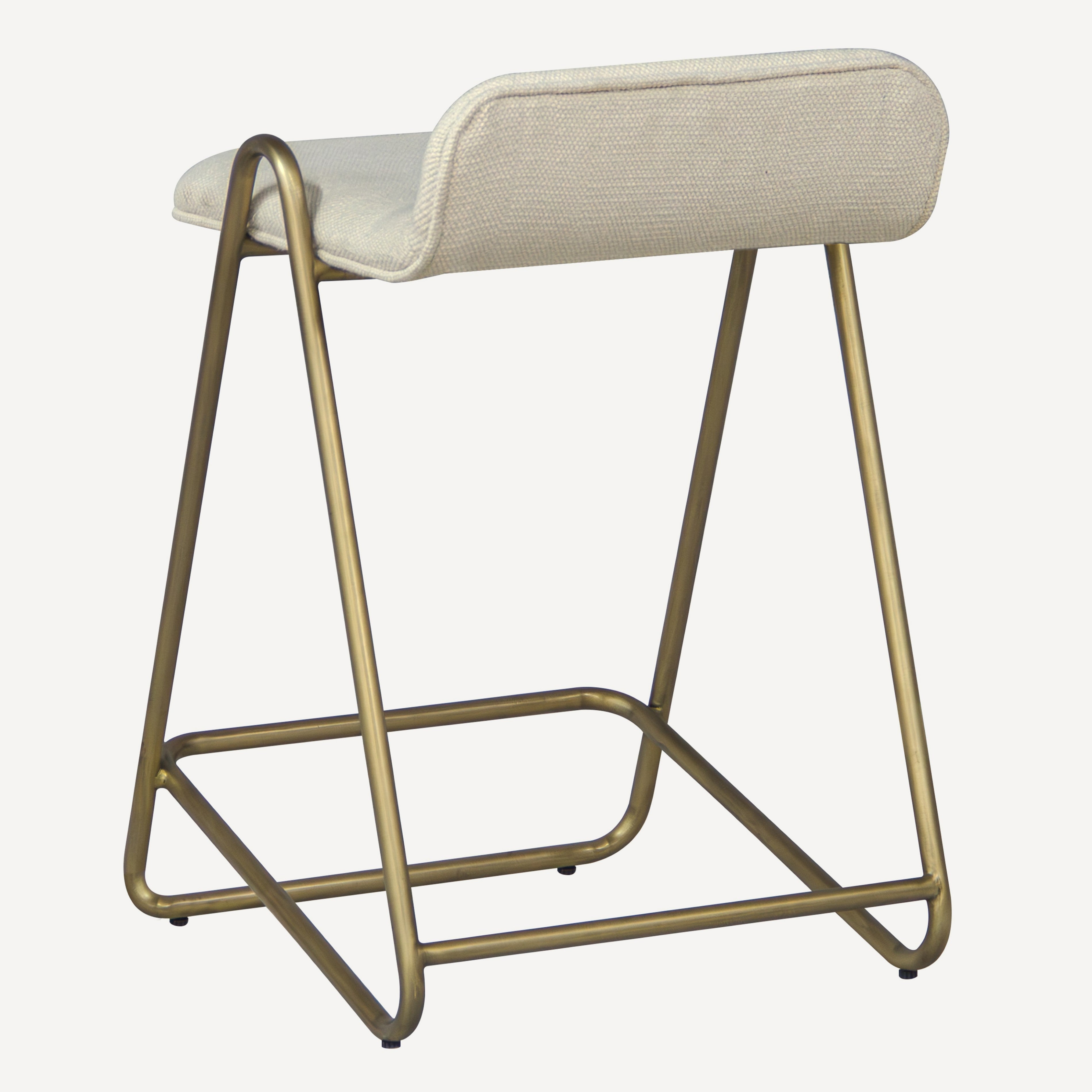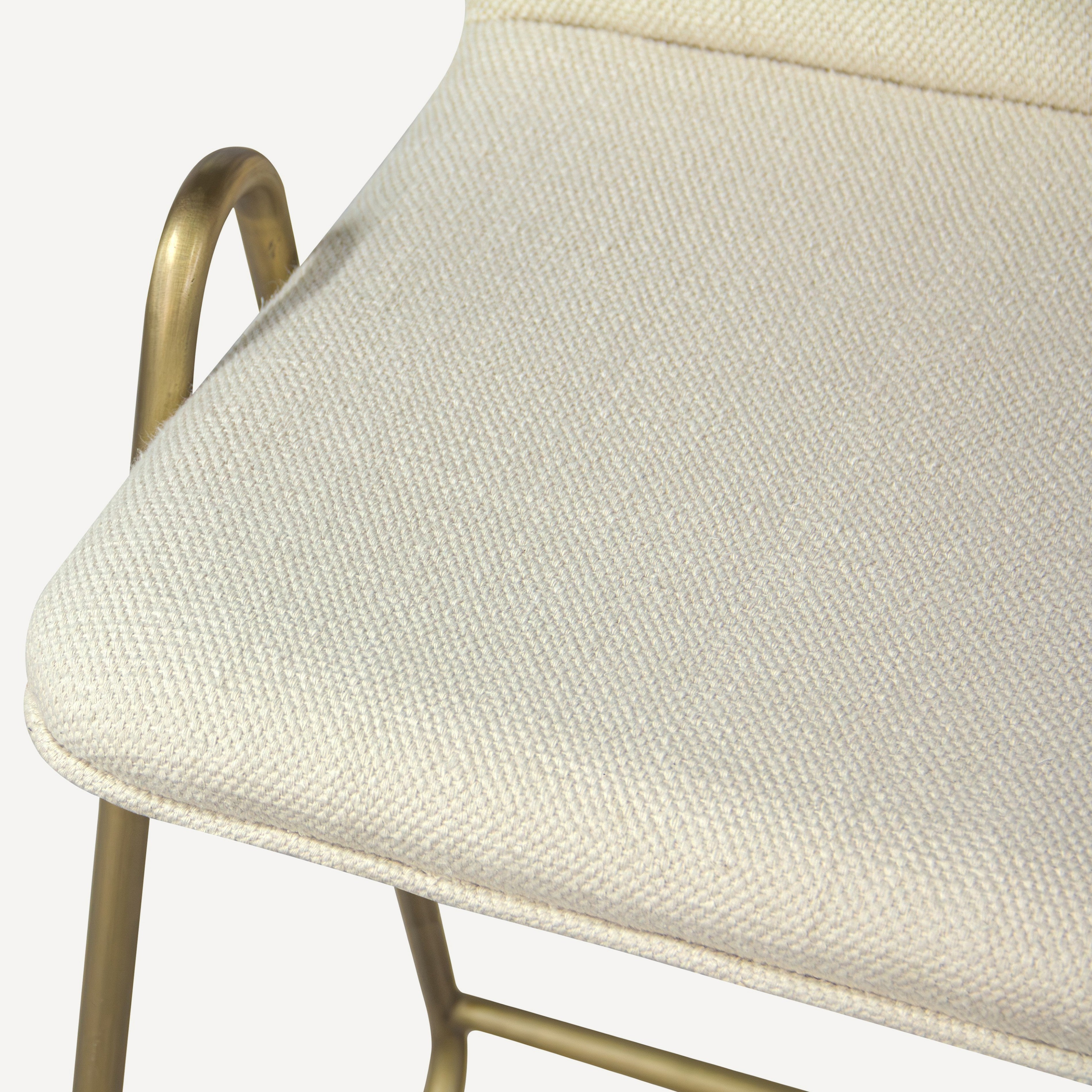 Inspired by the bends of a paper clip, the Clipper Stool features a dynamic steel tube leg frame, finished in a warm antique brass. A plush seat upholstered in natural cotton Dhurrie fabric provides comfortable seating for any entertaining or dining space.