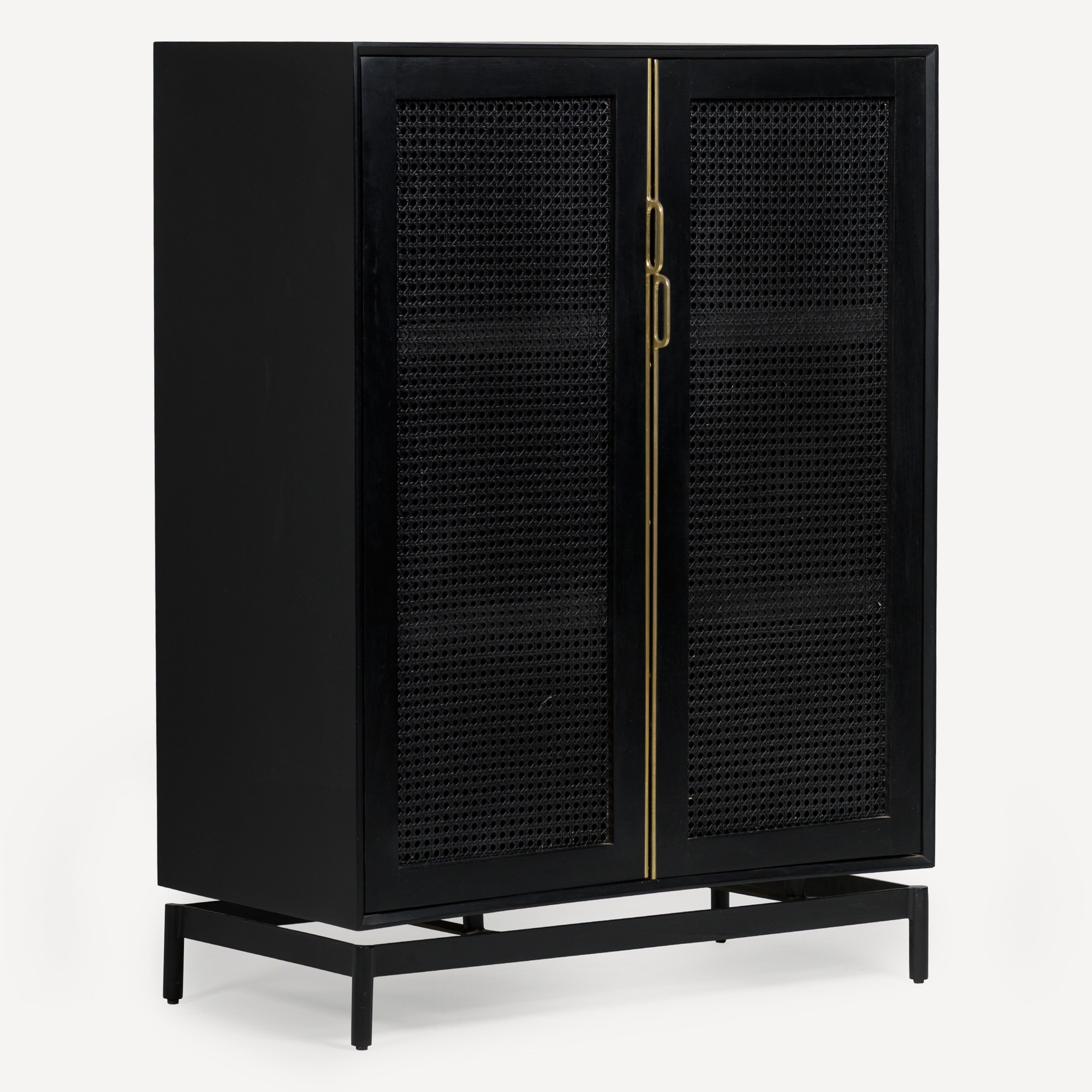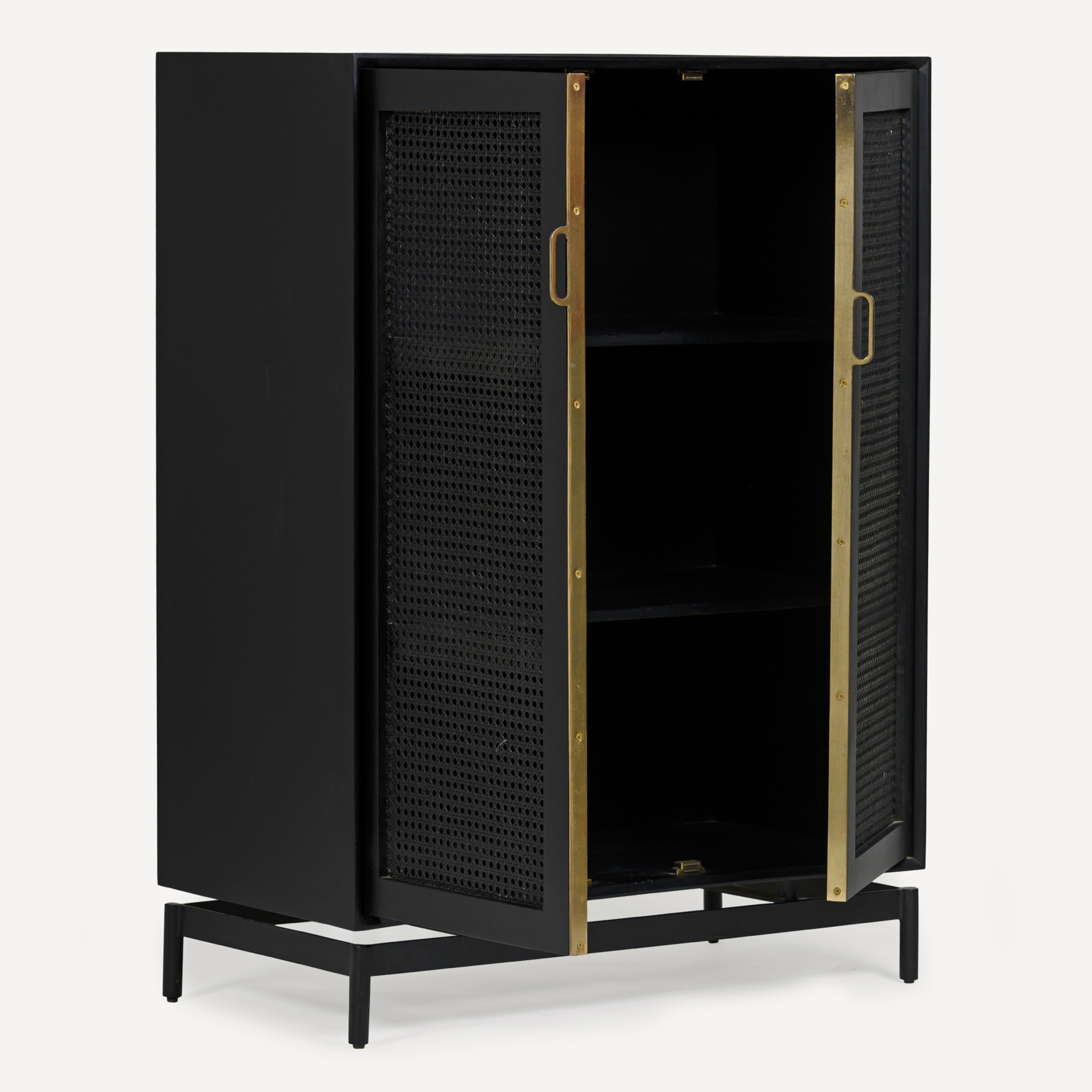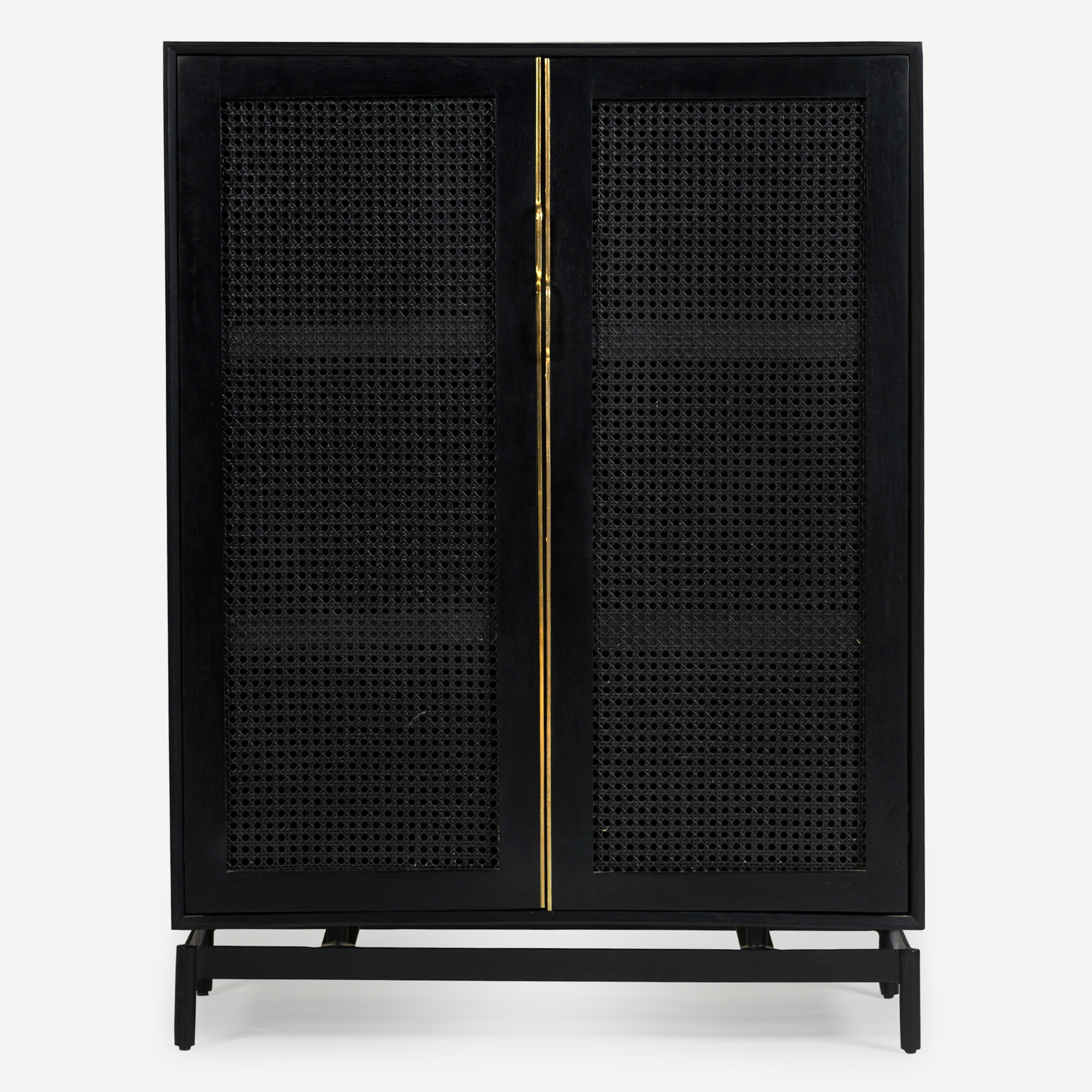 Our Louisiana cabinet features woven cane door fronts accented by full length brass pull hardware. The two hinged doors conceal ample storage space with three interior shelves, combining style and functionality in a classic design.