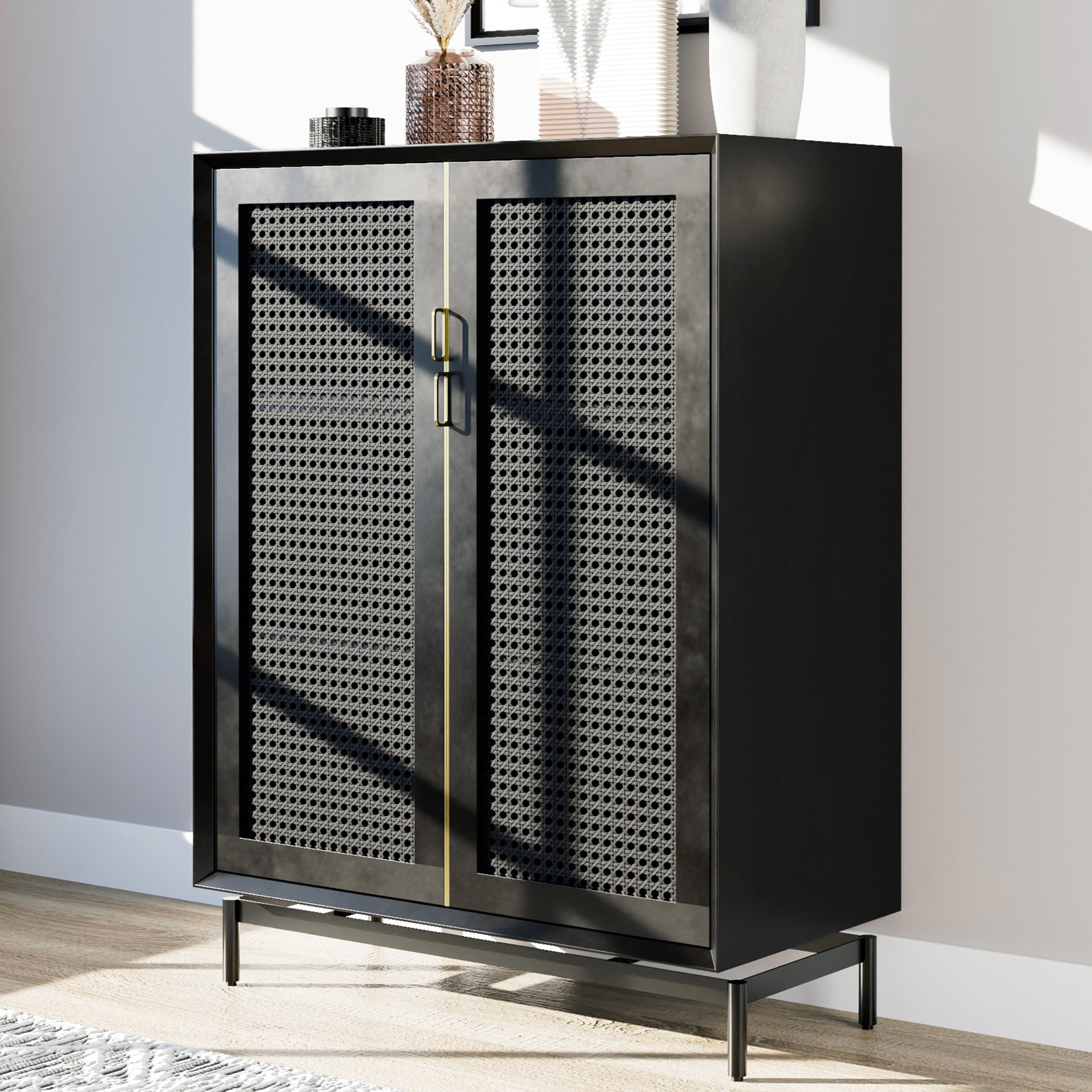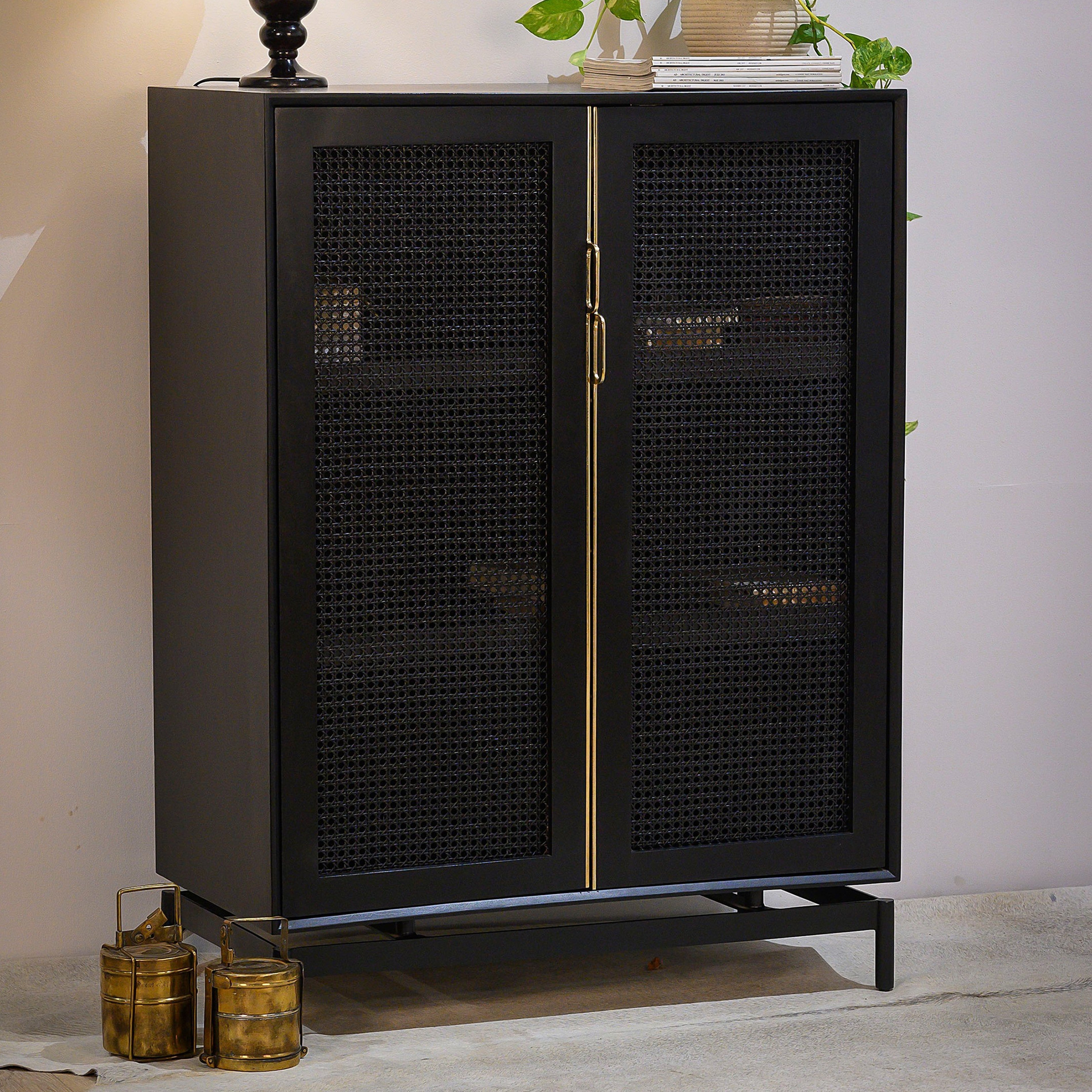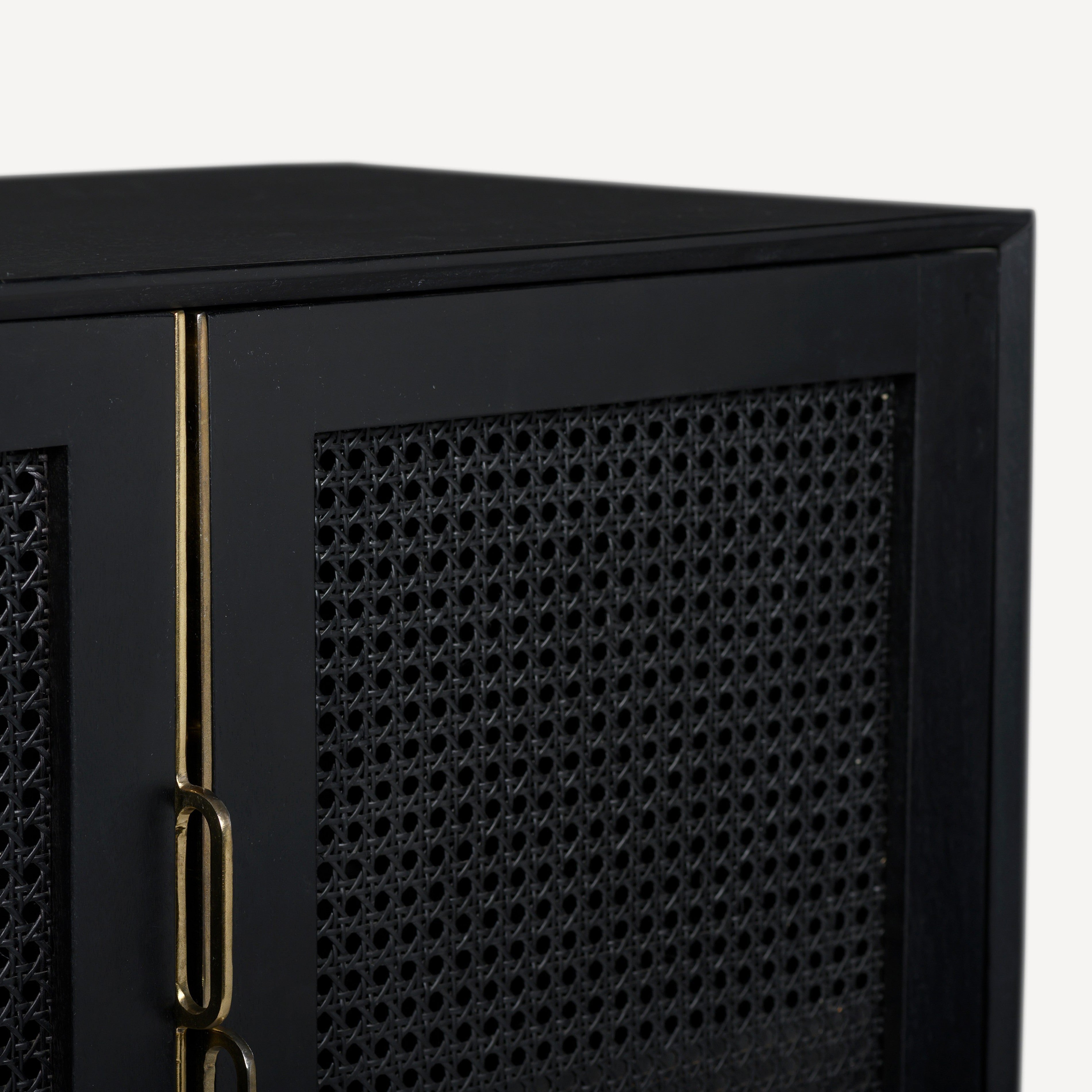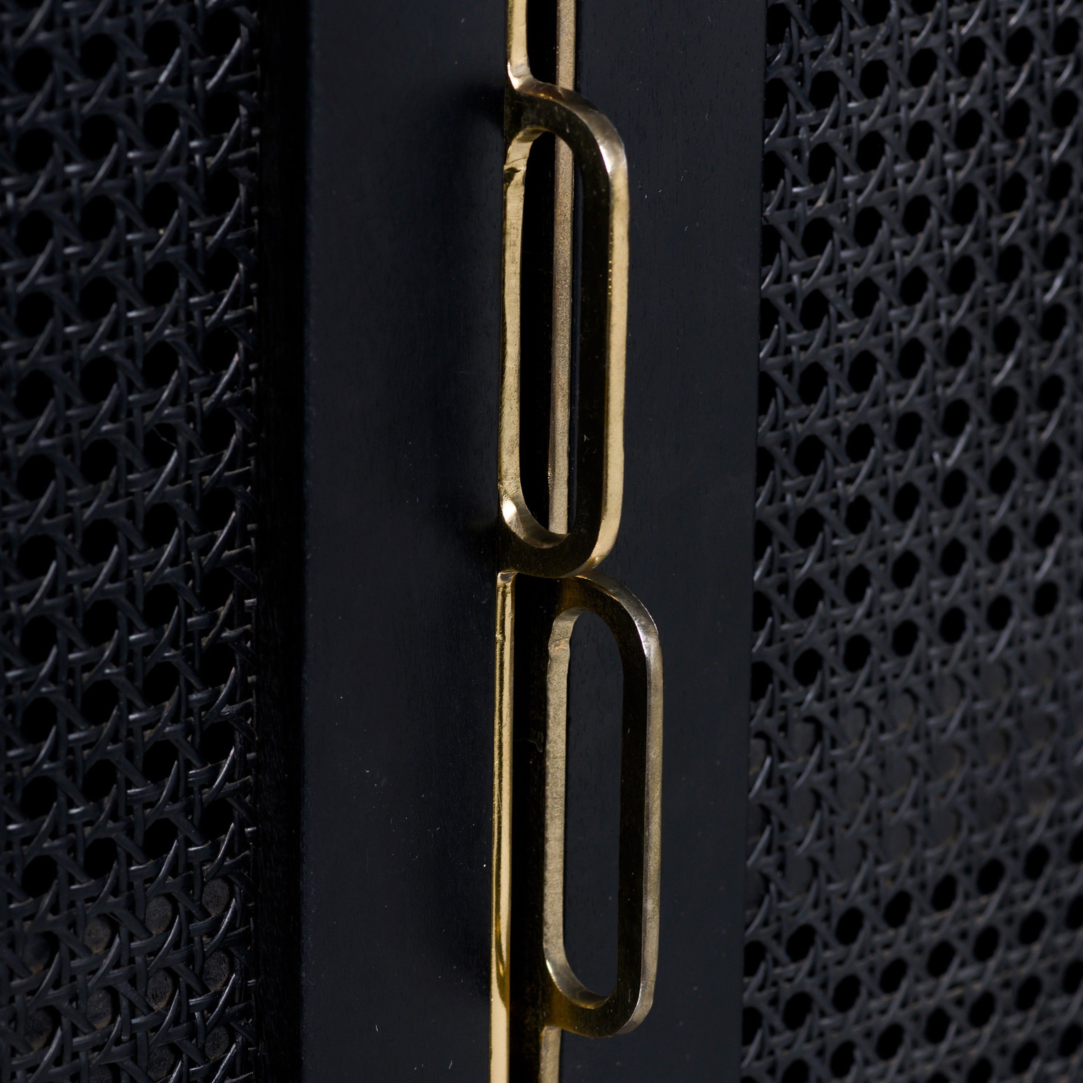Our Louisiana cabinet features woven cane door fronts accented by full length brass pull hardware. The two hinged doors conceal ample storage space with three interior shelves, combining style and functionality in a classic design.