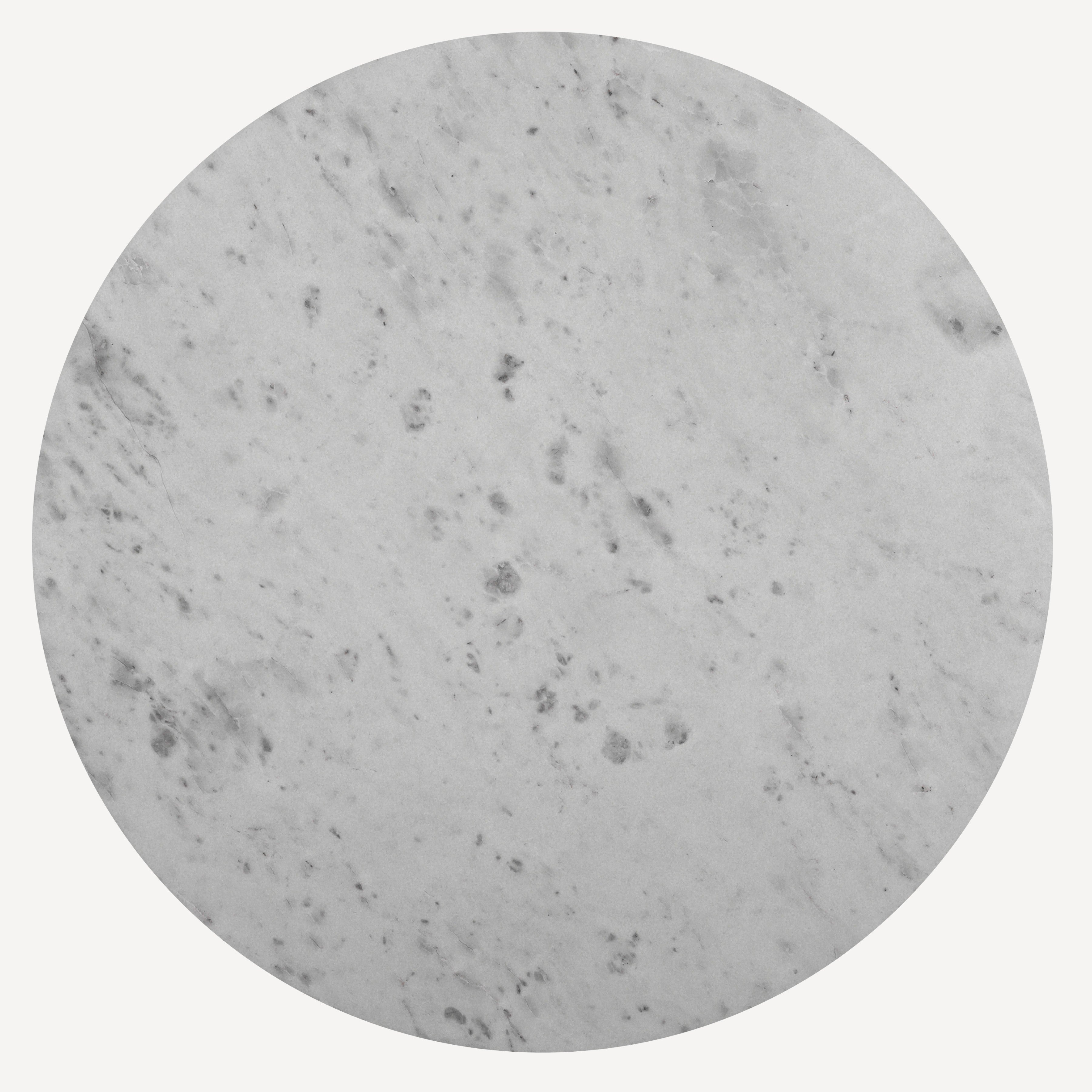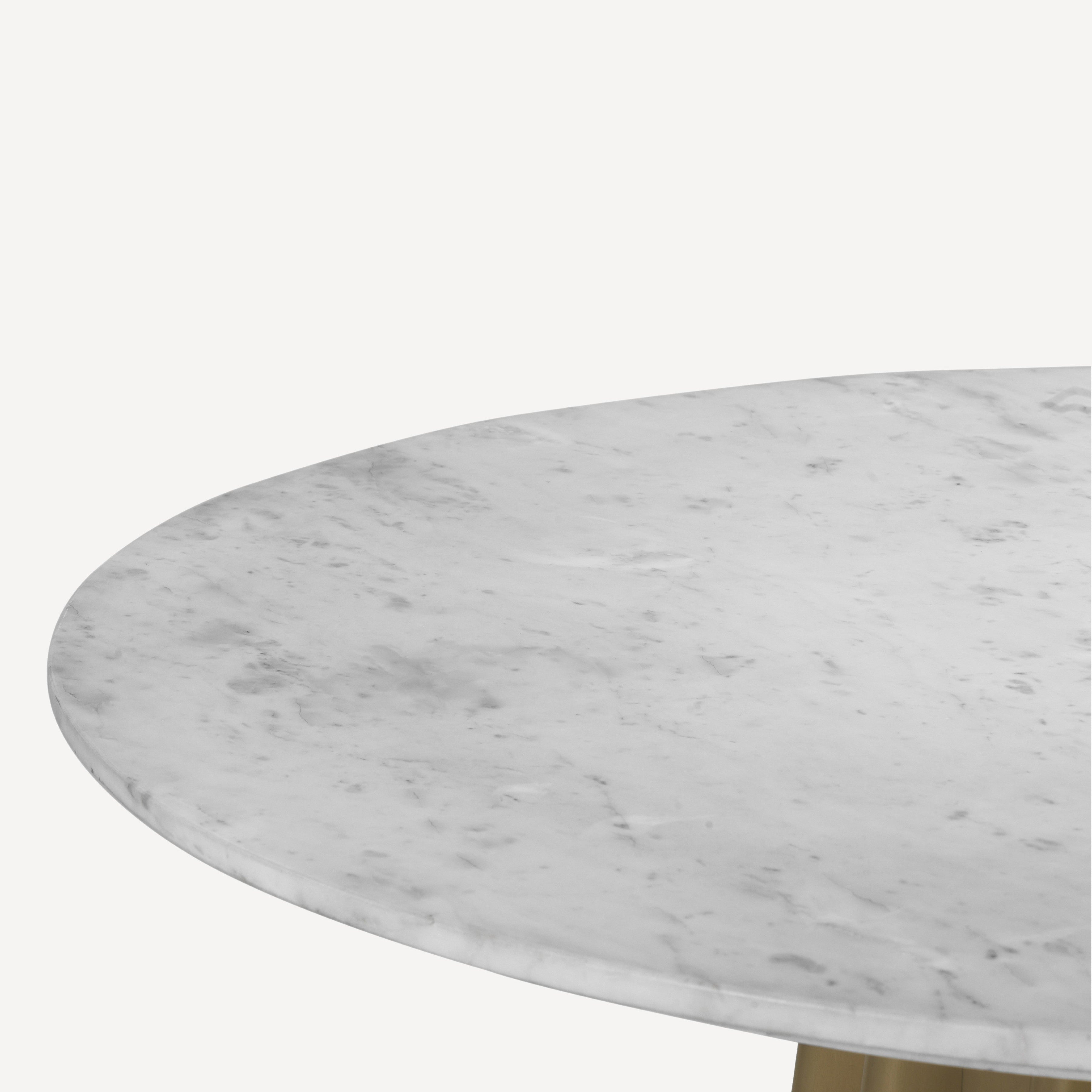 The Shorefront table features a white Banswara marble tabletop supported by a mild steel base with a warm antique brass finish. This combination of materials creates a sophisticated and timeless centerpiece for your living or dining space.