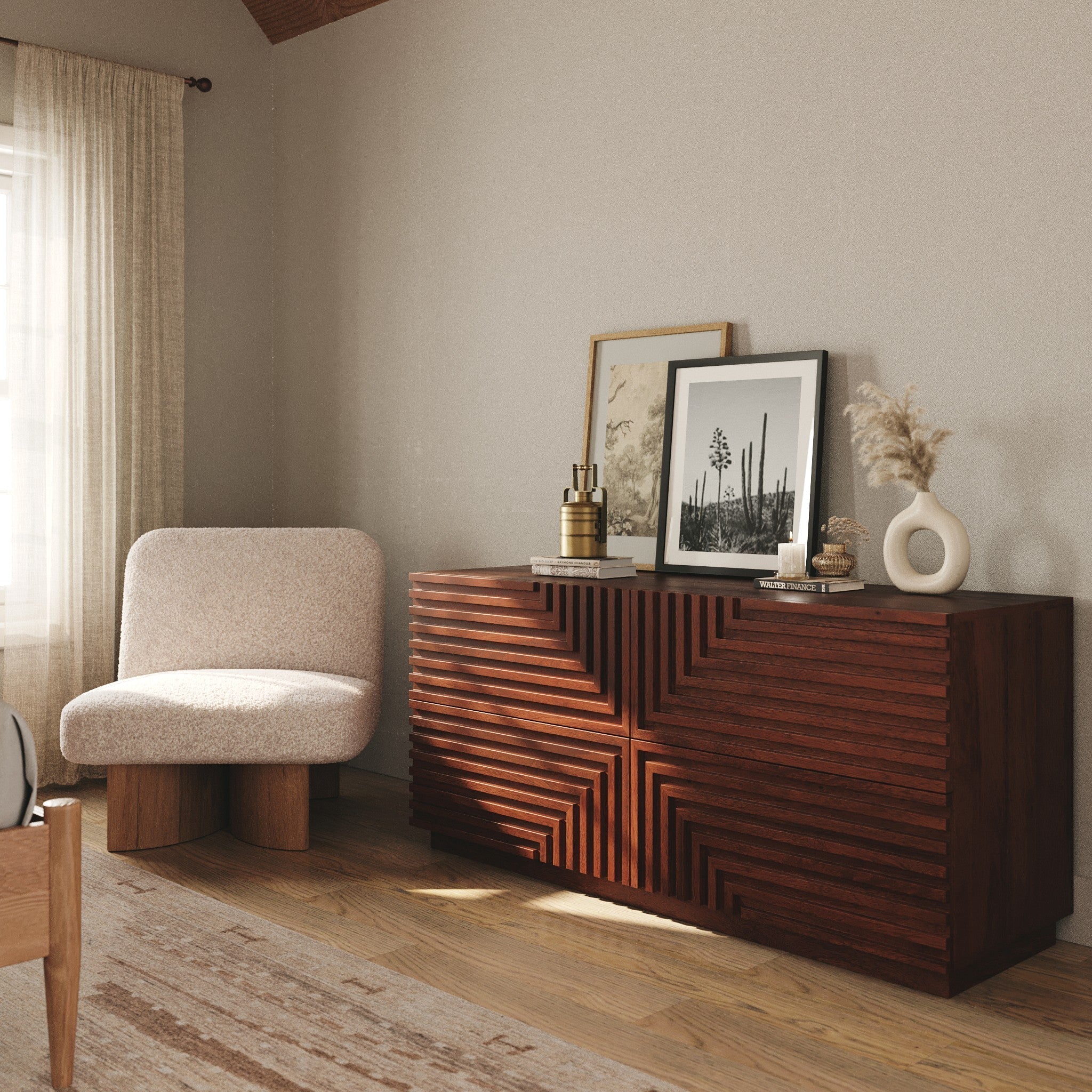The Maze low dresser features perfectly aligned geometric patterning on the four drawer fronts, creating a pleasing visual texture. Crafted from plantation grown hardwoods, it combines durability with elegant design for any living space.