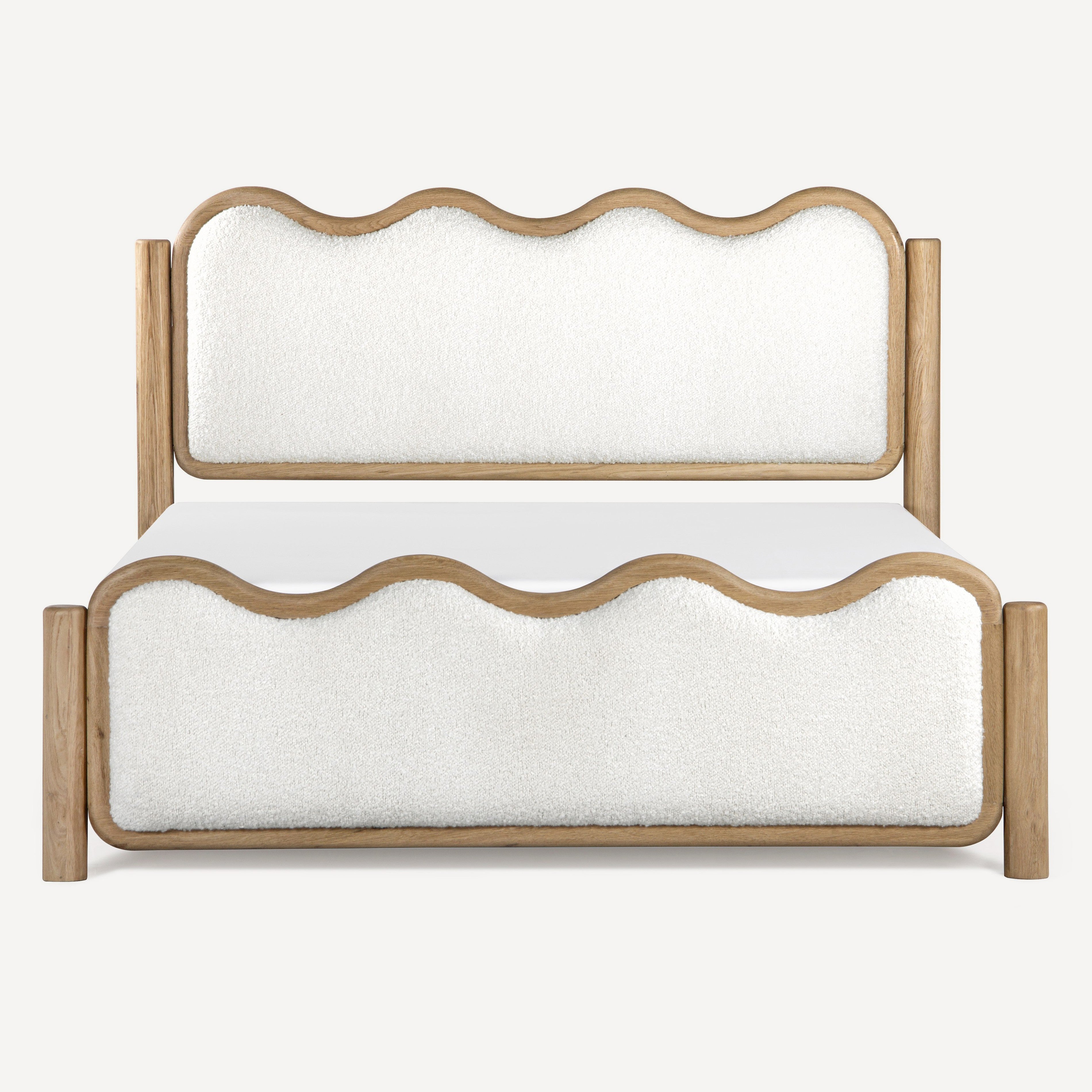 Dynamic in form, our Swirl bed will add a touch of whimsy to your bedroom. A solid, FSC-certified Oak surround frames a soft, upholstered boucle head and footboard with a soft, wavy edge.