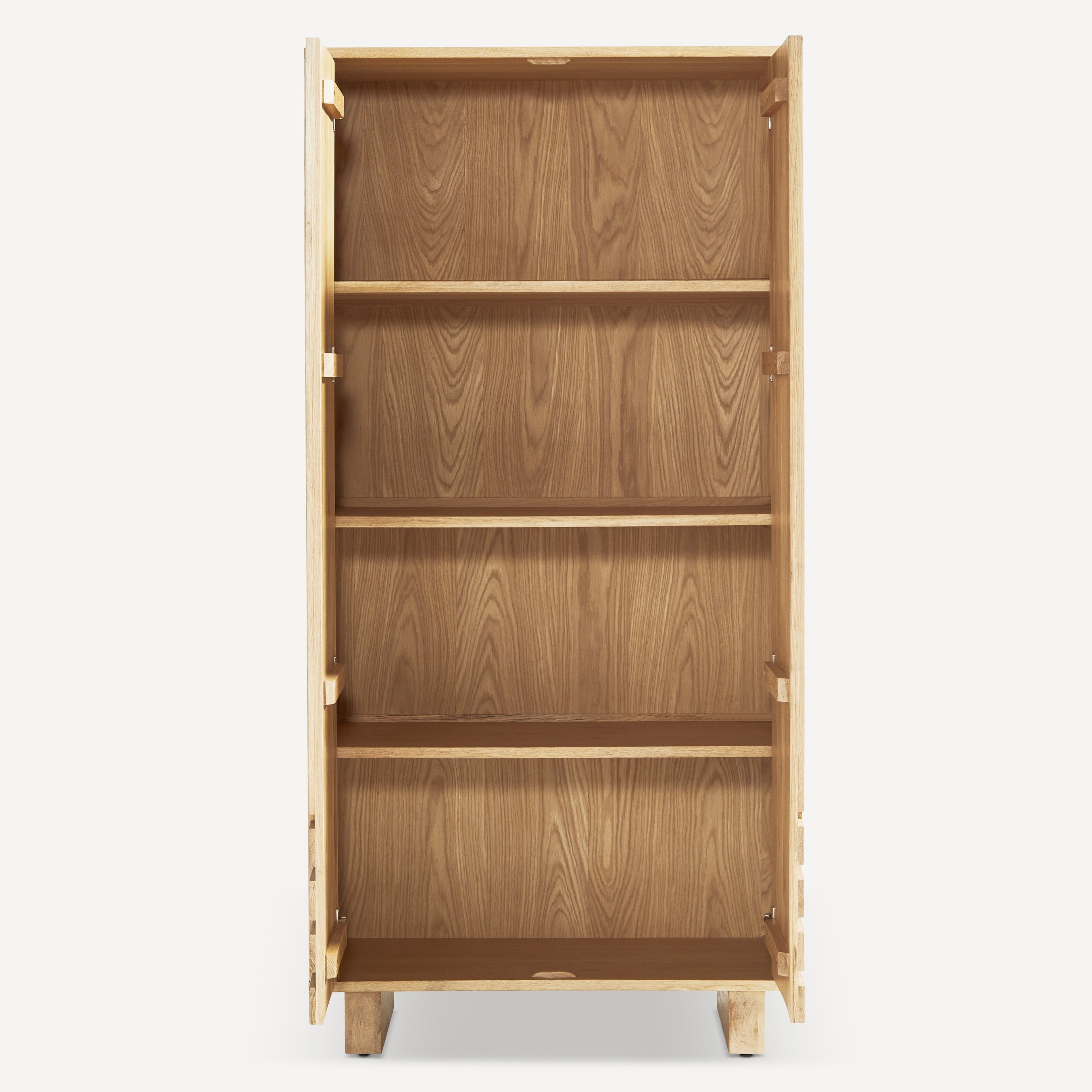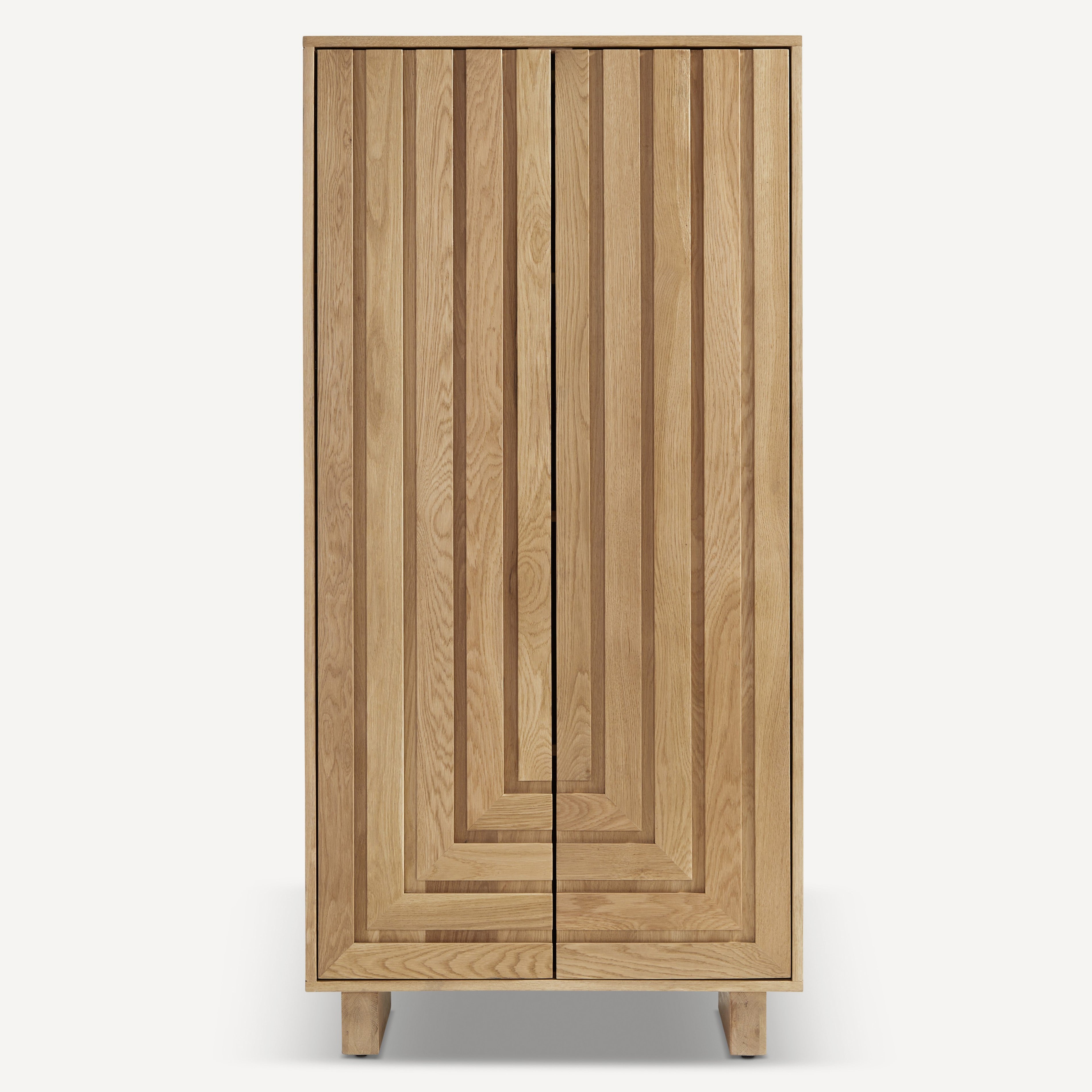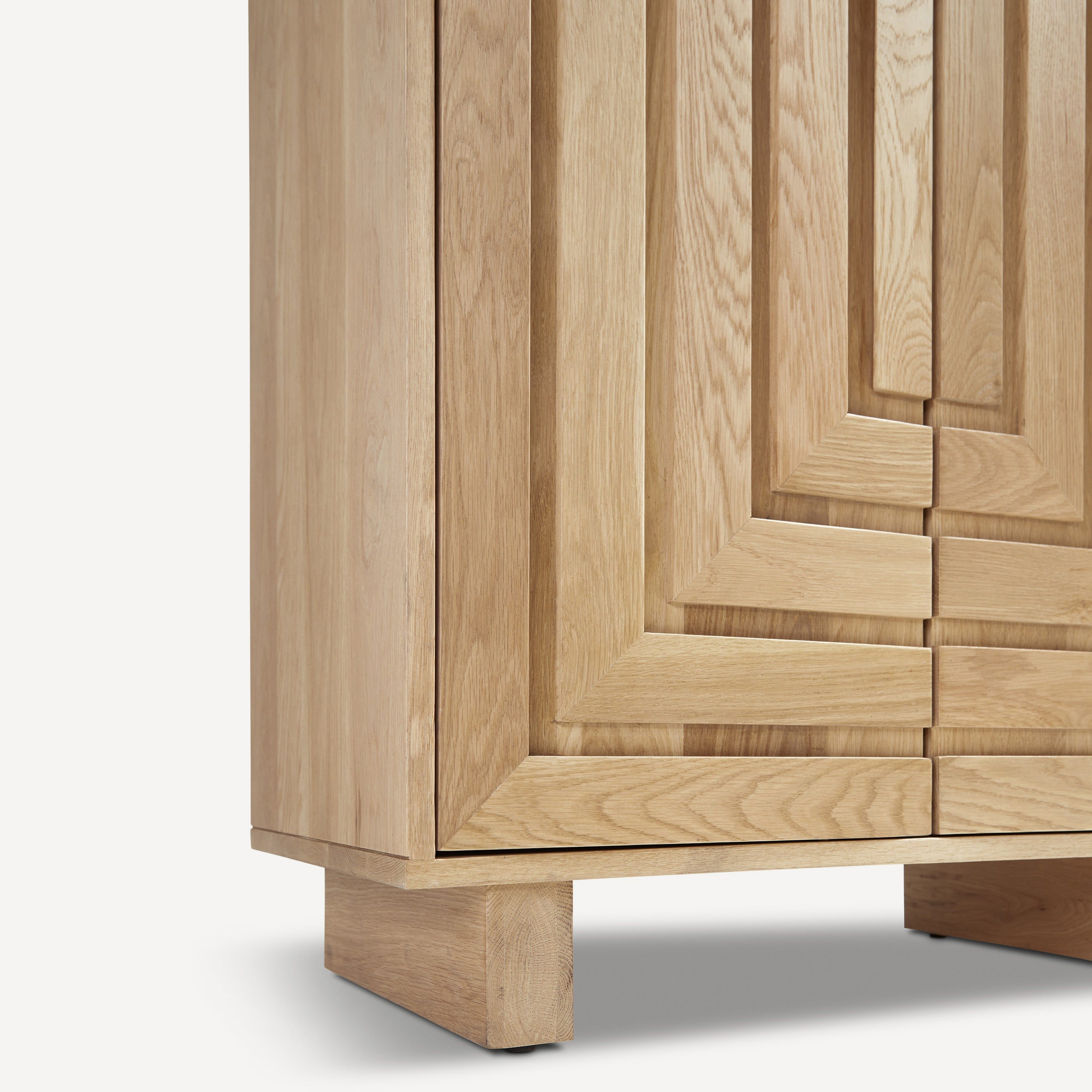 Beautifully grained FSC certified solid oak is crafted to create an intricate geometric pattern on the doors of the striking Array large cabinet. Two doors open to reveal a generous storage compartment with adjustable shelving, offering both style and functionality. This cabinet creates an instant visual impact in any living space while providing durable long lasting performance through its natural wood construction and refined craftsmanship.