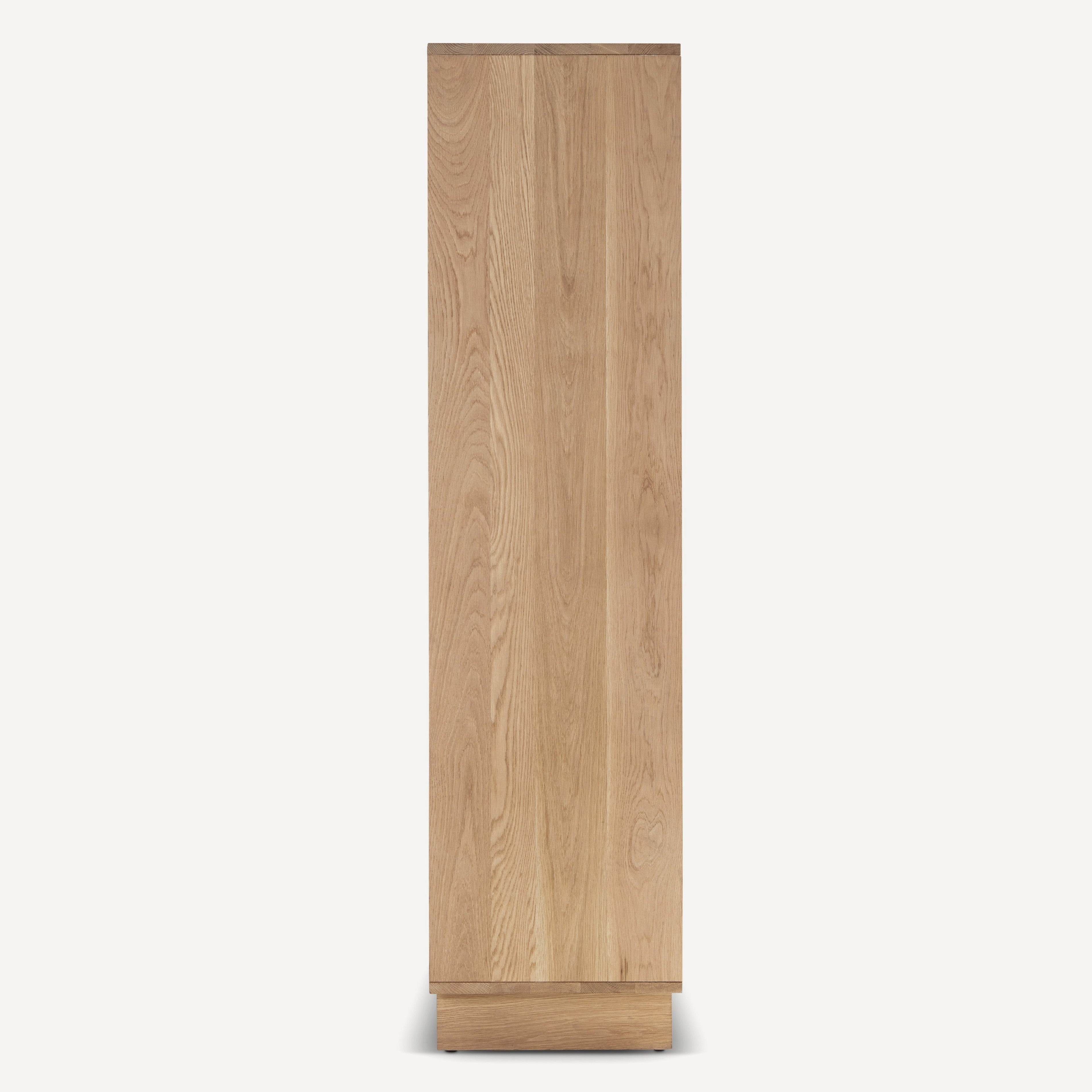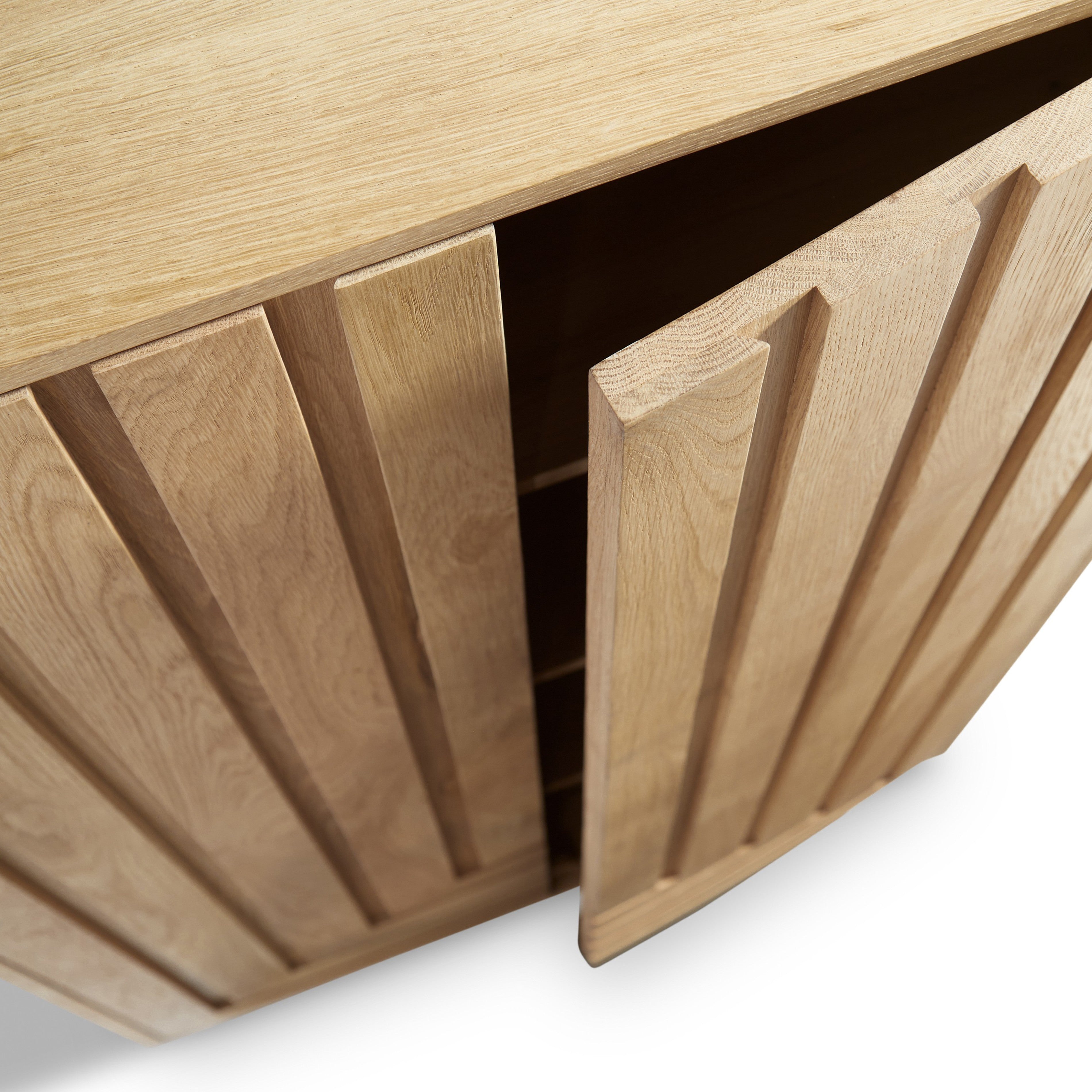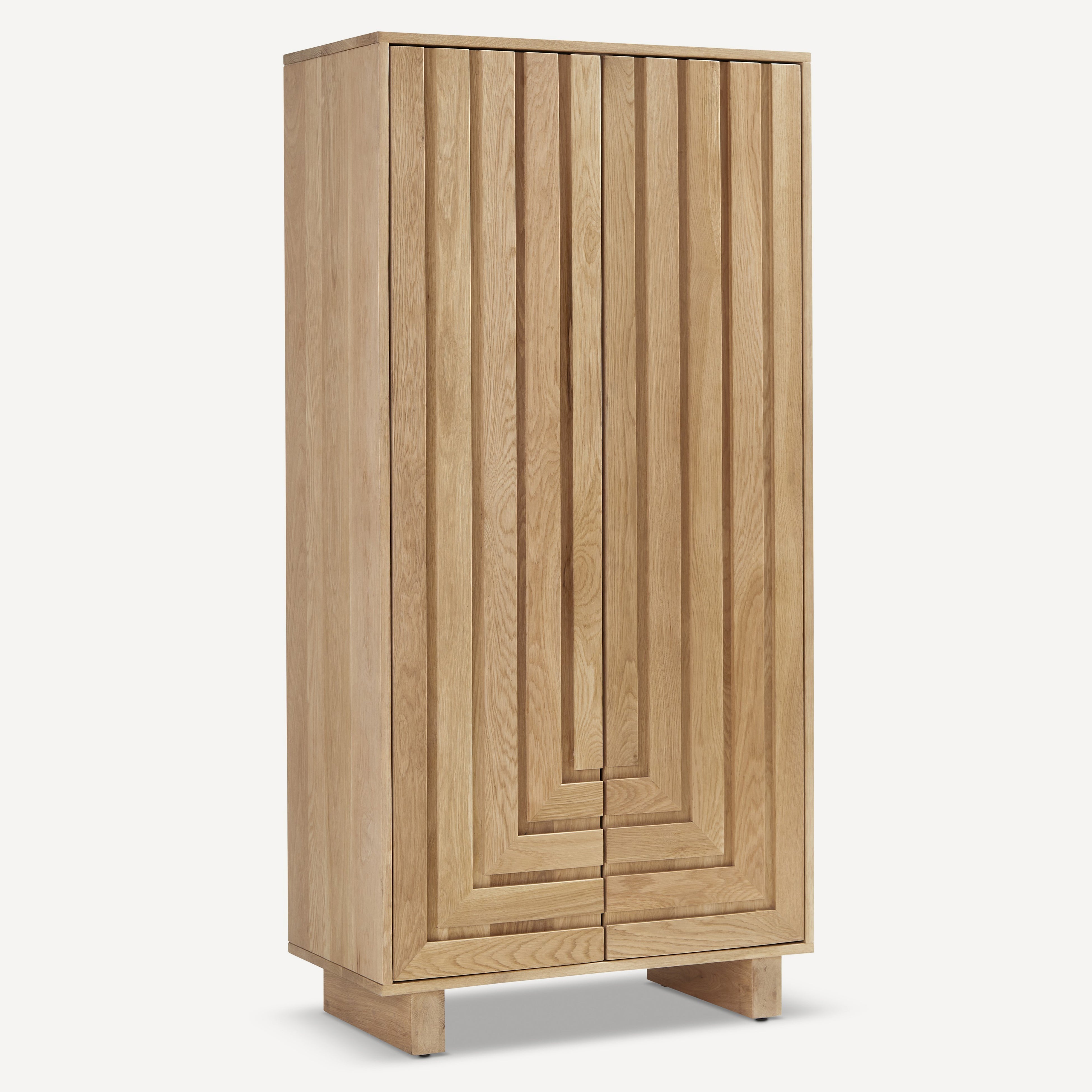 Beautifully grained FSC certified solid oak is crafted to create an intricate geometric pattern on the doors of the striking Array large cabinet. Two doors open to reveal a generous storage compartment with adjustable shelving, offering both style and functionality. This cabinet creates an instant visual impact in any living space while providing durable long lasting performance through its natural wood construction and refined craftsmanship.