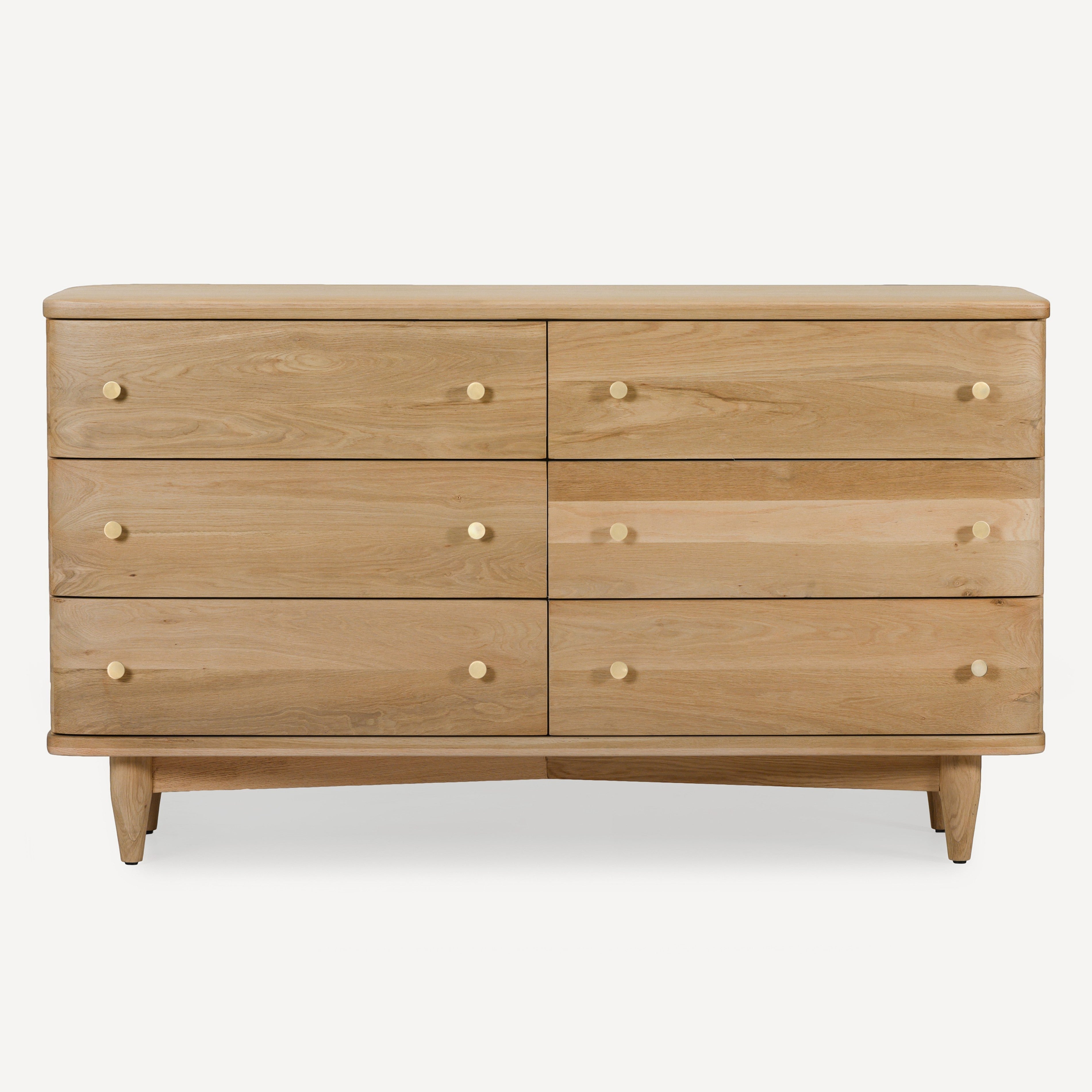 Our Daniel dresser is a dramatic addition to any bedroom space. Crafted from FSC certified Oak Wood, the dresser features a sculptured profile with soft edges. The textured surface is sealed with a water based finish to highlight the natural beauty of the wood grain. Six generously sized drawers open smoothly to provide ample space for storage while maintaining a sleek and elegant look.