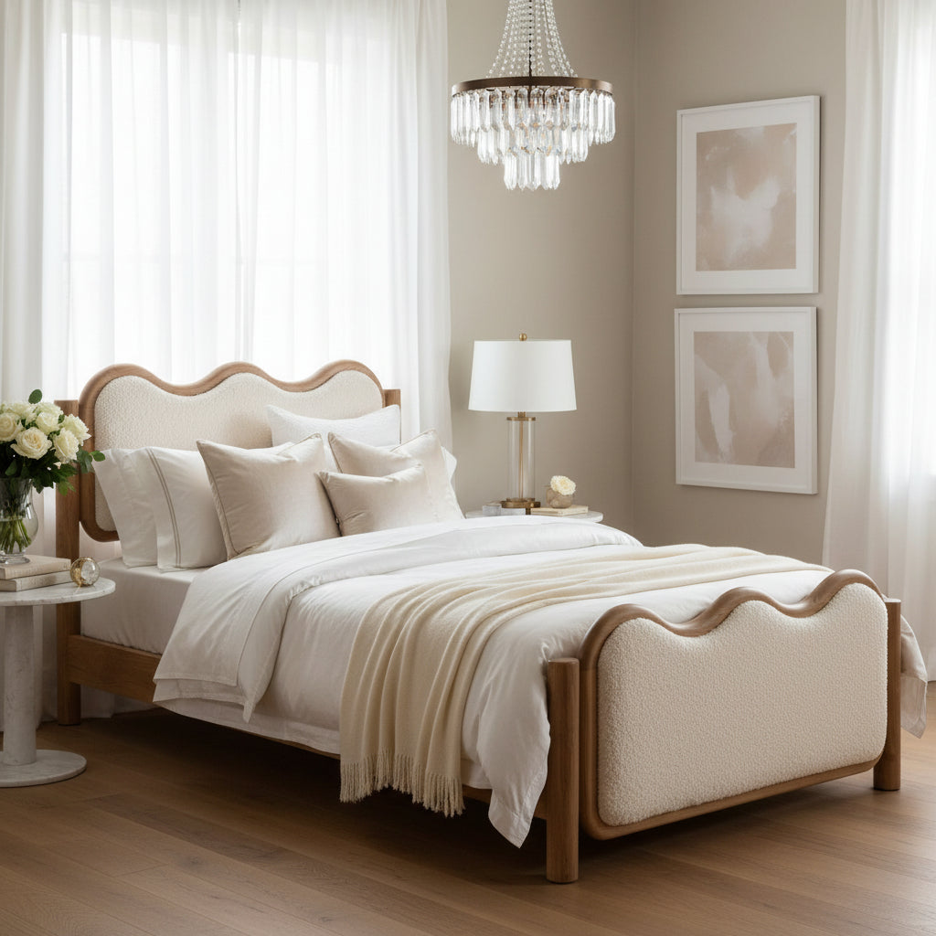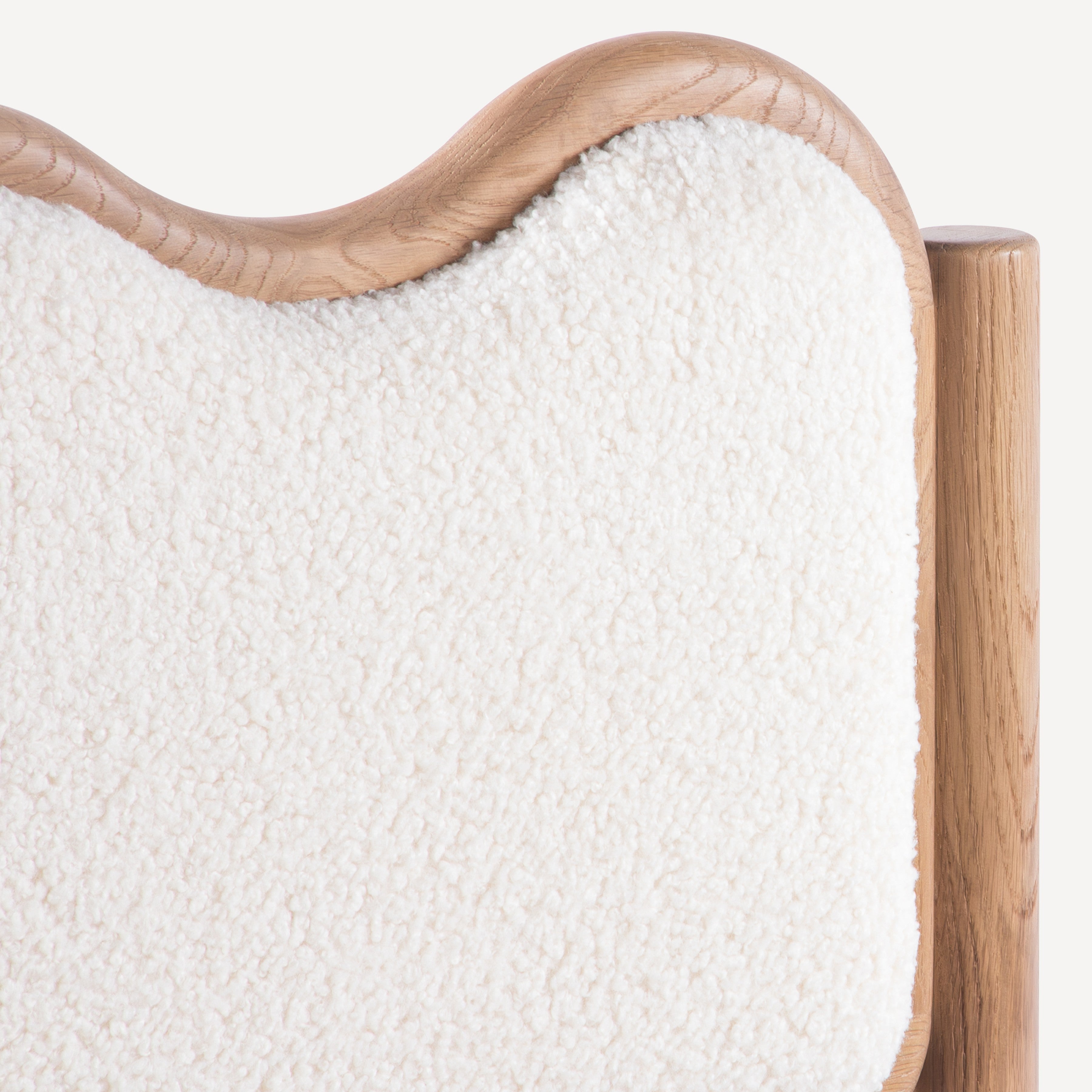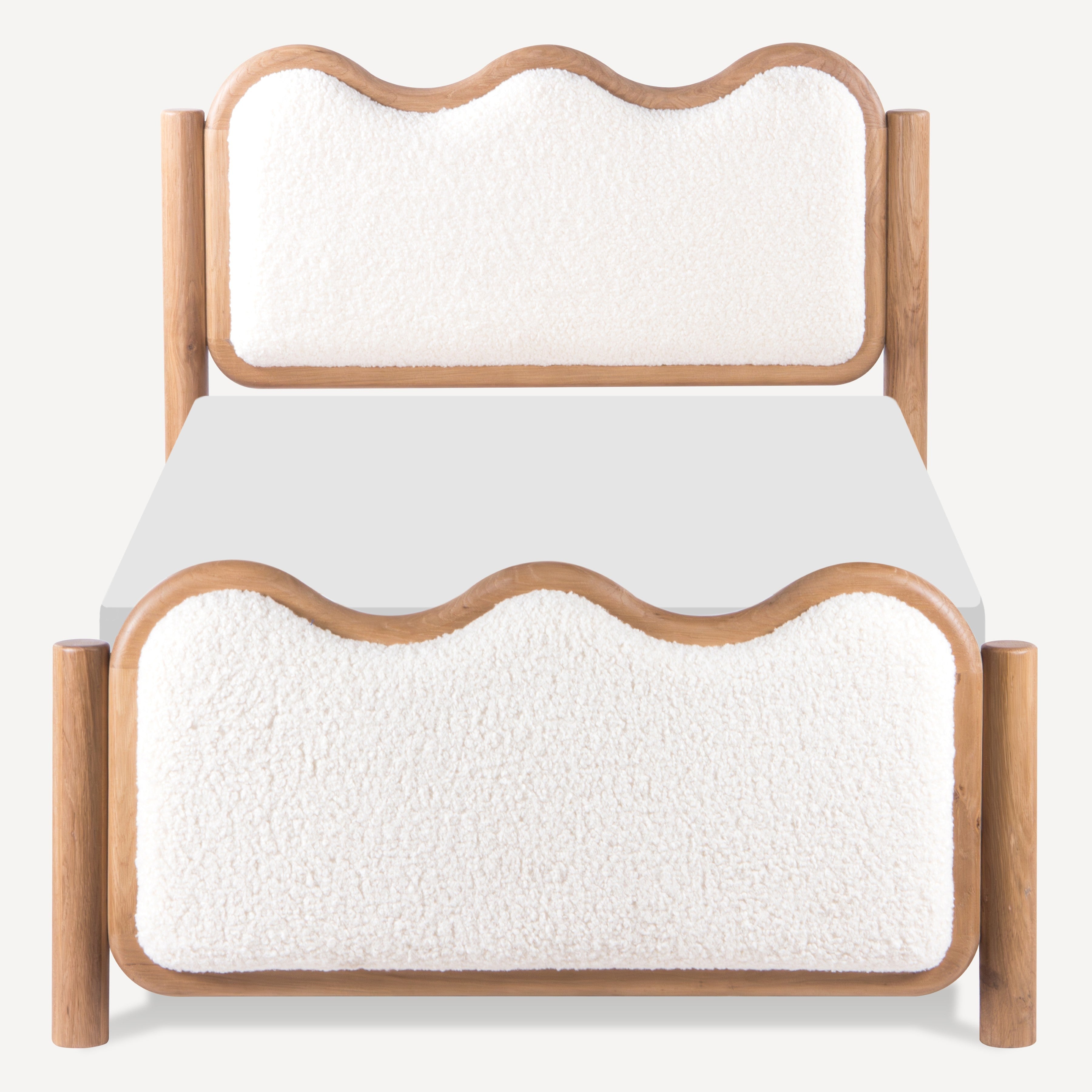 Dynamic in form, our Swirl bed will add a touch of whimsy to your bedroom. A solid, FSC-certified Oak surround frames a soft, upholstered boucle head and footboard with a soft, wavy edge.