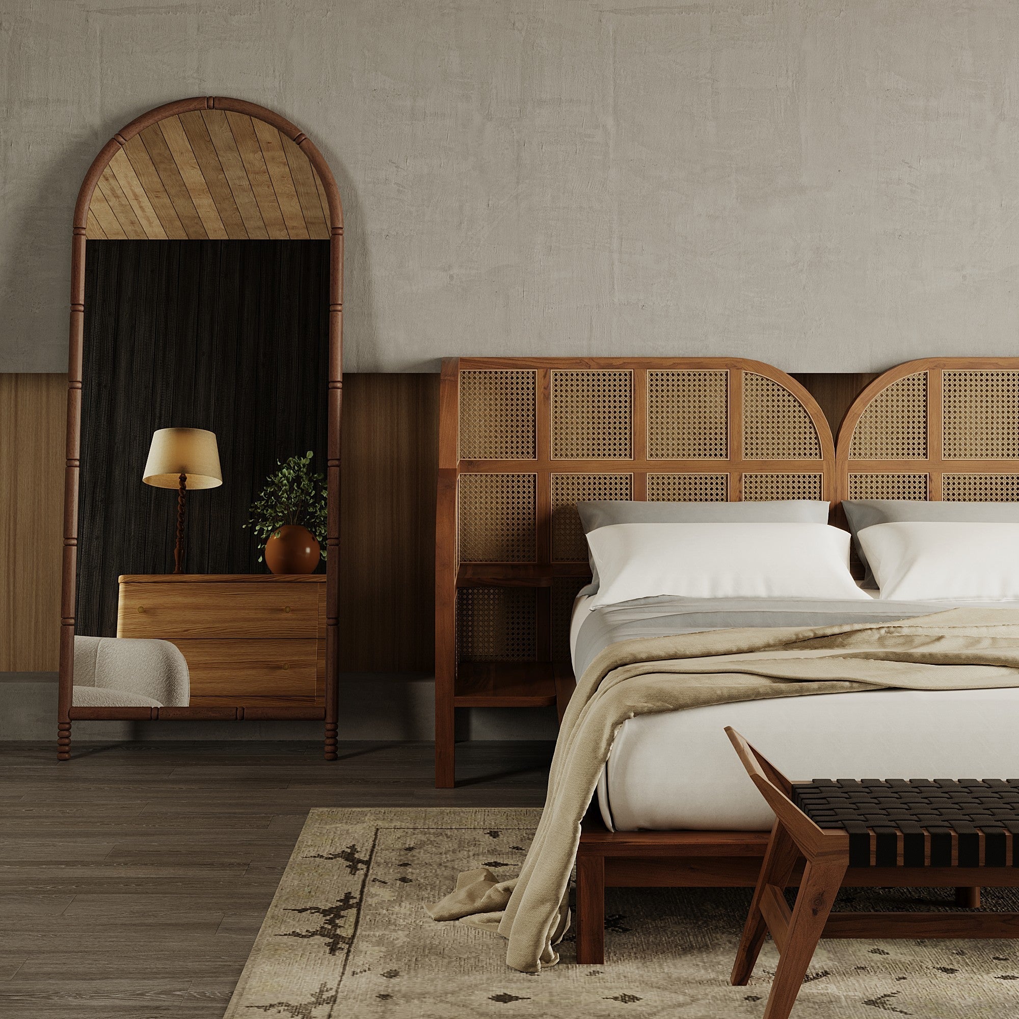 Inspired by the popular Nest Daybed, the Nest Bed is designed to create an exotic retreat for rest and relaxation. A solid recycled Teak frame supports and surrounds the bed, complemented by hand-woven inset cane panels that add warmth, texture, and natural charm. Each side of the bed features two integrated storage shelves, allowing them to function as built-in nightstands for added convenience and space efficiency. Crafted with FSC Certified Recycled Teak and finished in Porto Natural, this bed combines sustainability, durability, and timeless design to elevate any bedroom.